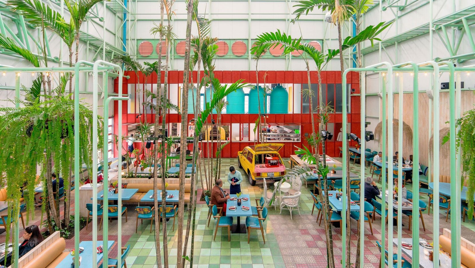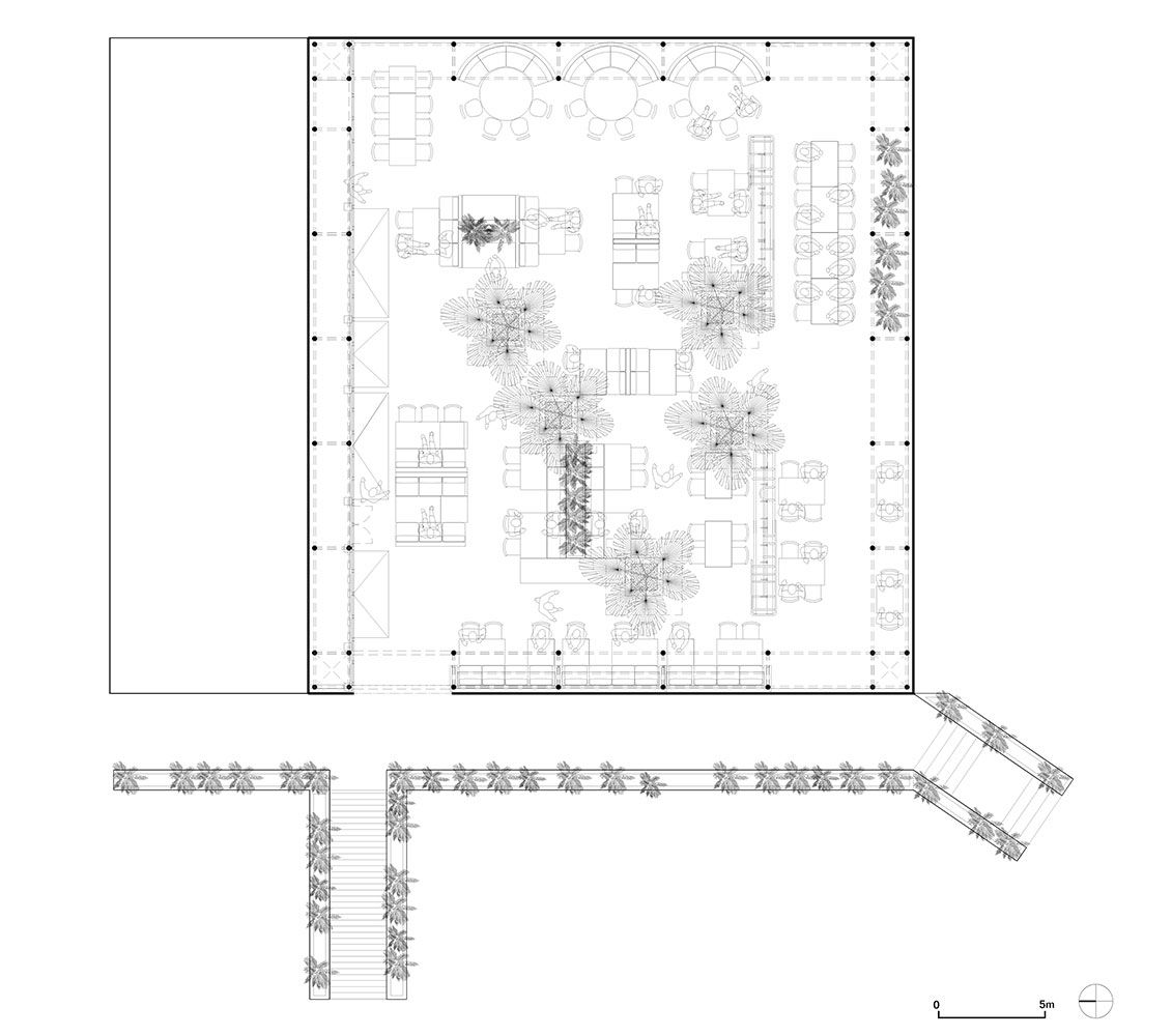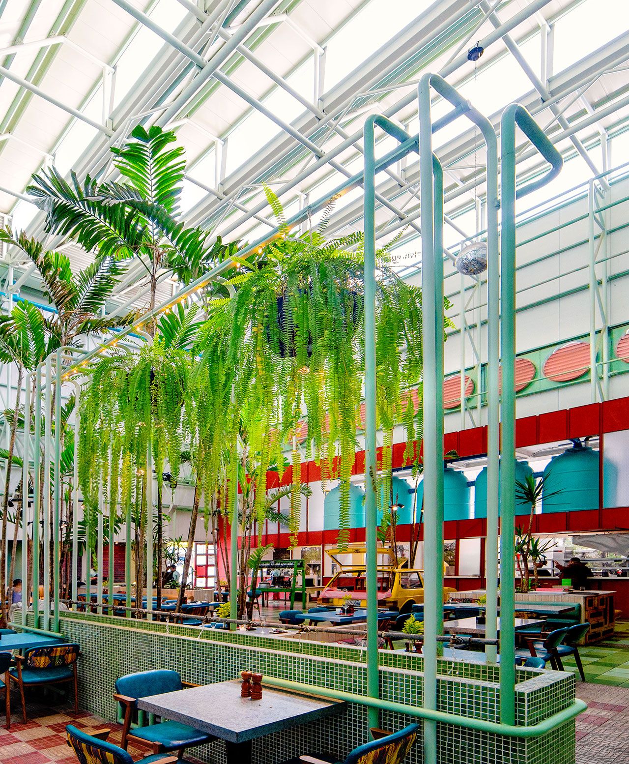 The sustainable approach to the interior is forward thinking about both technical elements, but also about blending the constructed environment with the natural. The use of natural planting throughout the project, which includes palm trees of five meters and Musgo (or Spanish Moss) draped lights, is complimented by the cool tone of the vertical exposed structural and plumbing elements. This produces a kind of heightened sense of nature- nature curated like a garden- the space is straightforward and efficient like an industrial warehouse or factory but also made imperfect by the incorporation of furniture and other design elements.