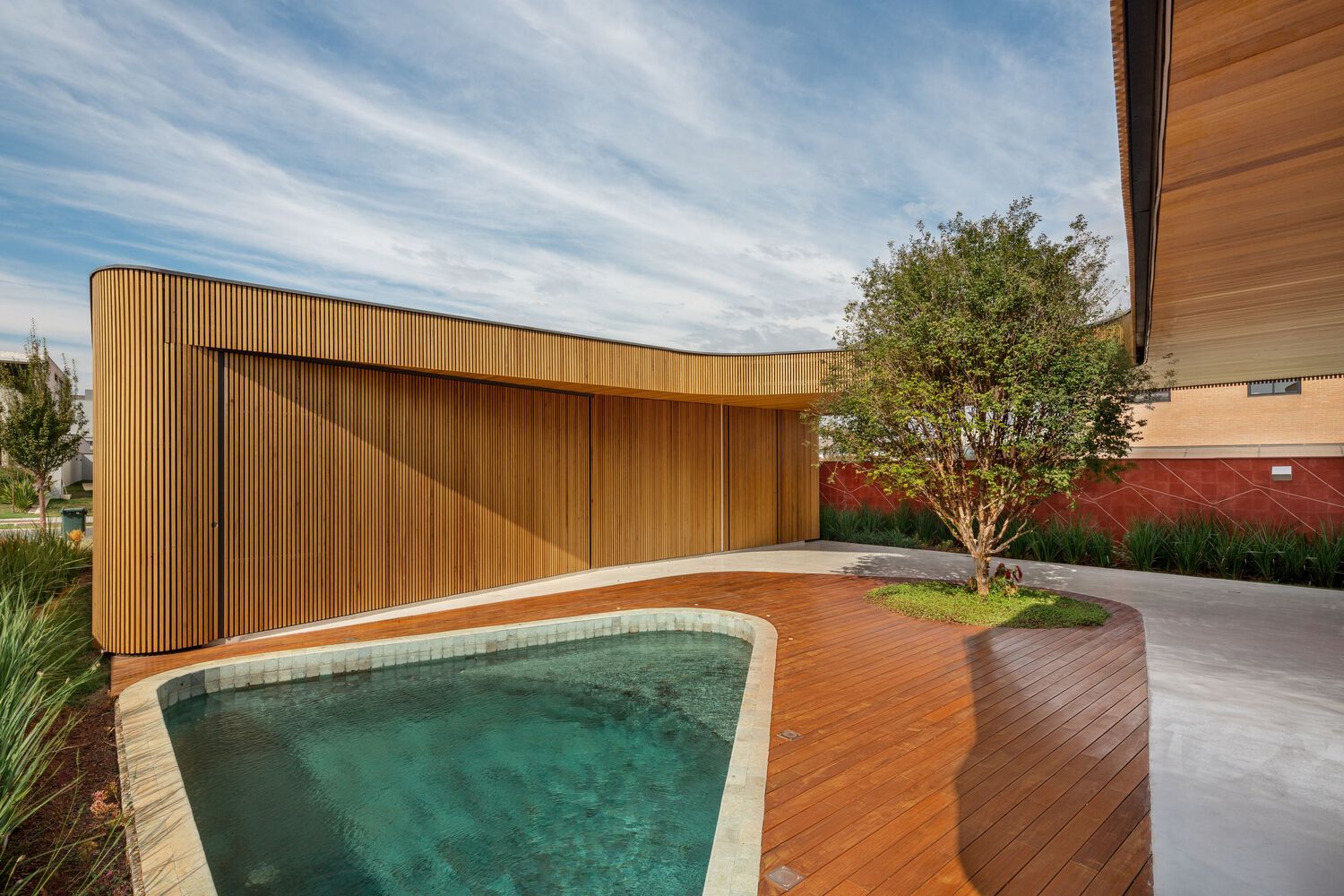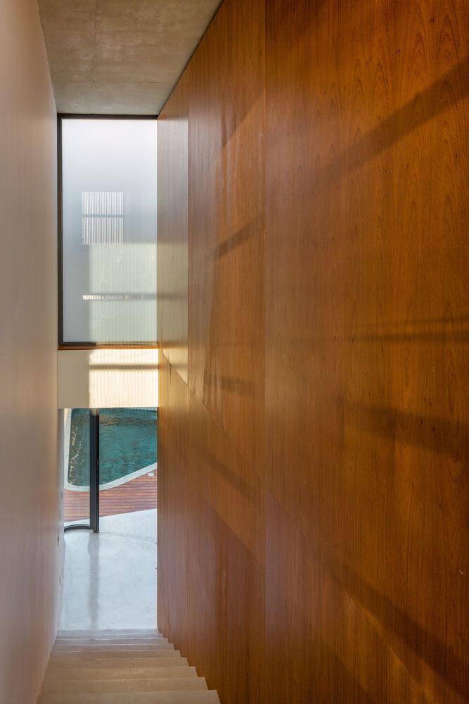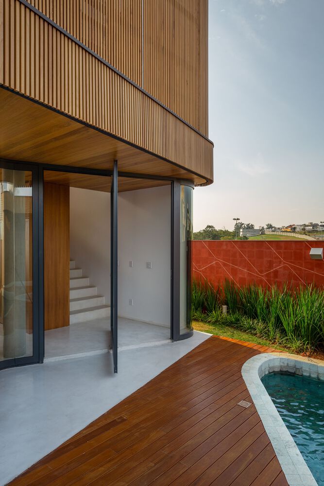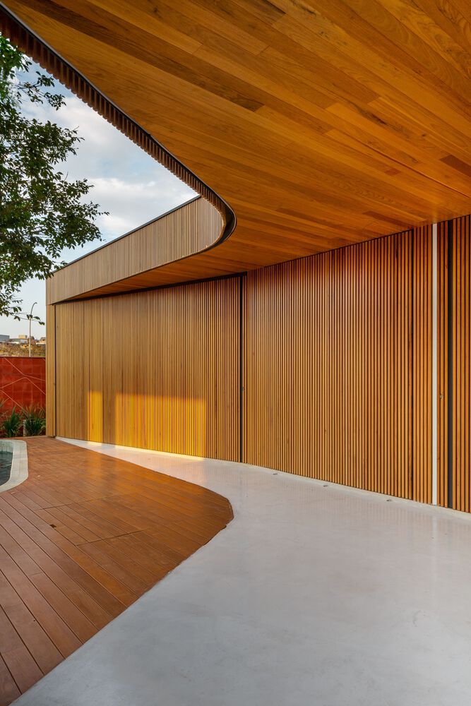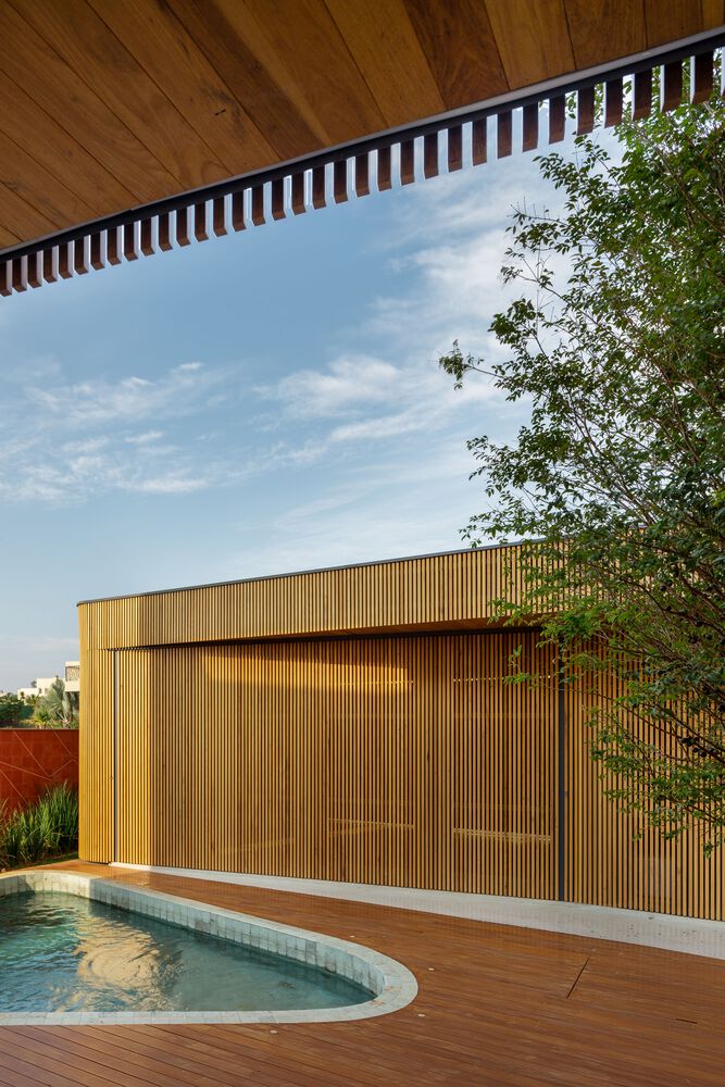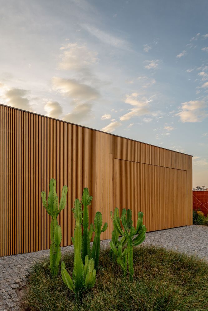 Mandacaru House is a canvas brought to life with three primary materials, each playing a distinct role in the composition. The wooden brise, like a loving guardian, envelops the front volume and the second floor of the back volume, imparting both privacy and delicate control over the play of light within the rooms.