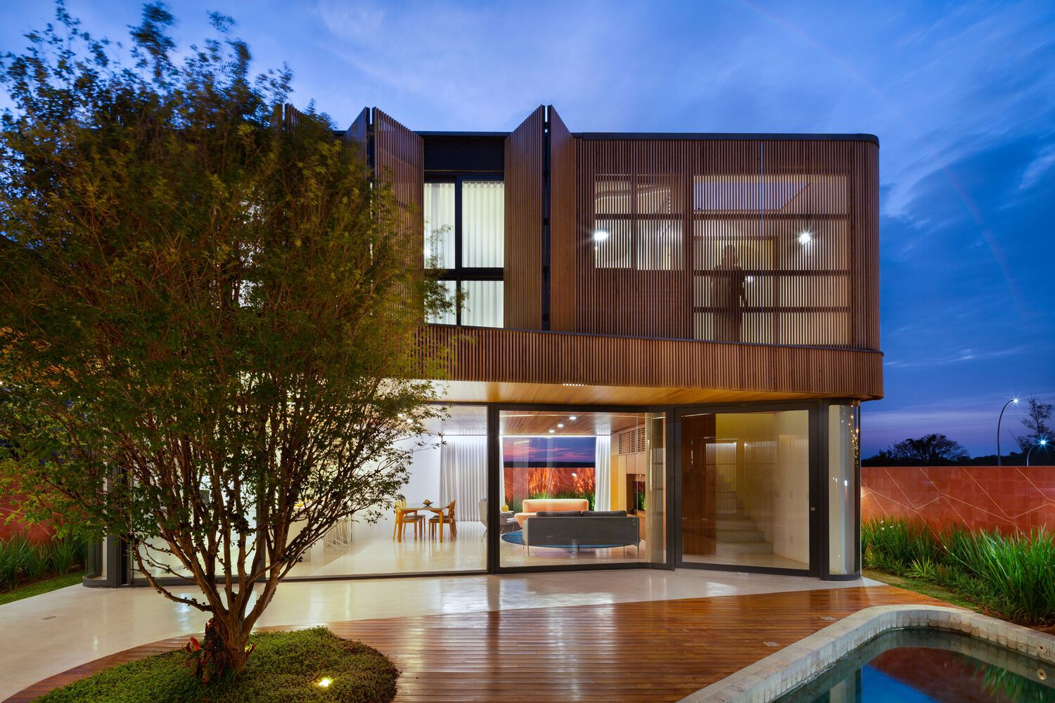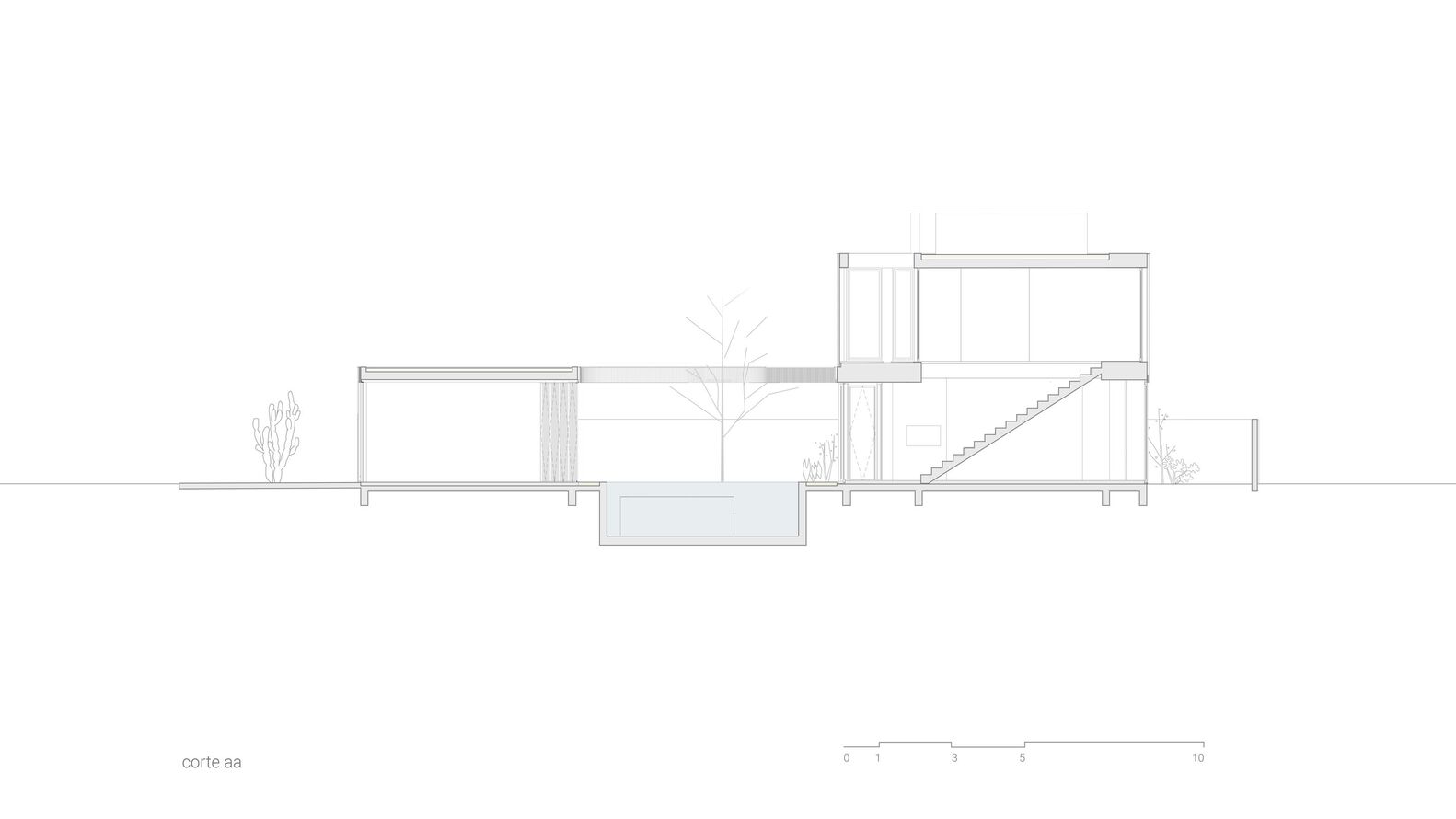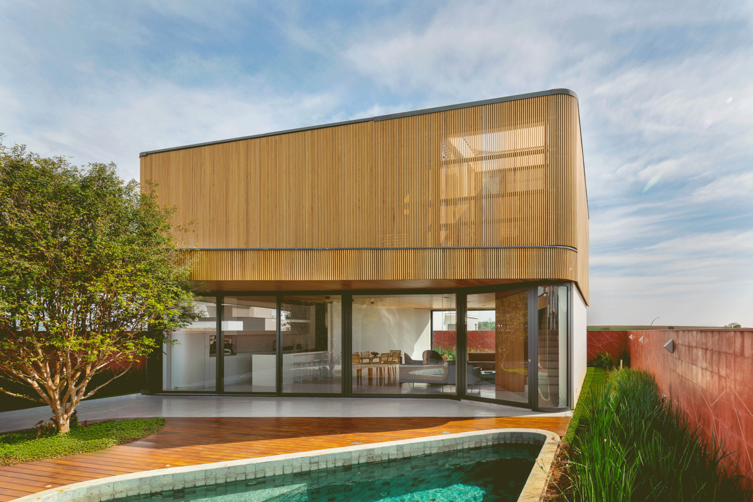 Mandacaru House is a canvas brought to life with three primary materials, each playing a distinct role in the composition. The wooden brise, like a loving guardian, envelops the front volume and the second floor of the back volume, imparting both privacy and delicate control over the play of light within the rooms.
