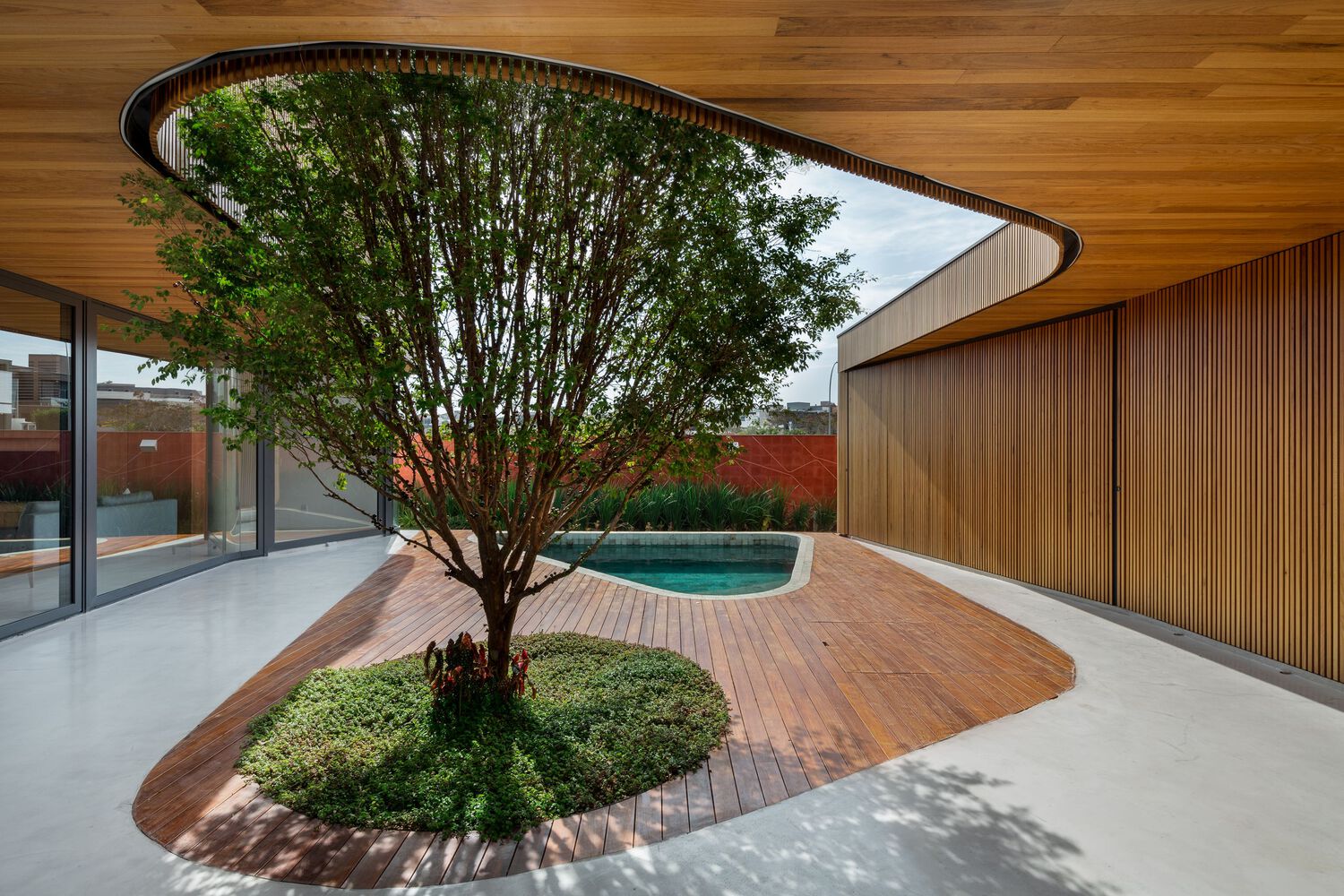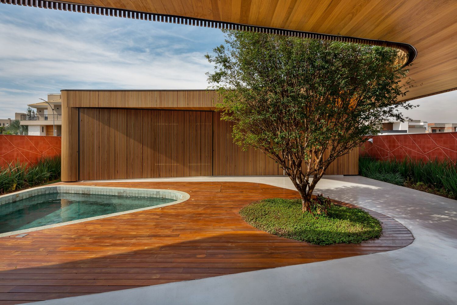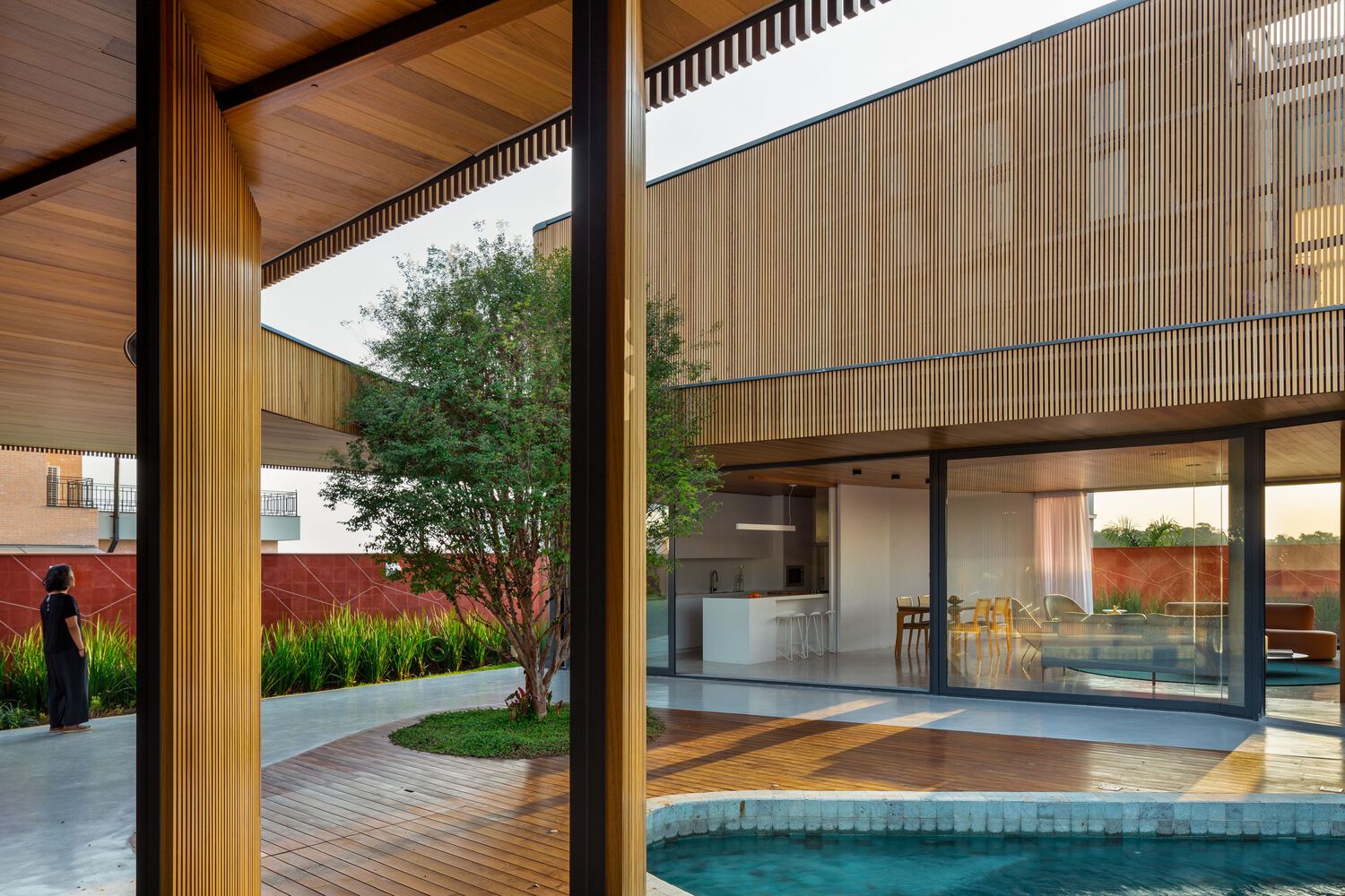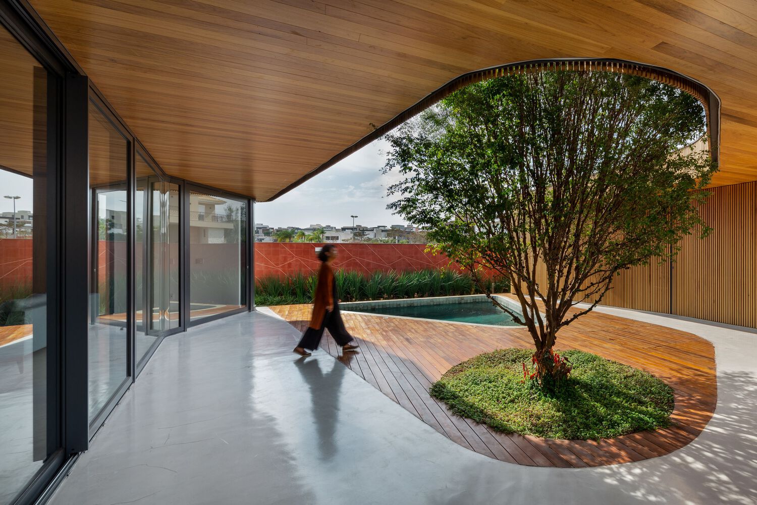 Connecting these two volumes with a gentle curve, a grand marquee unfurls its protective wings, gracing the central courtyard with its presence. This majestic canopy not only shelters the outdoor spaces but also enfolds within its care the shimmering pool, a center of joy and relaxation, and the revered jabuticaba tree—an essential element that adds a touch of nature’s grace to the composition.
