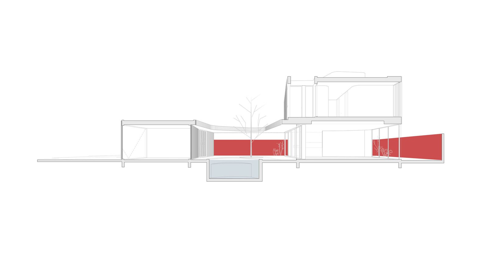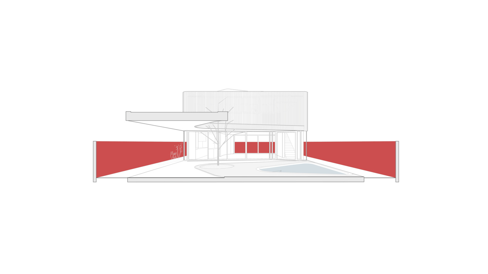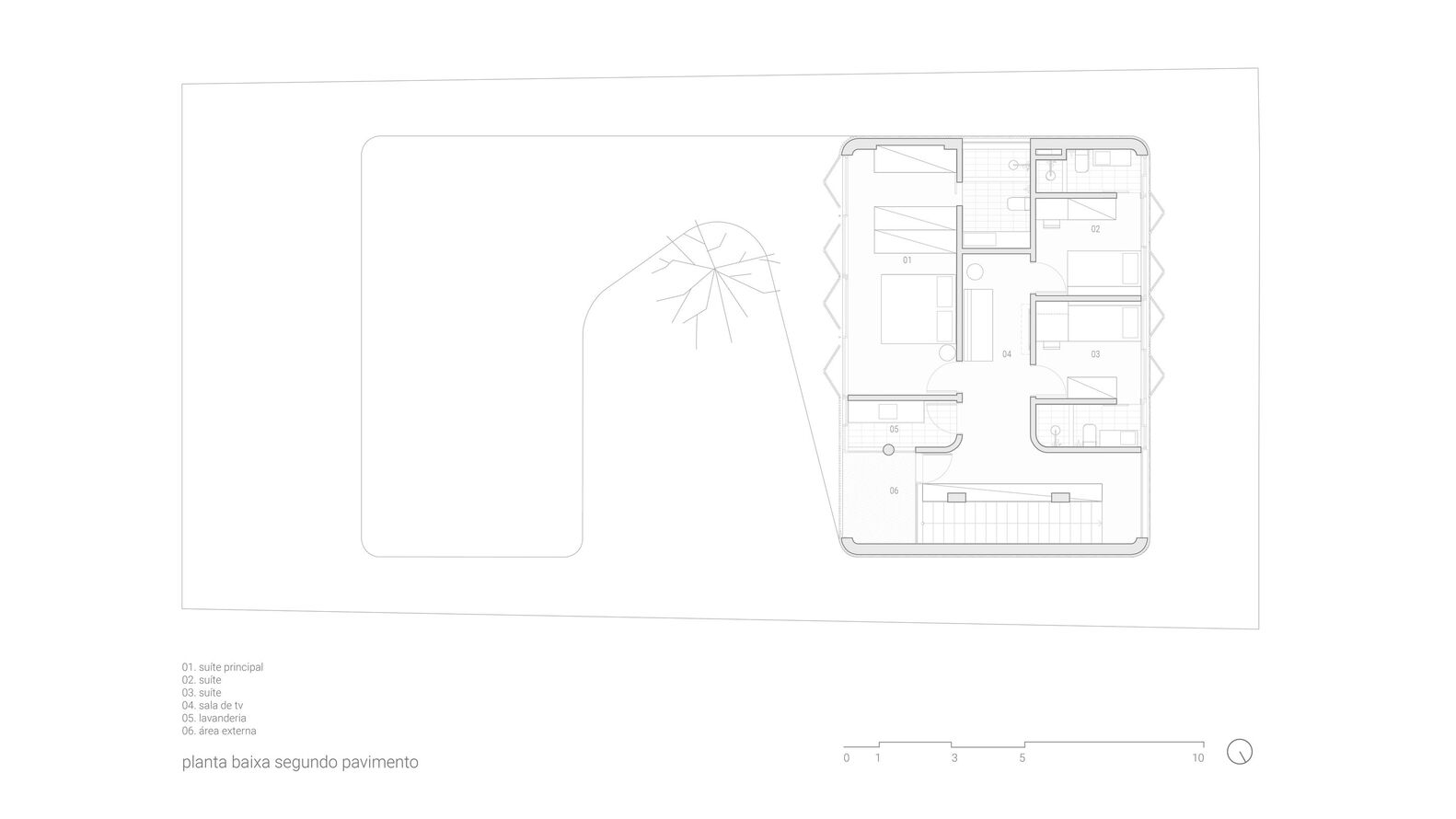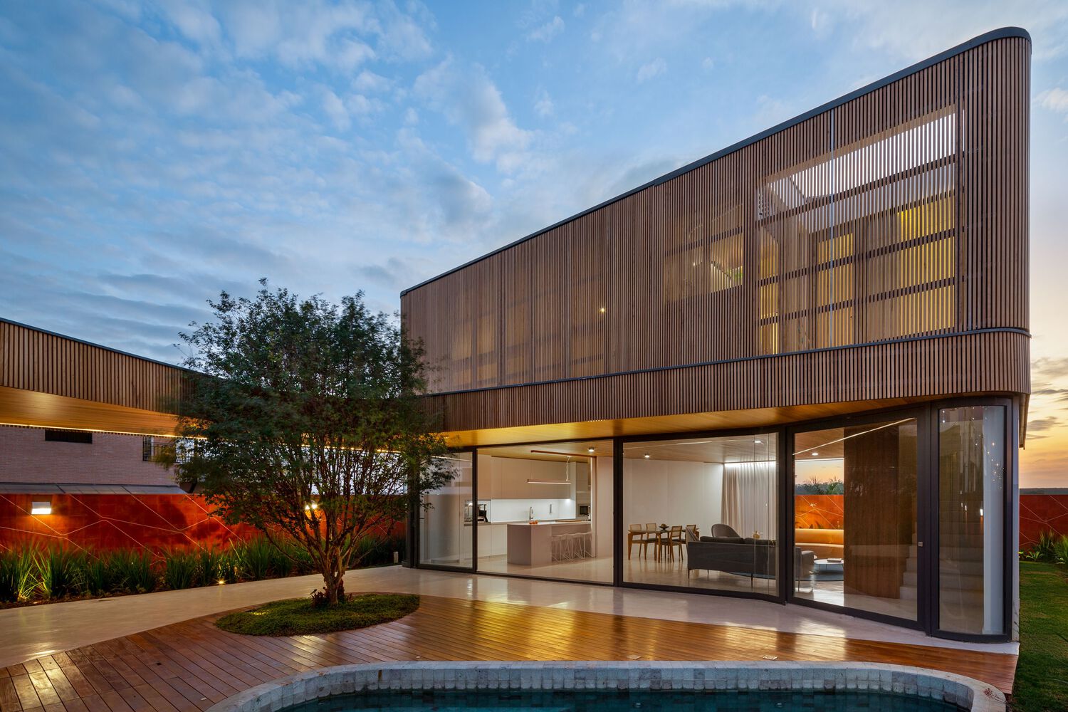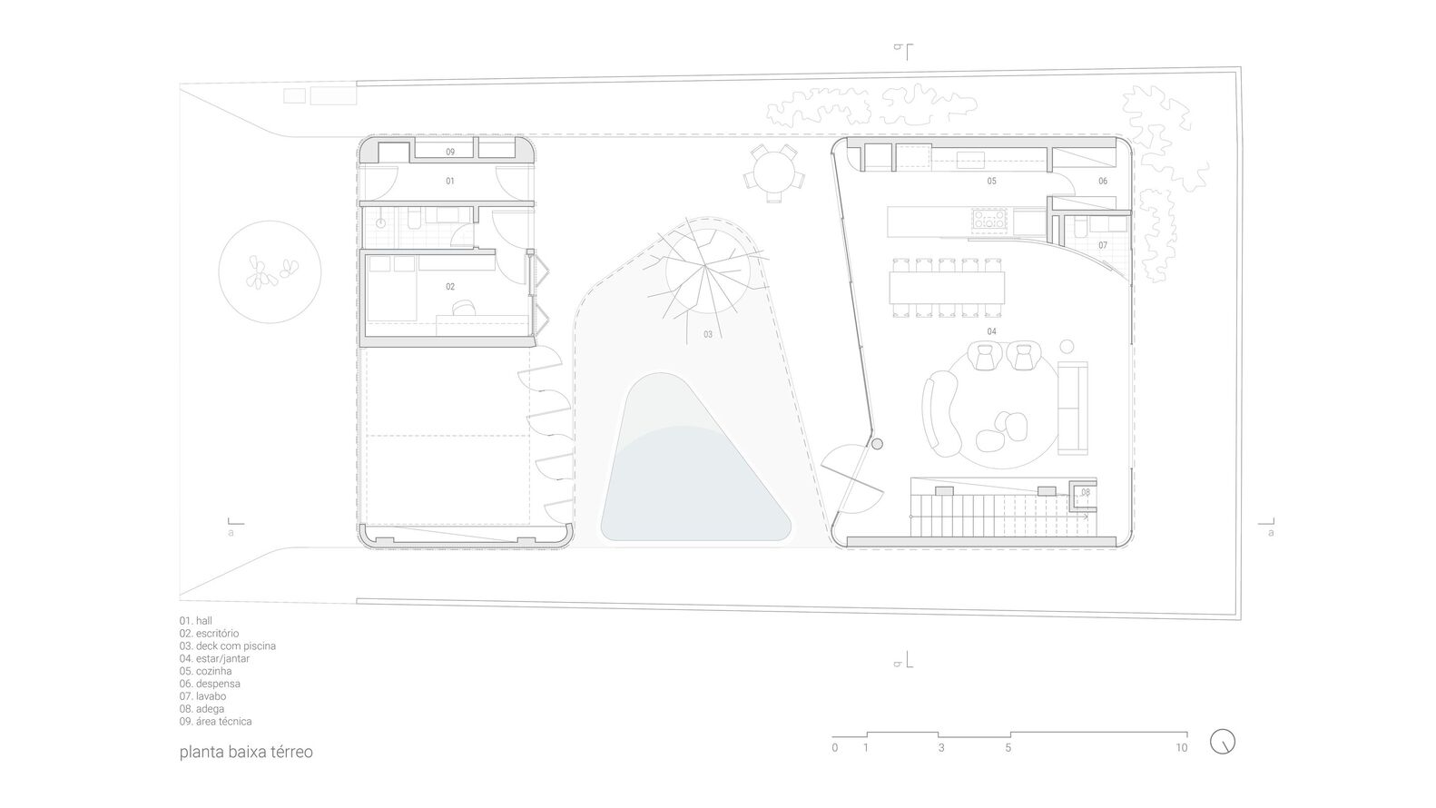 Connecting these two volumes with a gentle curve, a grand marquee unfurls its protective wings, gracing the central courtyard with its presence. This majestic canopy not only shelters the outdoor spaces but also enfolds within its care the shimmering pool, a center of joy and relaxation, and the revered jabuticaba tree—an essential element that adds a touch of nature’s grace to the composition.