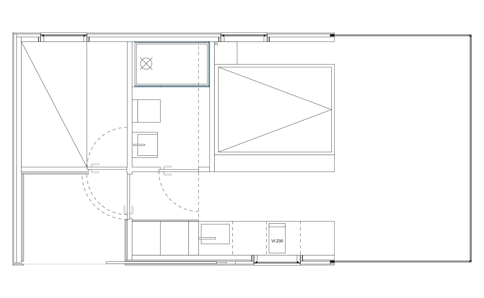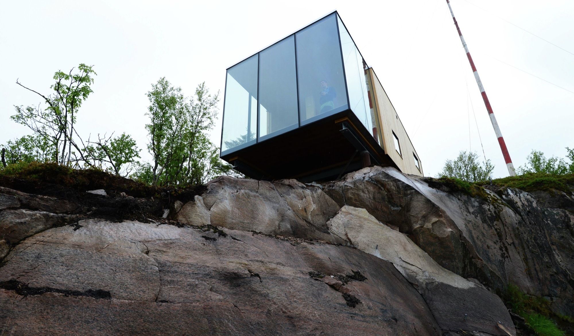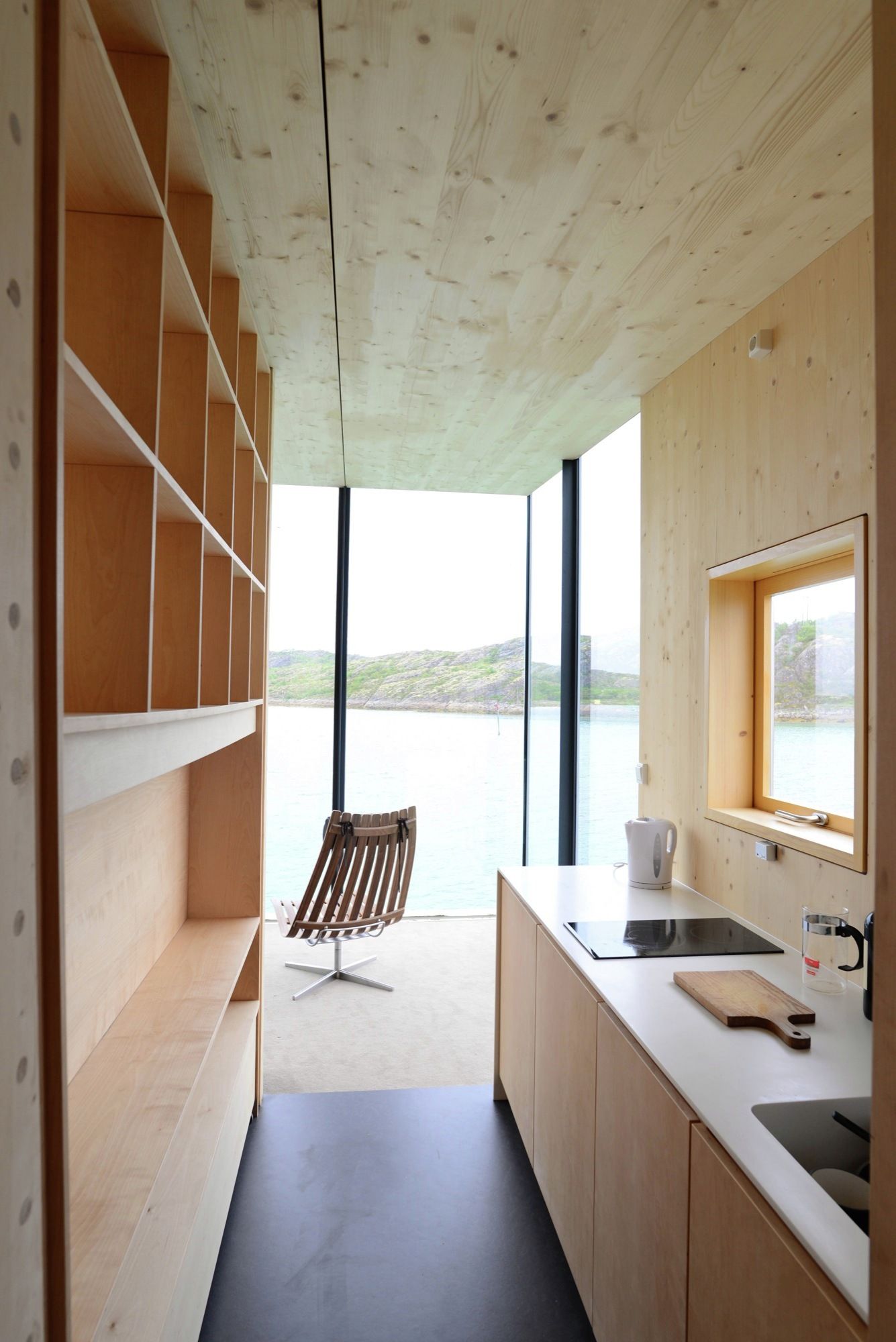 The cabins are designed to offer their guests shelter and comfort while at the same time underlining the dramatic experience of the elements outside; the sea, landscape, changing lights, weather and different seasons. Above all the cabins endeavor to fulfill the functional requirements of the guests, with ample space for luggage and clothing/equipment, a comfortable bathroom and a kitchen/dining area. The cabins accommodate two to four people or a family of five. The main bed is positioned in the main room, slightly withdrawn from the floor to ceiling glasses, to enable the visitor an around the clock experience of the outside elements, while still being comfortably sheltered.