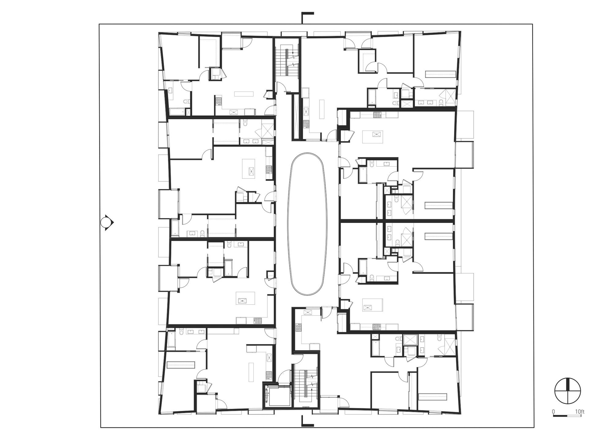 Balconies and window frames project outward to recapture the space between the new geometry and the property edge. Due to the building’s curves, LOHA offers each balcony a unique depth and view. The white skin, reinforcing the purity of the structure’s form, is broken by a rhythm of select black treatment to the protruding boxes.