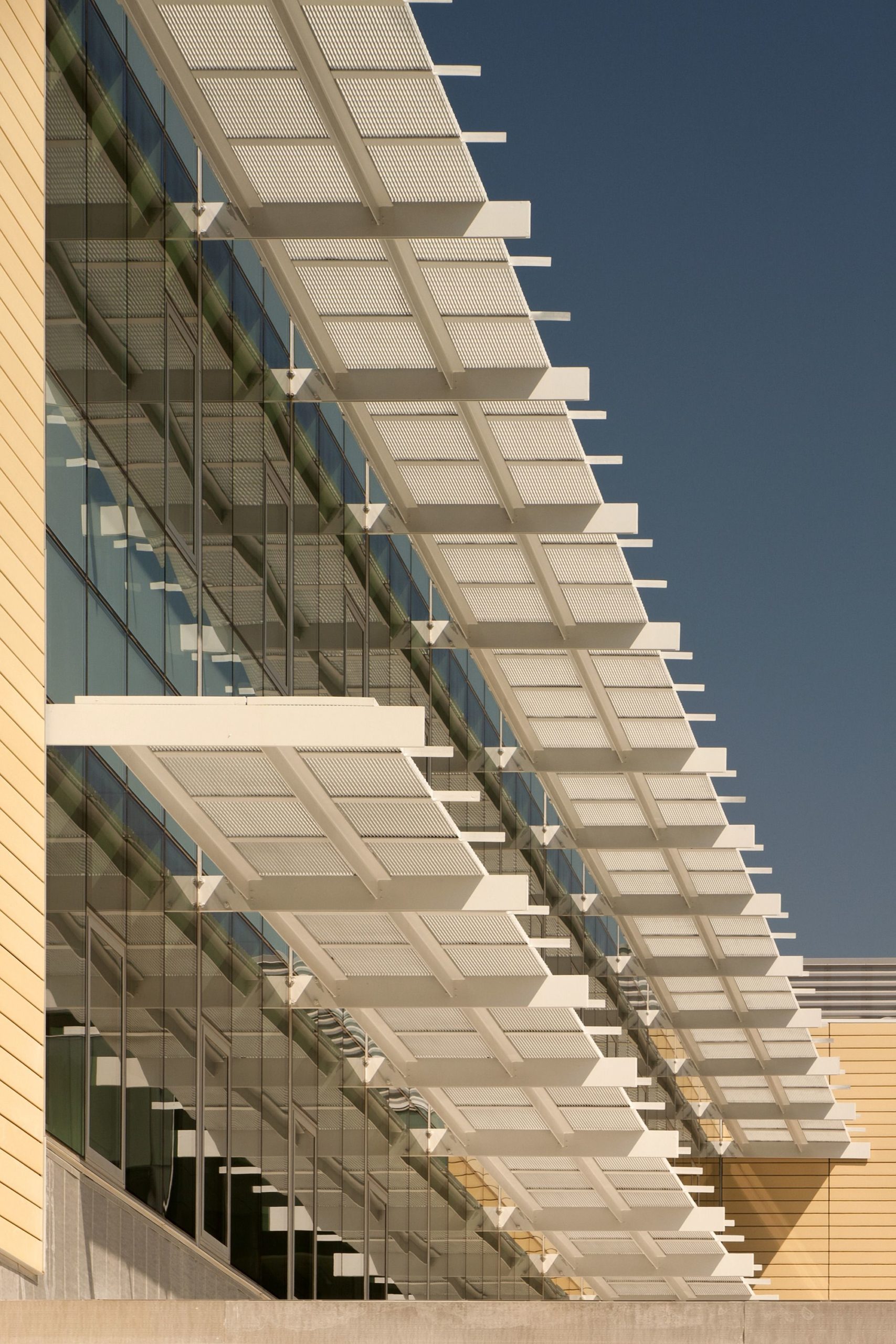 The transparent exhibition space and lobby marks a potent position on the campus thoroughfare and the building’s main entrance. Structurally glazed glass walls hang from the 60 foot cantilevered roof. A series of layers, constructed of glass curtain wall, aluminum plate, and terra cotta cladding express the program. Metal louvers shade the interior spaces, allowing views of the distant buttes from classroom and laboratory spaces.