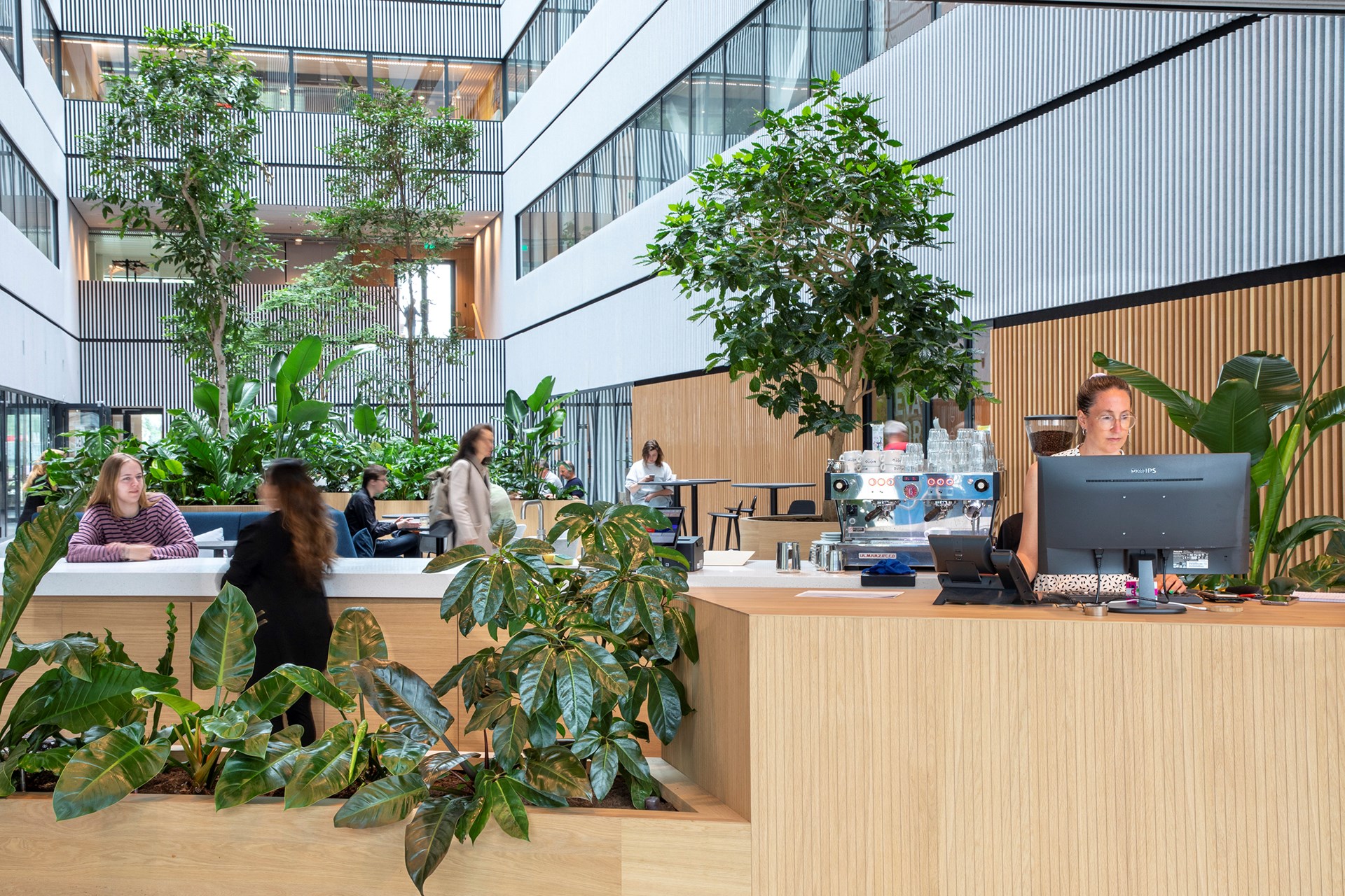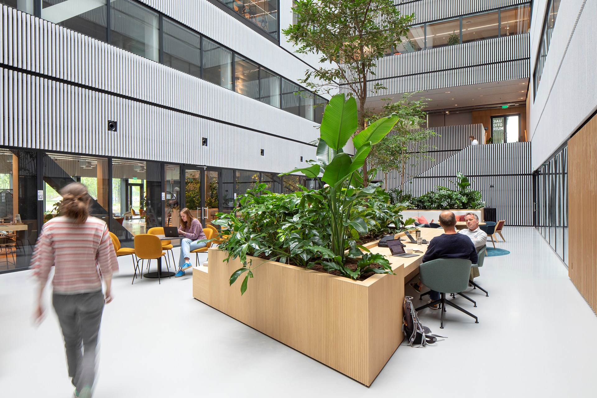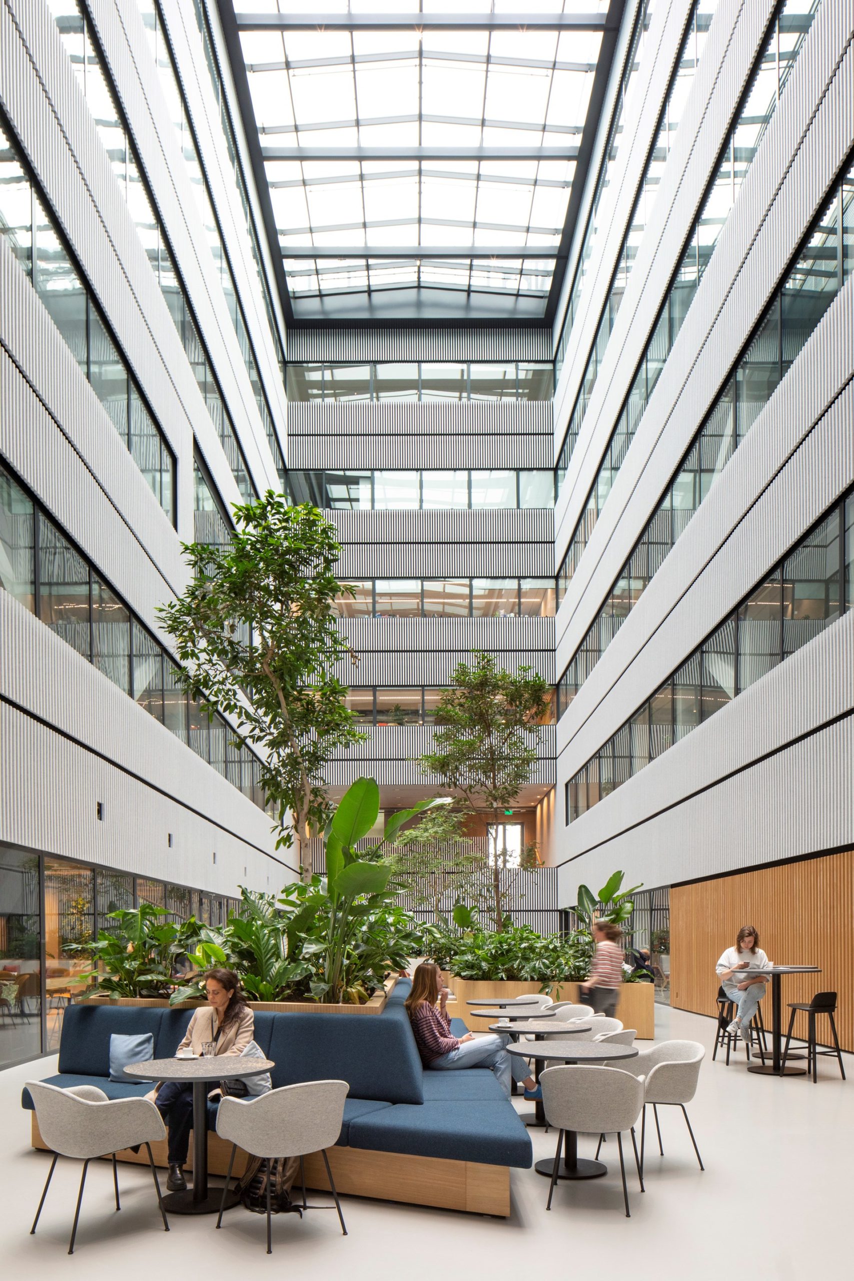 MVRDV and up architecture collaborated on the interior design of this space, which features multiple green walls visible through the glass exterior. The space’s social areas also benefit from soft felt finishes that drastically decrease sound resonance.