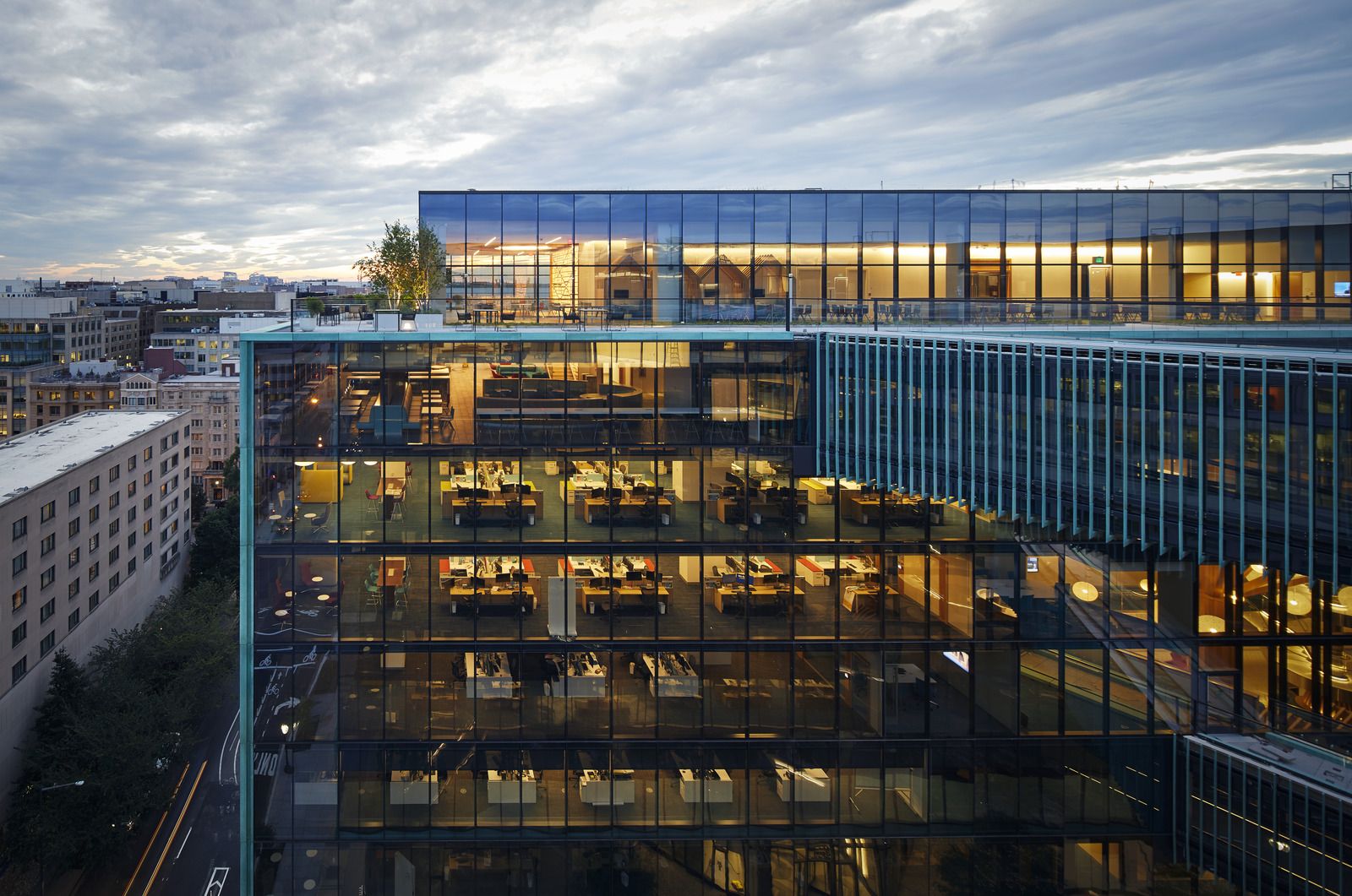 “The unique copper facade we have developed is a subtle, 21st-century interpretation of a material associated with the great architectural heritage of D.C,” explained Pasquarelli. “It is also a high-performance response to improving the quality of life in a glass building, angling strategically to provide protection from glaring south light while opening the interiors up to the more gentle reflected light from the north,” he added.