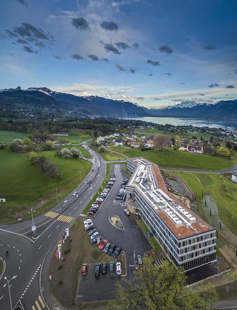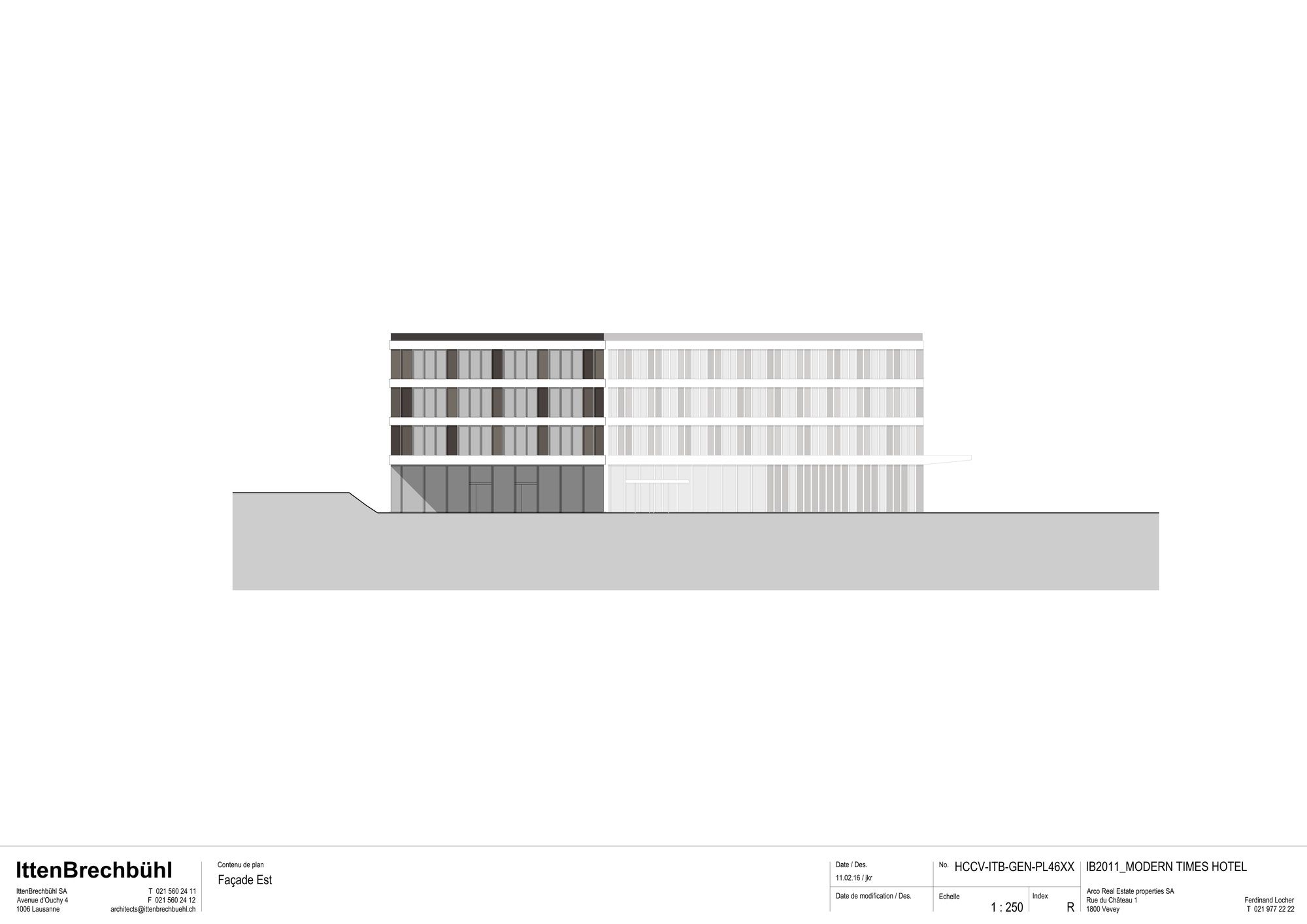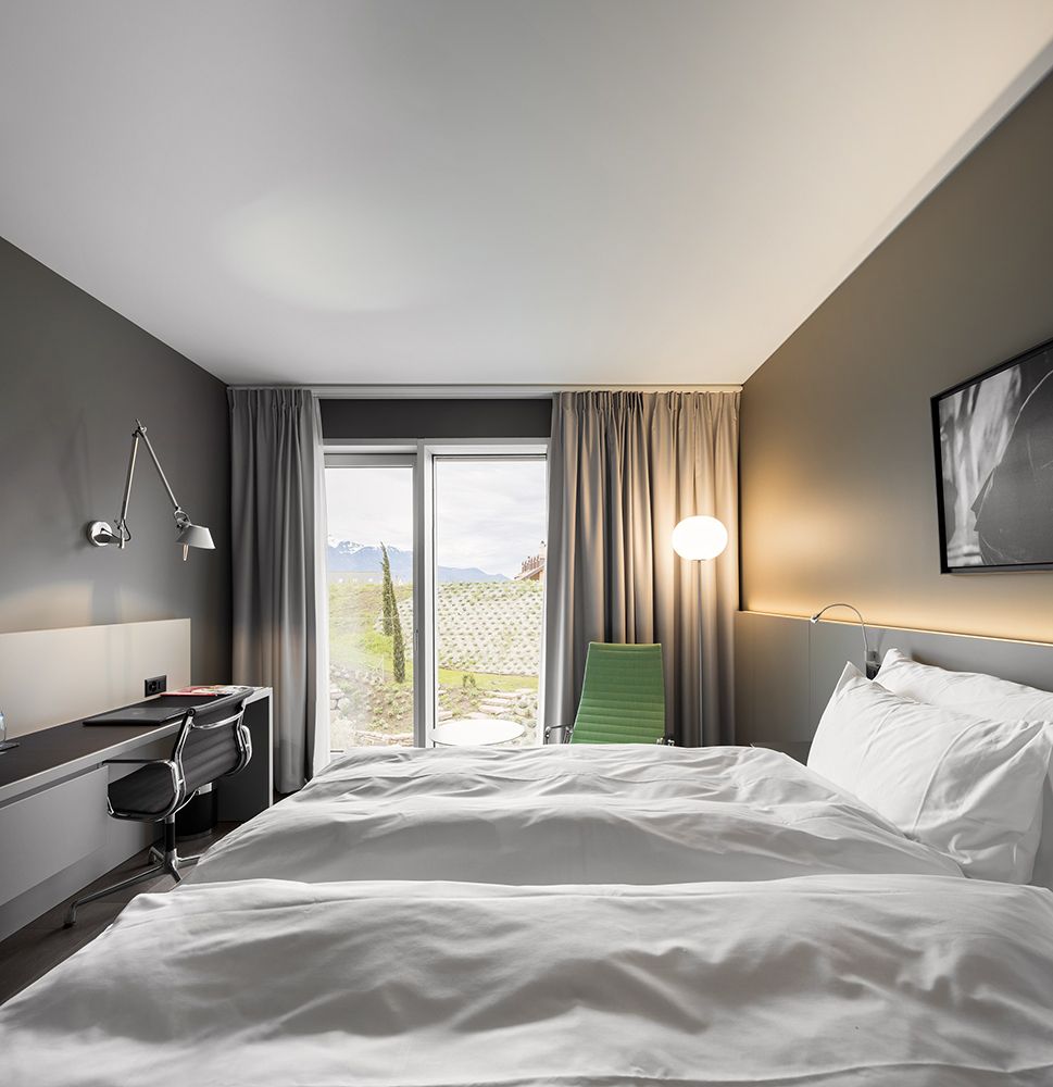 Designed by the architectural practice of Itten+Brechbühl and constructed by the main contractor HRS, Modern Times Hotel enjoys a perfect location amongst the hills above the town of Vevey. It sits adjacent to the motorway for easy access by car, only a stones-throw from the new Charlie Chaplin Museum with the mountains, the heart of Vevey itself, and the famous UNESCO World Heritage site of the Lavaux vineyards close by. Thanks to its highly visible location, the buildings seem to welcome its visitors with open arms just after they leave the main road. Modern Times Hotel has become a new gateway to the region and is emblematic of Charlie Chaplin’s presence in Vevey.