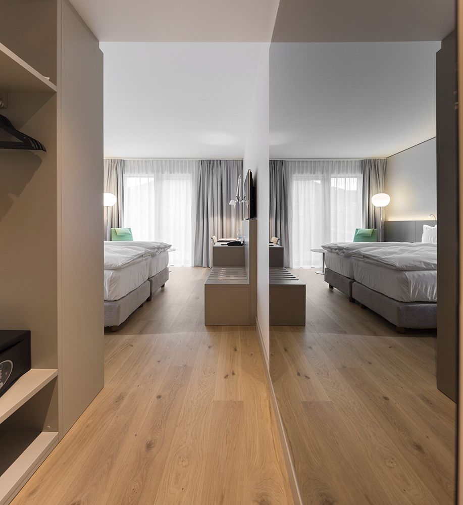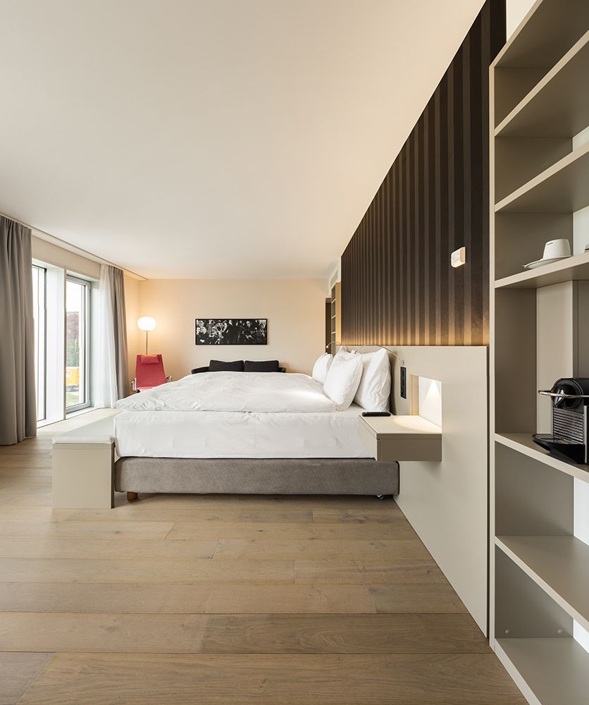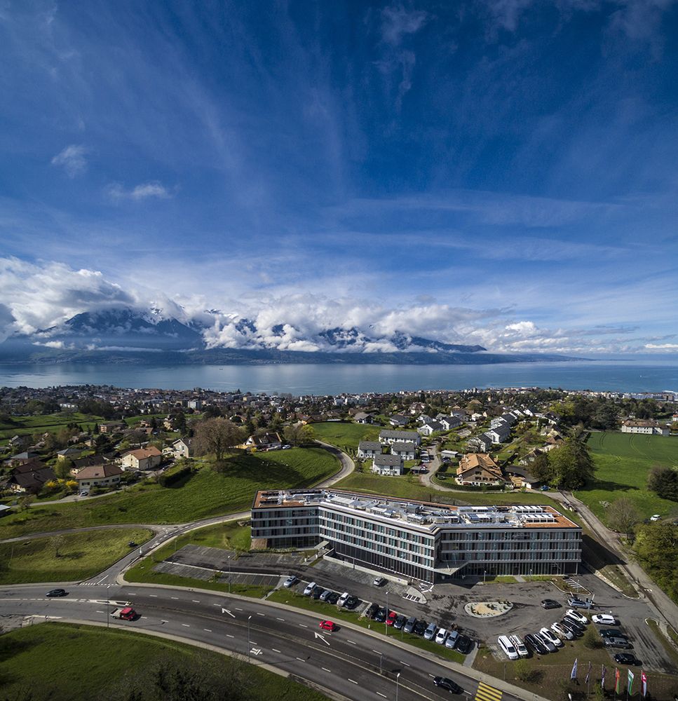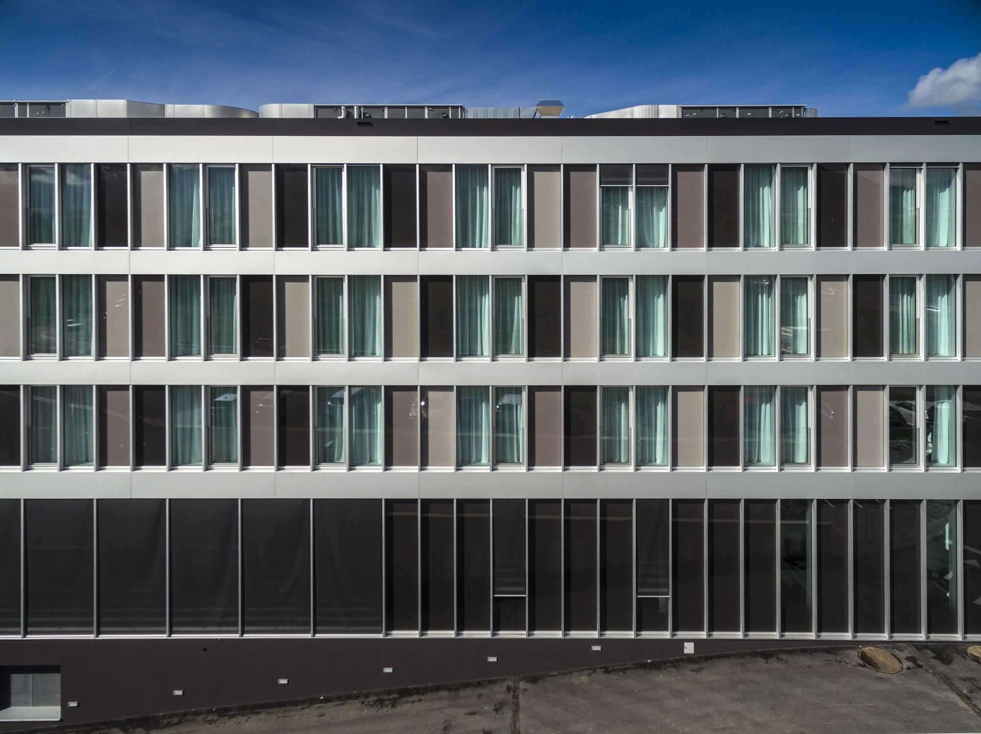 Designed by the architectural practice of Itten+Brechbühl and constructed by the main contractor HRS, Modern Times Hotel enjoys a perfect location amongst the hills above the town of Vevey. It sits adjacent to the motorway for easy access by car, only a stones-throw from the new Charlie Chaplin Museum with the mountains, the heart of Vevey itself, and the famous UNESCO World Heritage site of the Lavaux vineyards close by. Thanks to its highly visible location, the buildings seem to welcome its visitors with open arms just after they leave the main road. Modern Times Hotel has become a new gateway to the region and is emblematic of Charlie Chaplin’s presence in Vevey.