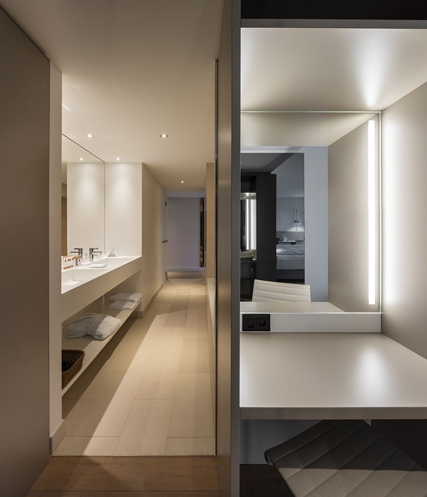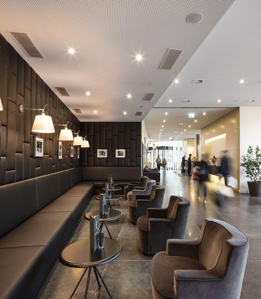 The building stretches along the length of the site but its façade has been designed as a rhythm of elements broken by only two folds which announce the main entrance to the hotel and the location of the restaurant. Ribbons of metal that run all around the building otherwise highlight its horizontality. Panels of warmly colored vertical glazing– brown, bronze, and grey – give the building an elegant, yet calm, character. The northern façade of the hotel reads like a sequence of planes which change in their appearance according to one’s particular viewpoint and also with the changing natural light.