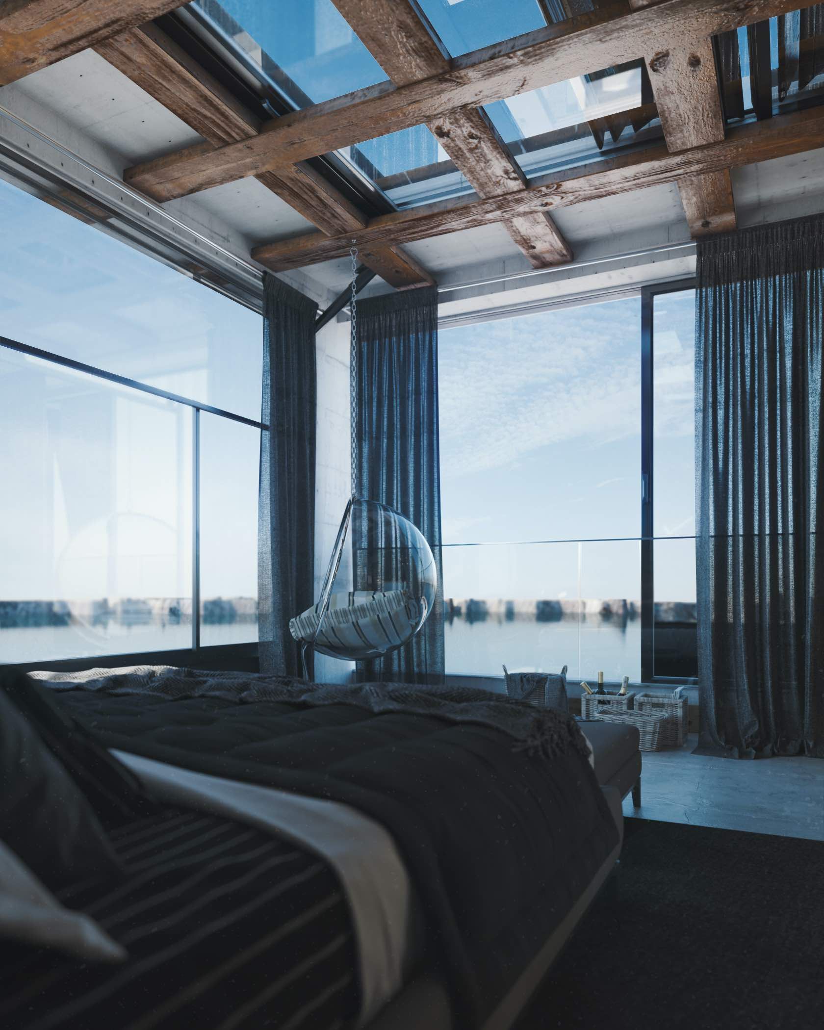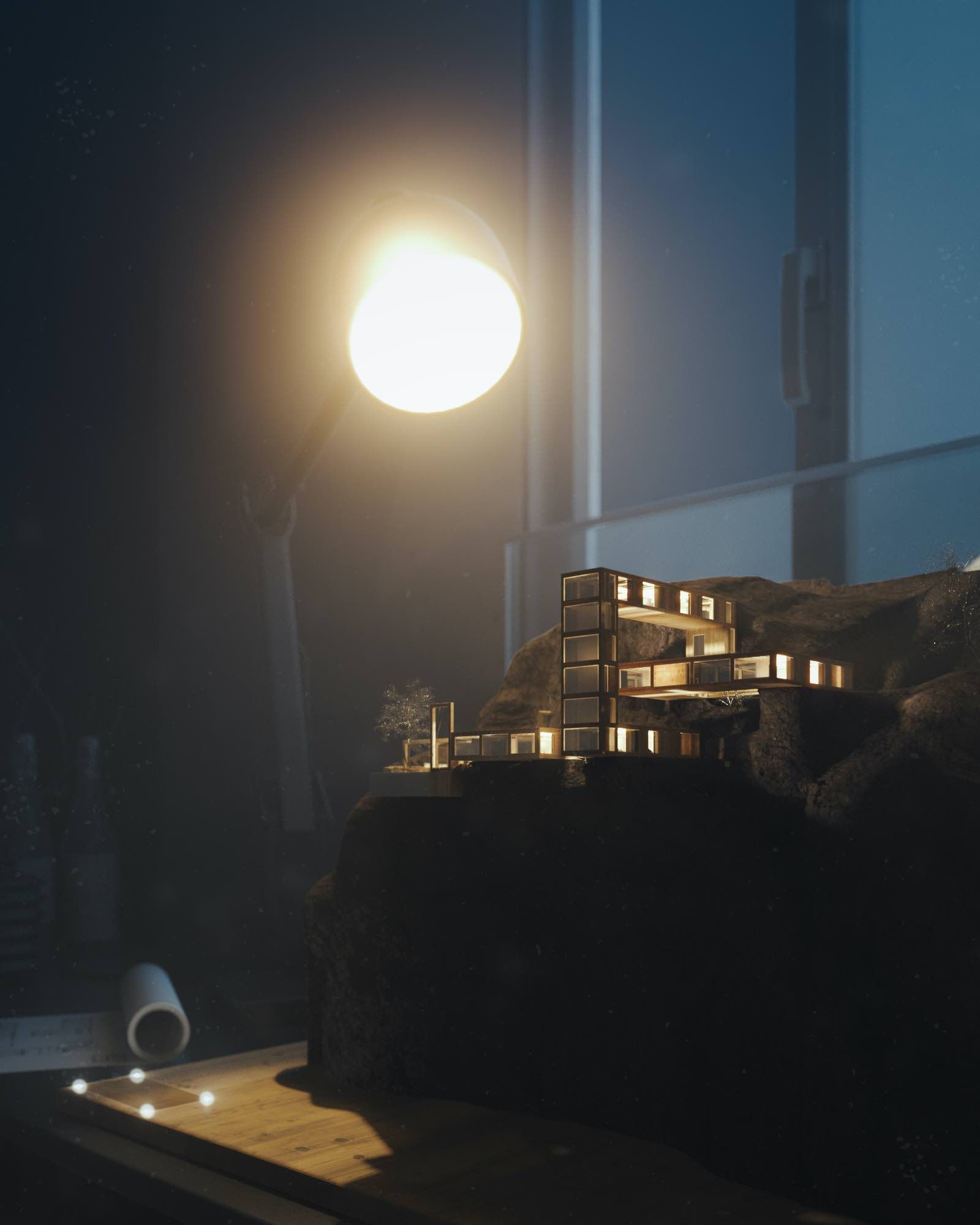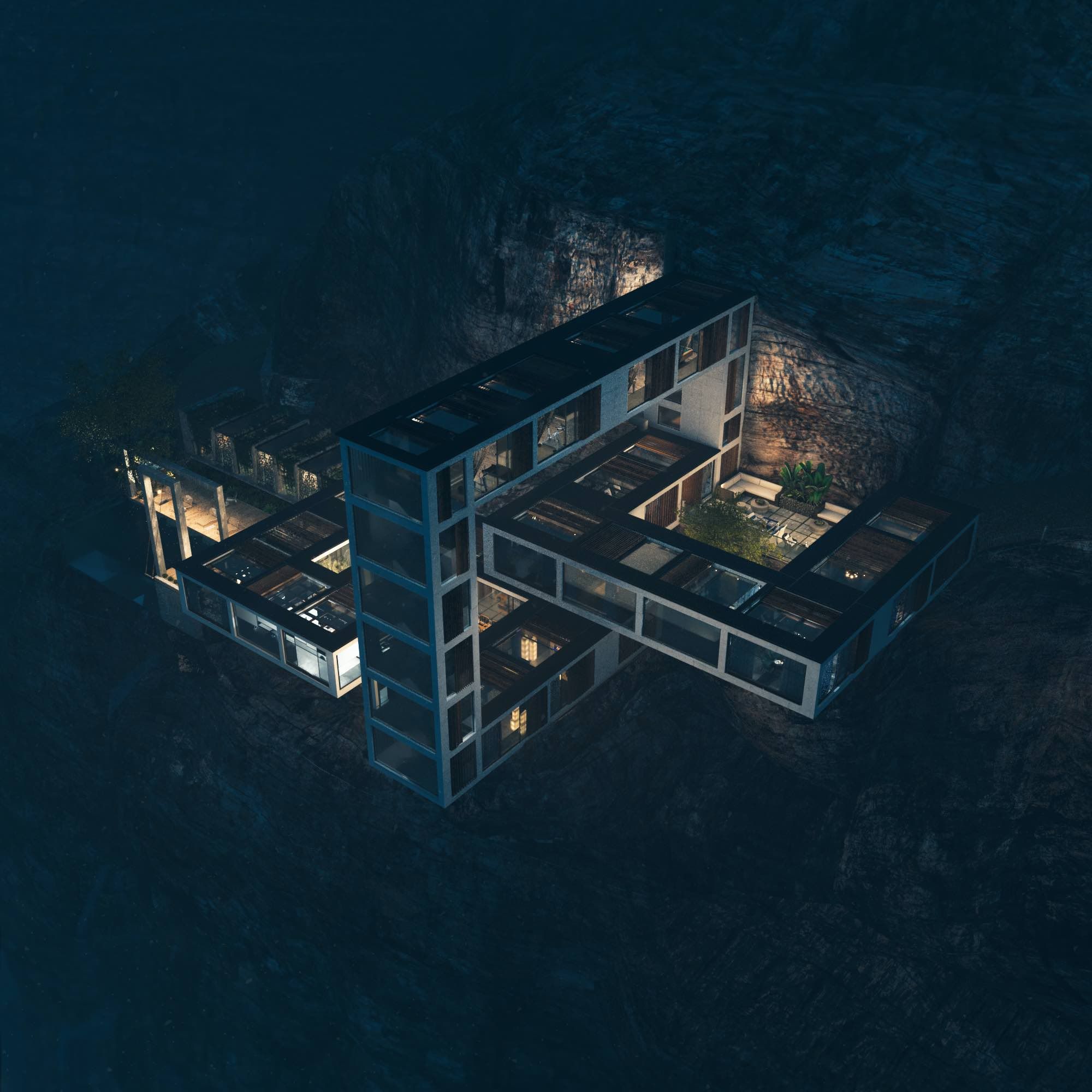 Milad eshtiyaghi‘s envisioned ‘mountain house’ seemingly defies gravity with its dramatic cantilevering structure. the house is divided into three primary levels, suiting an intergenerational family. while two levels are programmed to house the younger generation’s family and their parents, a third level hosts a recreational sports space.