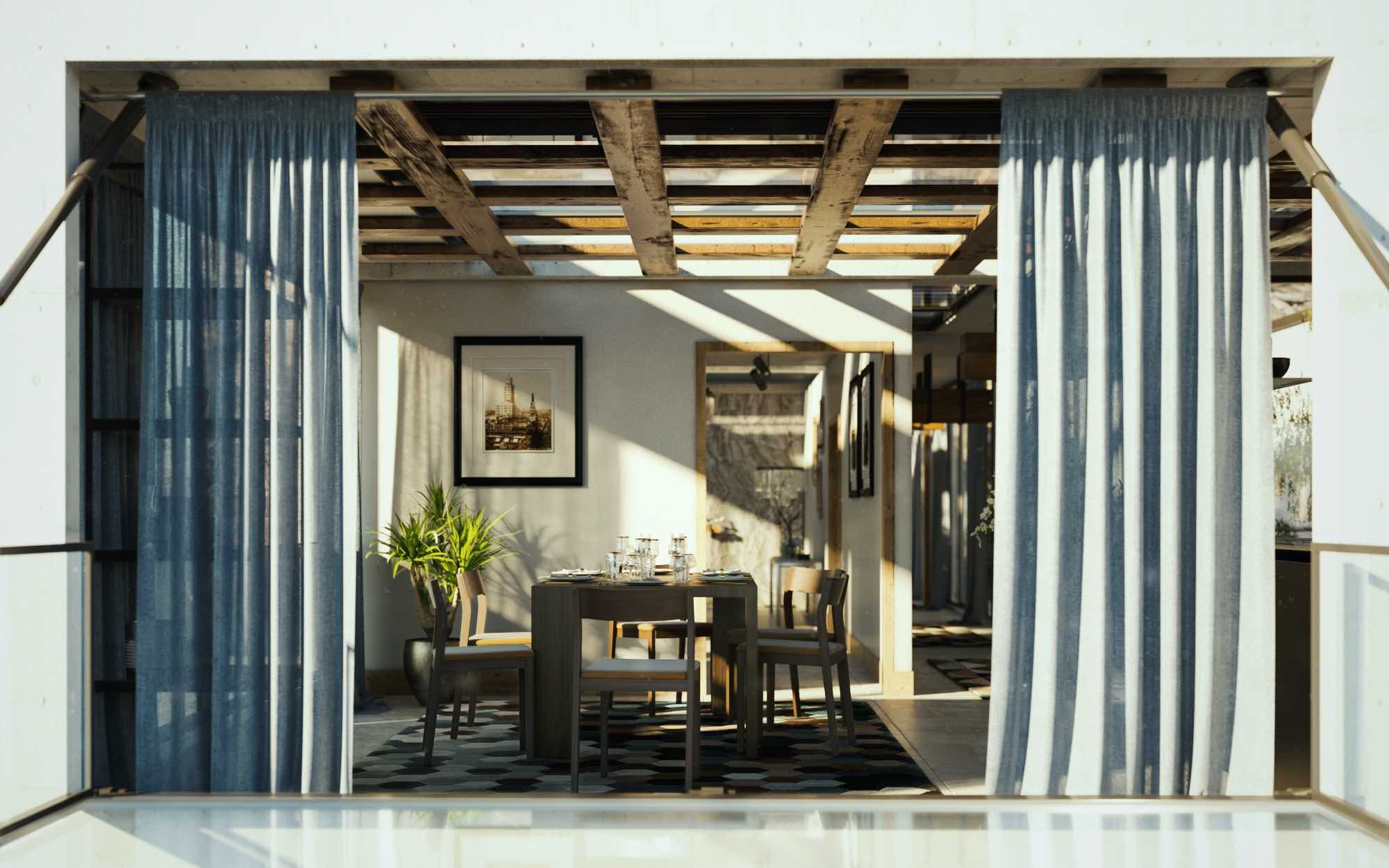 Each of the house’s box modules opens widely outward with a full-height wall of glazing. these glazed walls individually fold open with a mechanical cable system to transform the interiors into semi-outdoor terraces. with a cantilevering, glass-bottomed swimming pool, the ‘mountain house’ celebrates its fear-inducing, cliffside site.