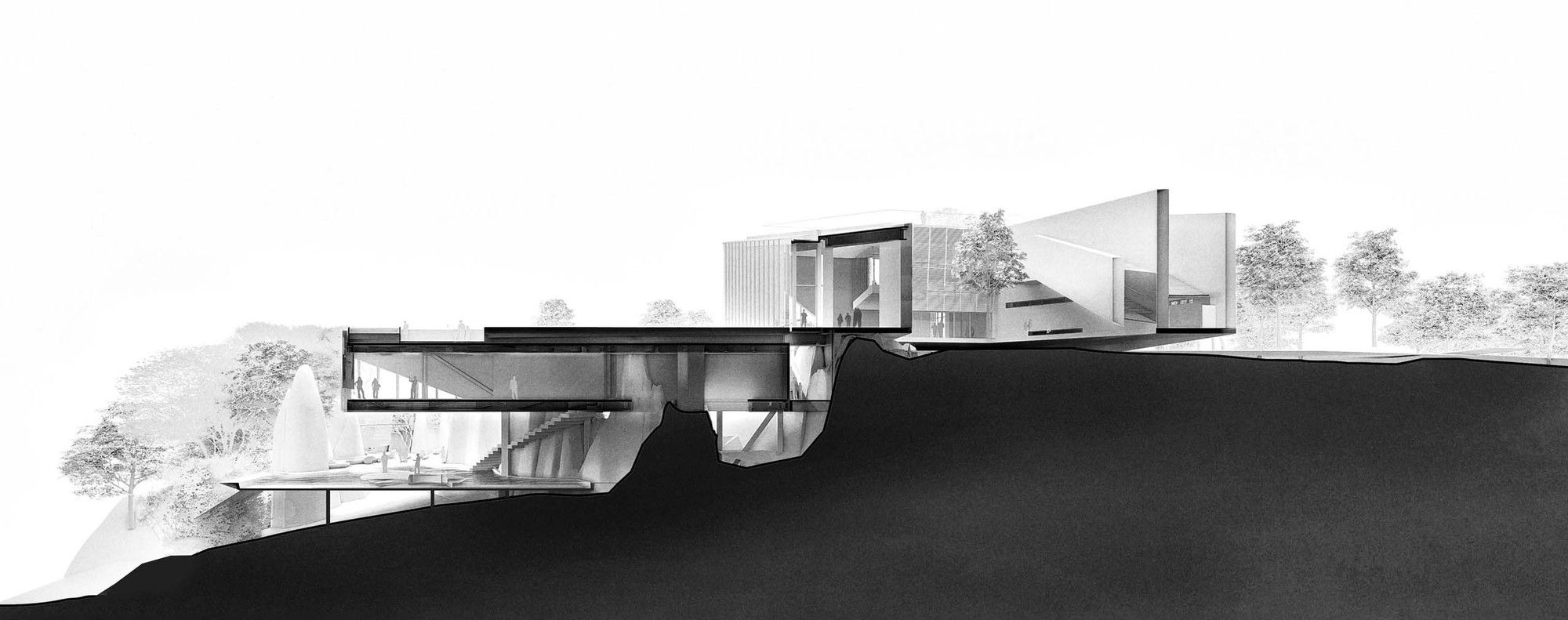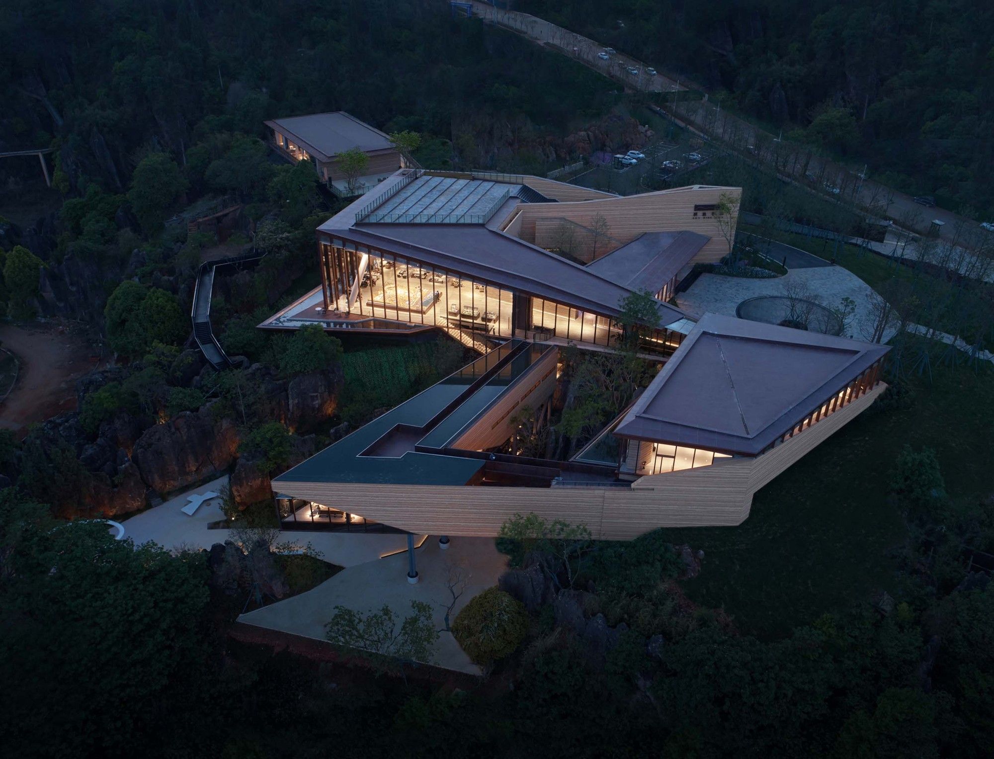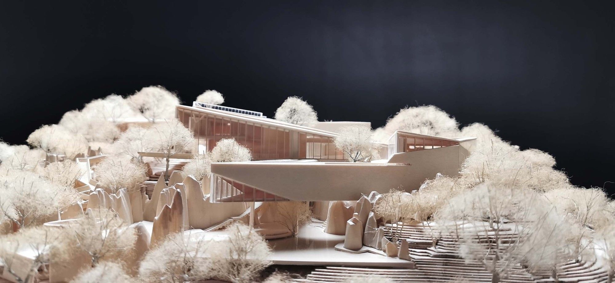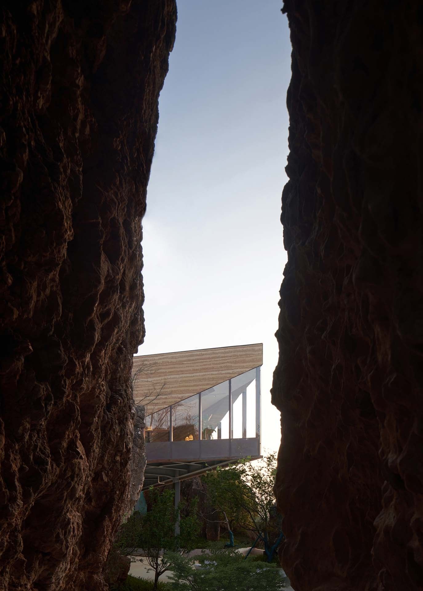 Incorporating the Natural Landscape- The architectural form seamlessly aligns with the contours of the stone, evoking a sensation of weightlessness through a “low intervention” approach. The structural system adeptly navigates around the stone forest’s obstacles, finding support within its voids. The indoor tree-shaped columns are lightweight, fulfilling the requirements for a well-lit and transparent primary exhibition space.