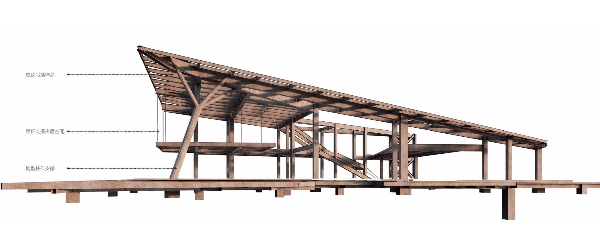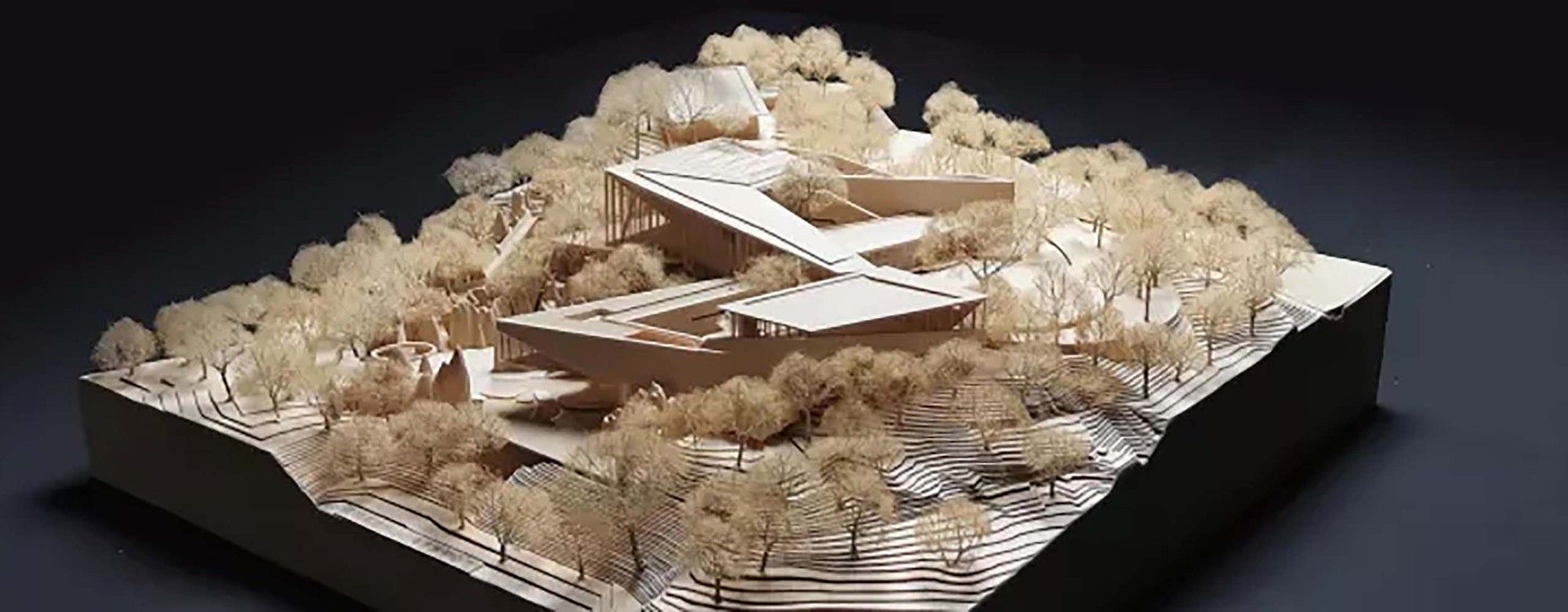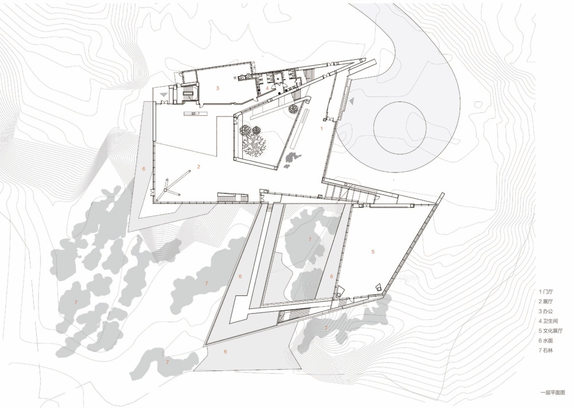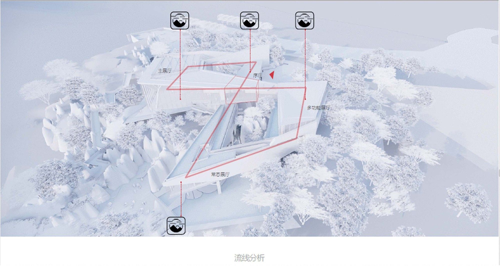 Incorporating the Natural Landscape- The architectural form seamlessly aligns with the contours of the stone, evoking a sensation of weightlessness through a “low intervention” approach. The structural system adeptly navigates around the stone forest’s obstacles, finding support within its voids. The indoor tree-shaped columns are lightweight, fulfilling the requirements for a well-lit and transparent primary exhibition space.
