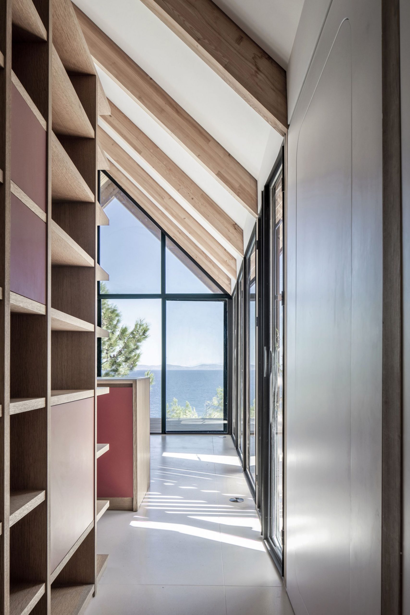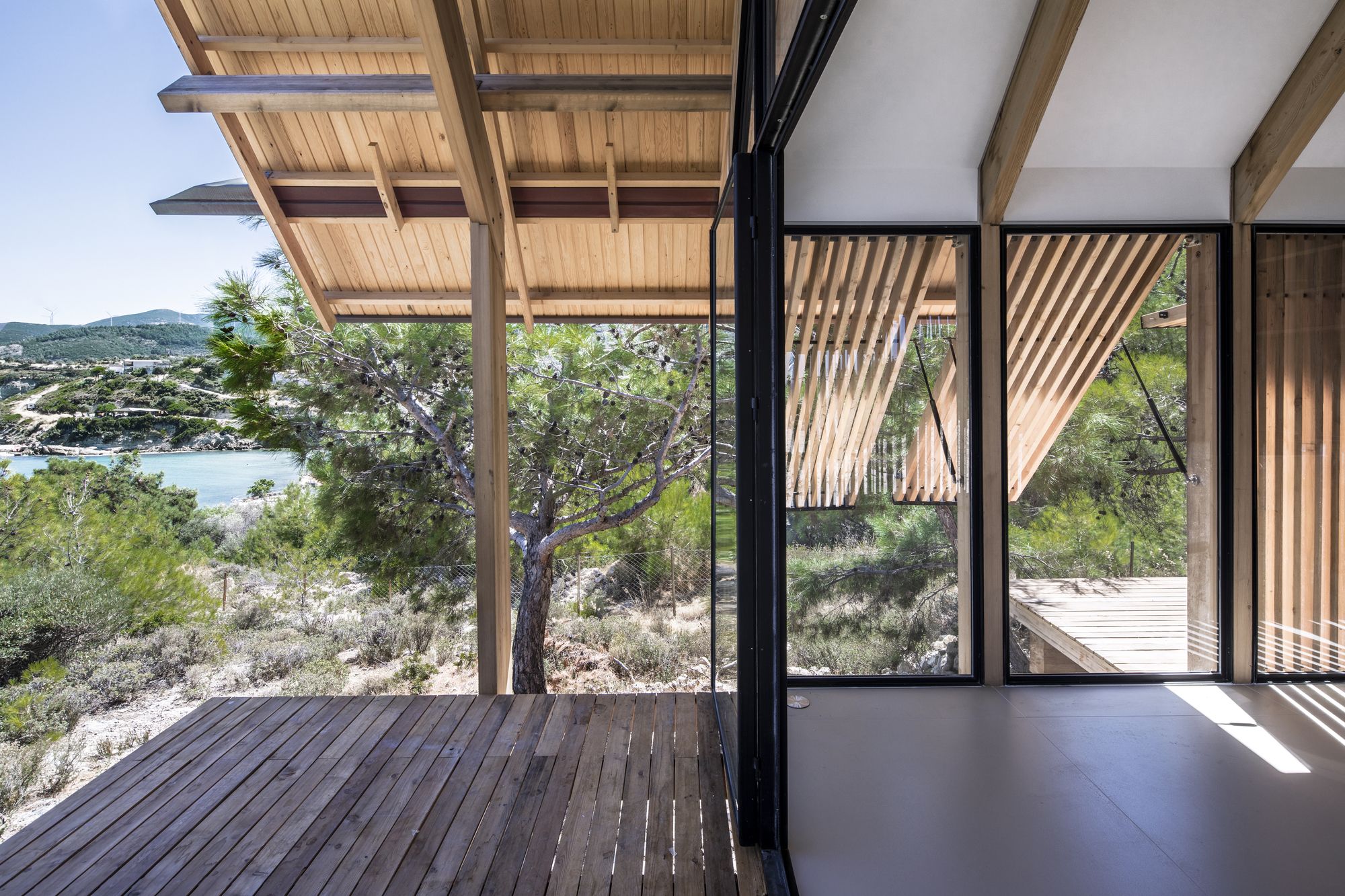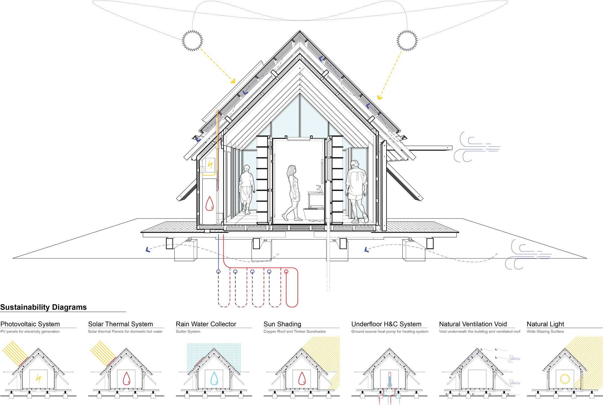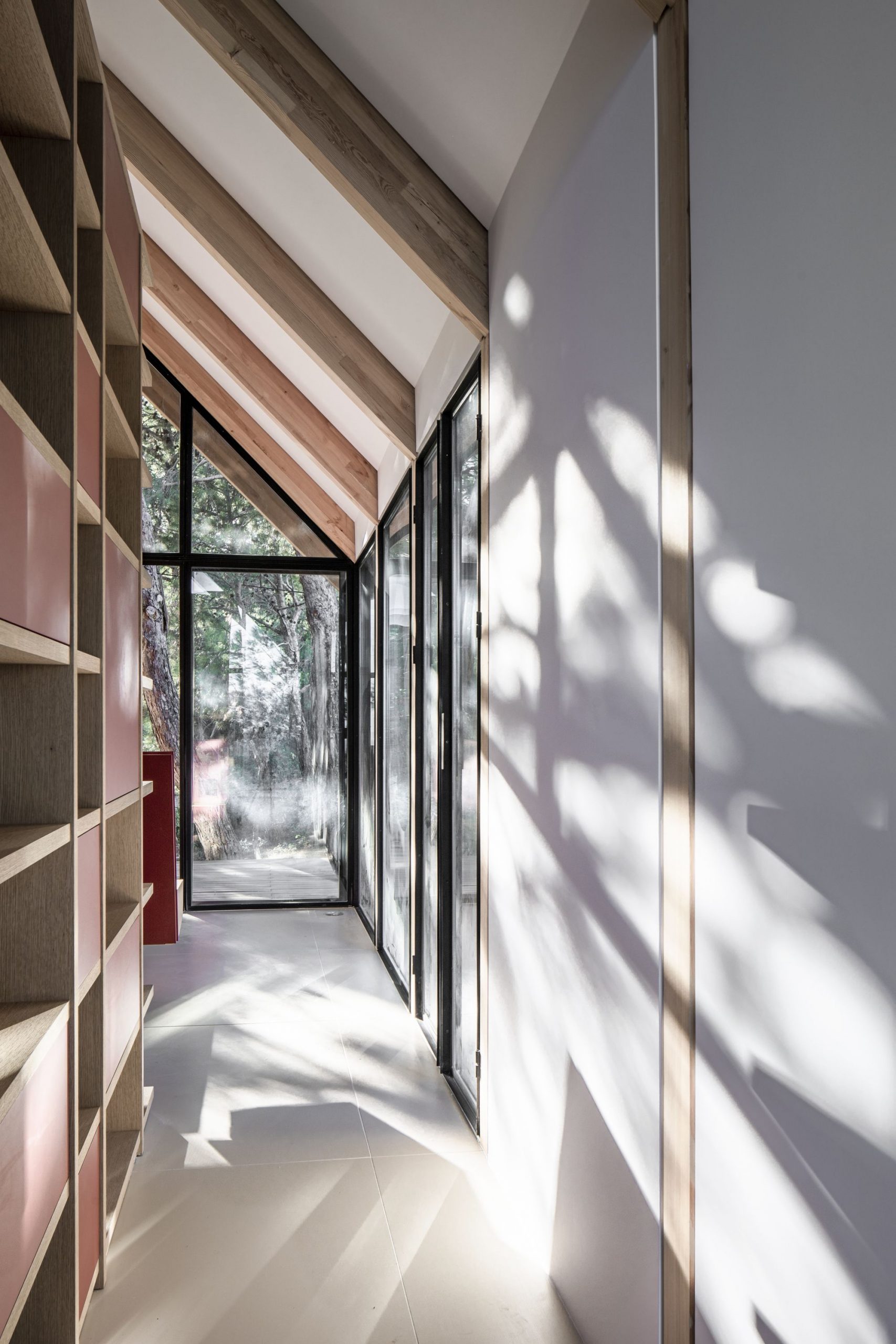A simple, open plan allows natural lighting and facilitates cross ventilation. The transparent surfaces designed to receive maximum daylight into the interior spaces minimize the necessity for artificial lighting. The high-pitched gable roof houses the photovoltaic panels to produce electricity and solar panels to heat water.
