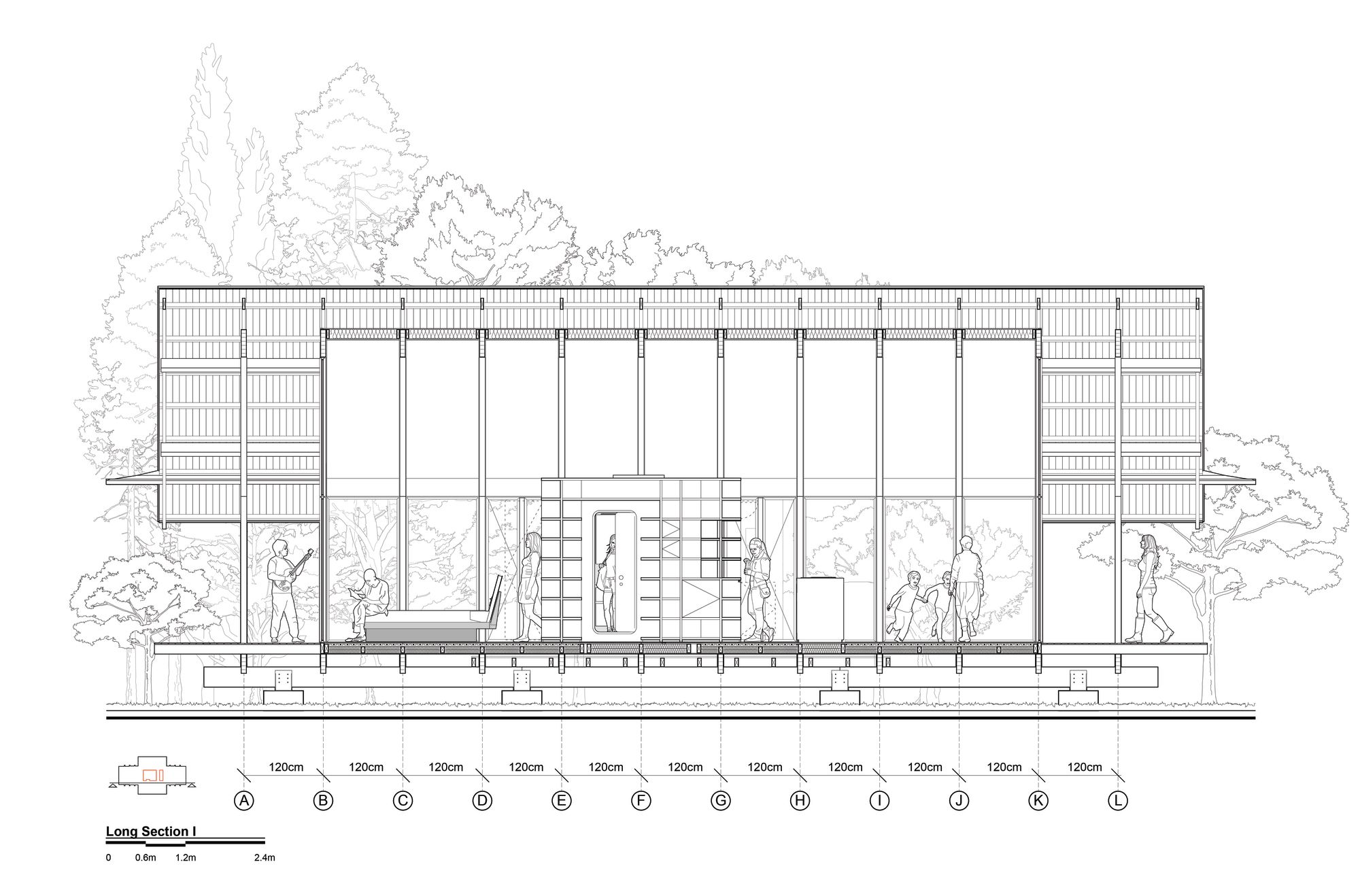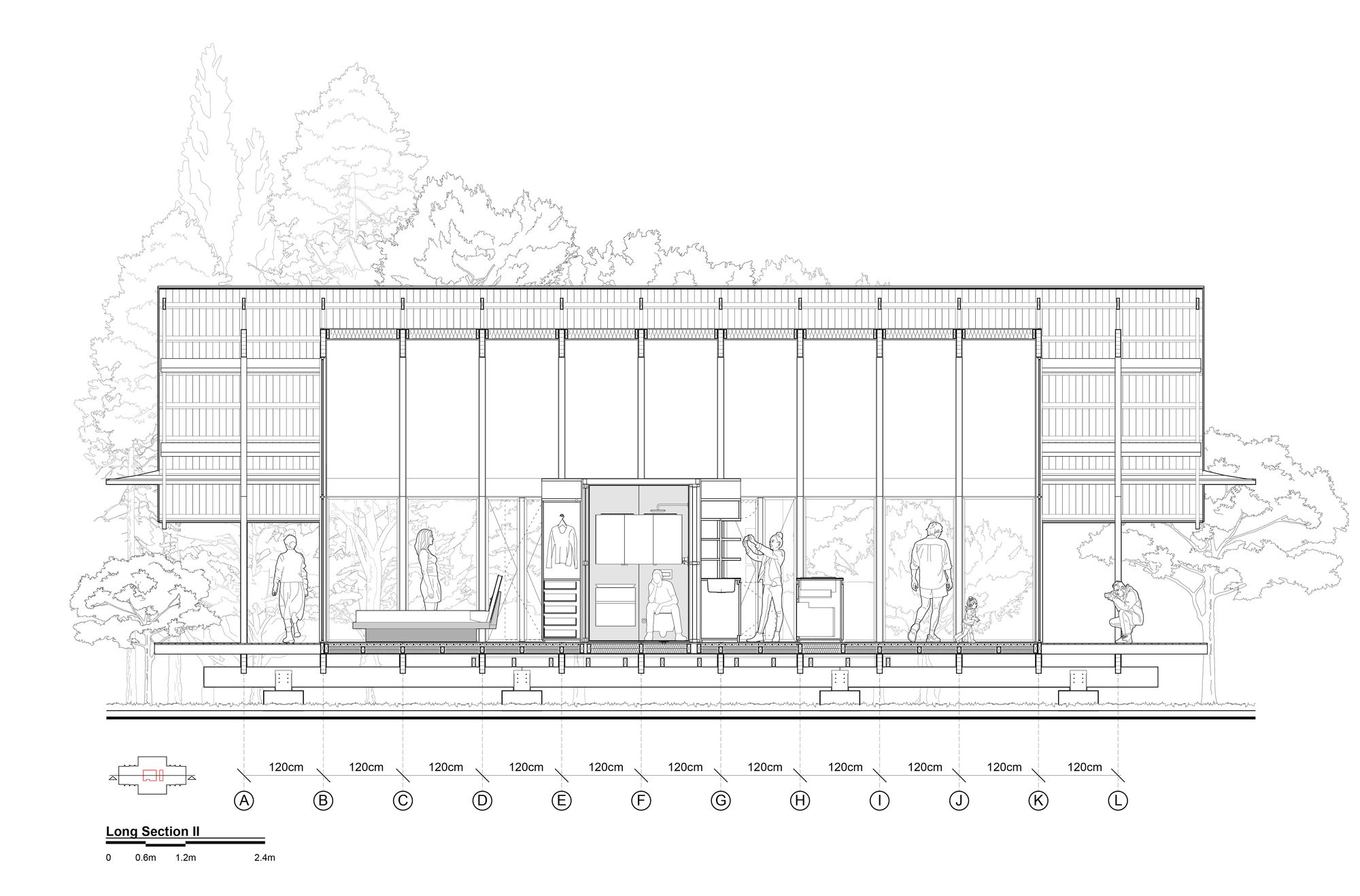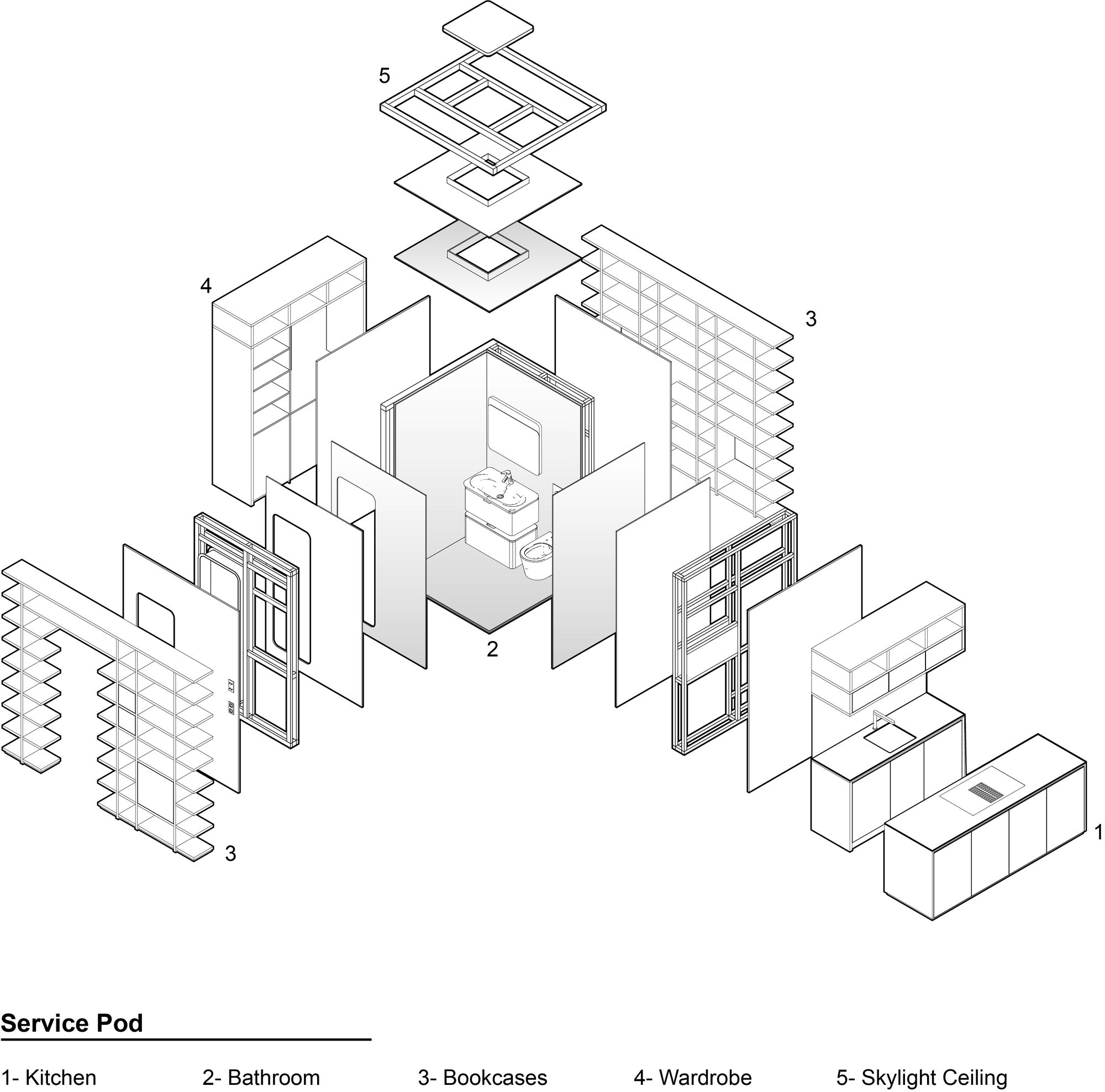The elements of this modular system can be varied in number and materials to house different building functions. As more structural frames are added, the building becomes larger; it can remain a singular, simple, rectangular space, or it can be subdivided by one or more service pods. Thus, a simple act of repeating and combining a small number of relatively simple building elements can produce a wide variety of spaces fit for different uses – from a small meditation room to a dwelling.