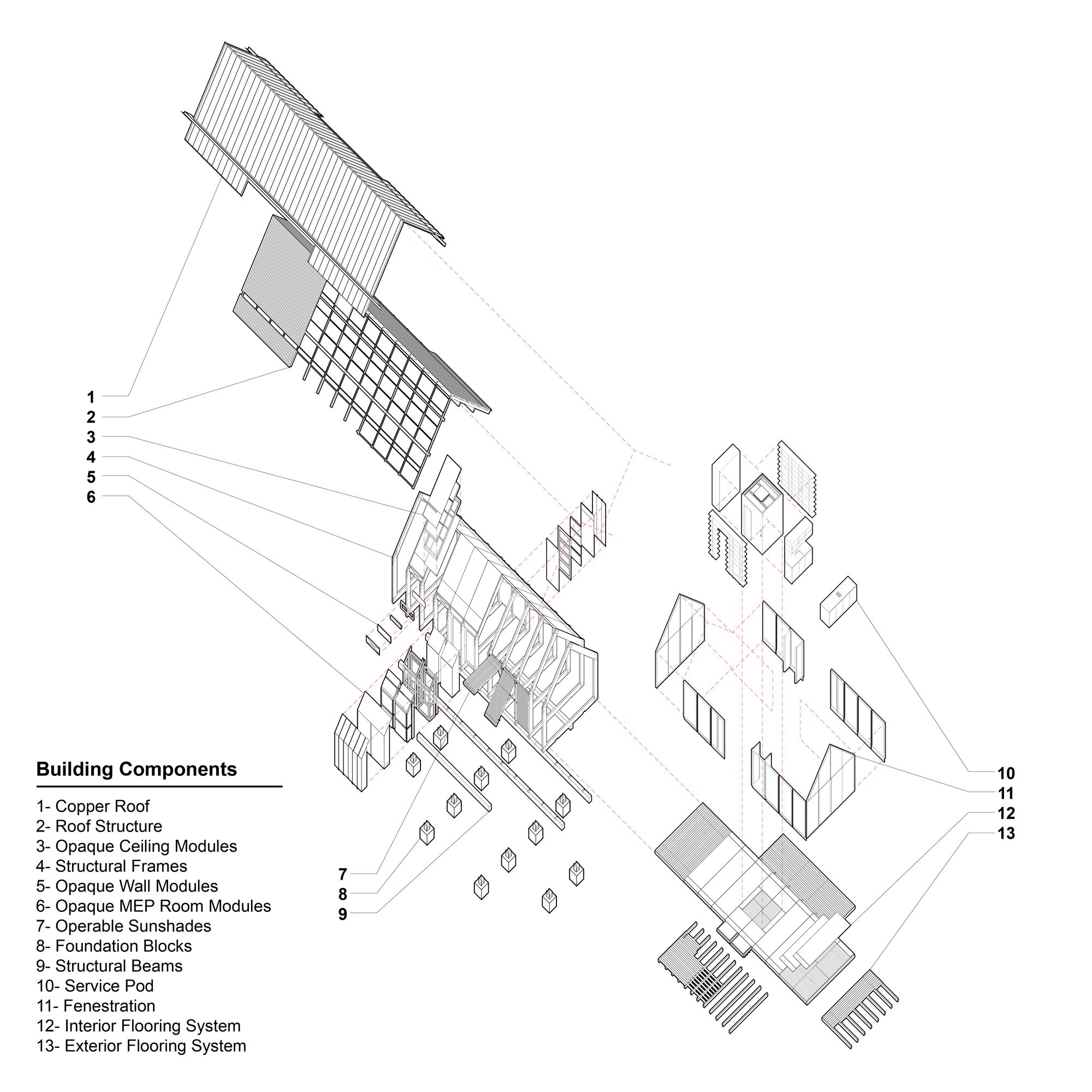 This is a multi-layered passive climatic control surface: while the thermal insulation and waterproofed panel finish above the laminated wood roof structure provide the function of a conventional system; copper surface mounted above the actual roof surface provides efficient passive control and reduction of heat gain, by creating continuous air movement and shading above the unit.