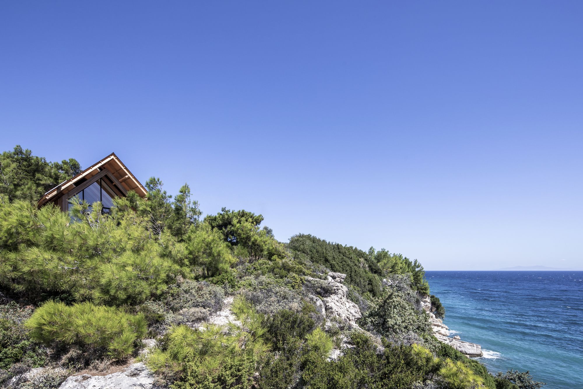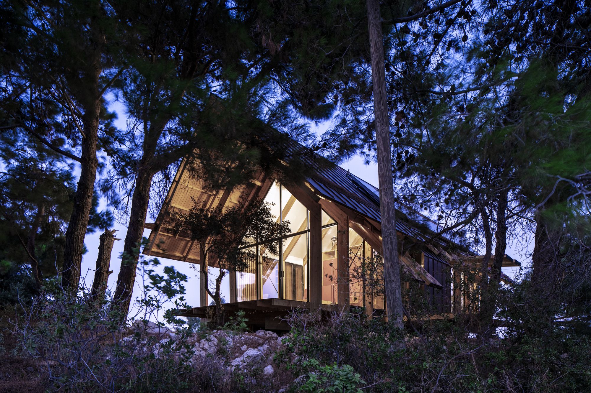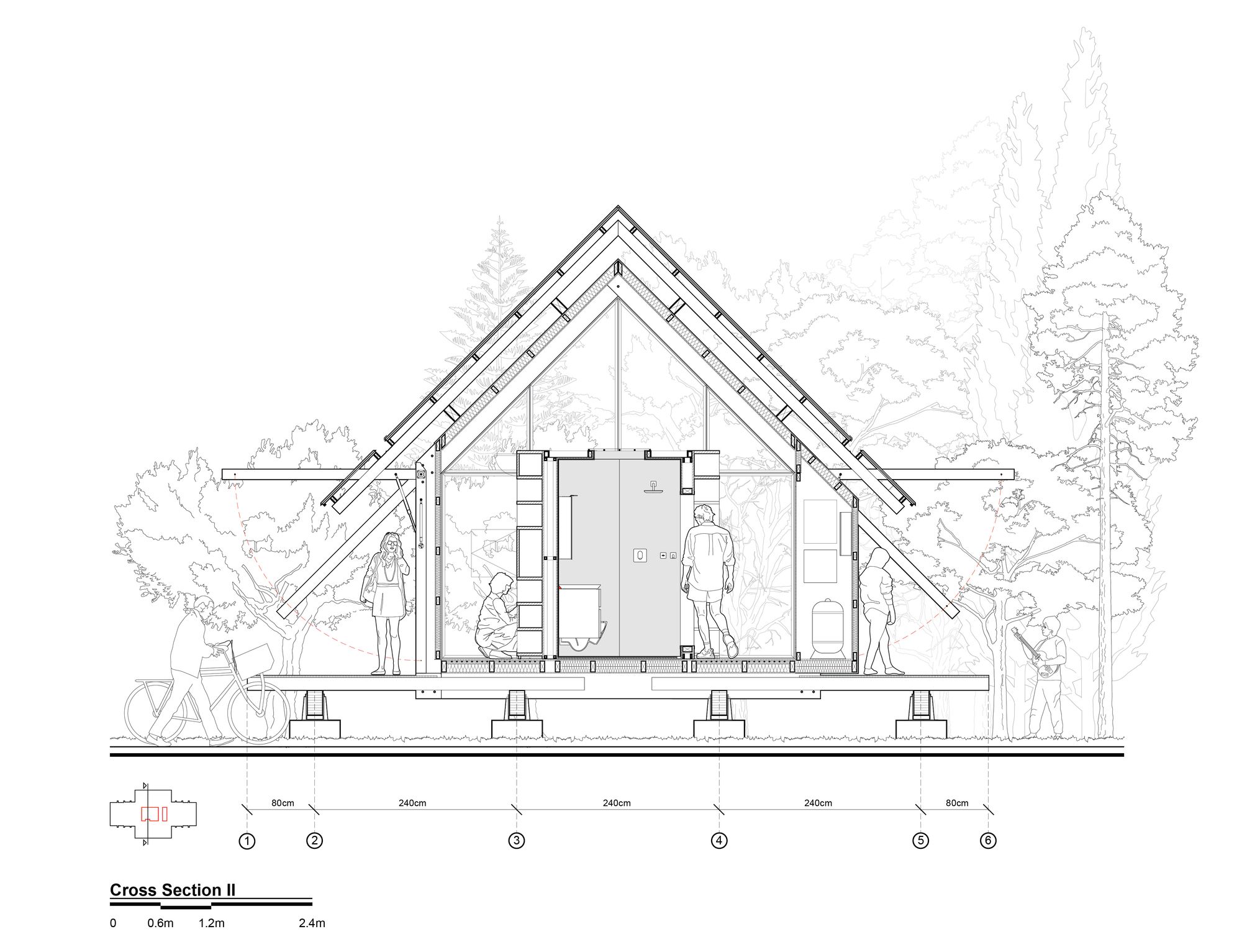 The structural frames and the enclosure define the shell of the project, while its interior core consists of a separately constructed service pod with amenities and storage space. The pod includes the bathroom and kitchen as well as the necessary storage space. Glazing on all sides of the building allows visual transparency and creates a sense of openness and continuity between the interior and the surrounding landscape.
