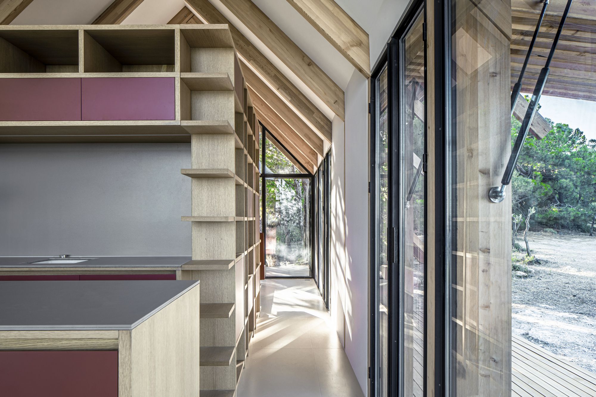 Ground source heat pumps and underfloor heating constitute an efficient system that makes use of minimal energy. The floor of the unit is raised above the ground, which allows air circulation below its surface. Building orientation, custom-made double-pane glazing, and piston-operated pine sunshades all protect the interior from direct sunlight.