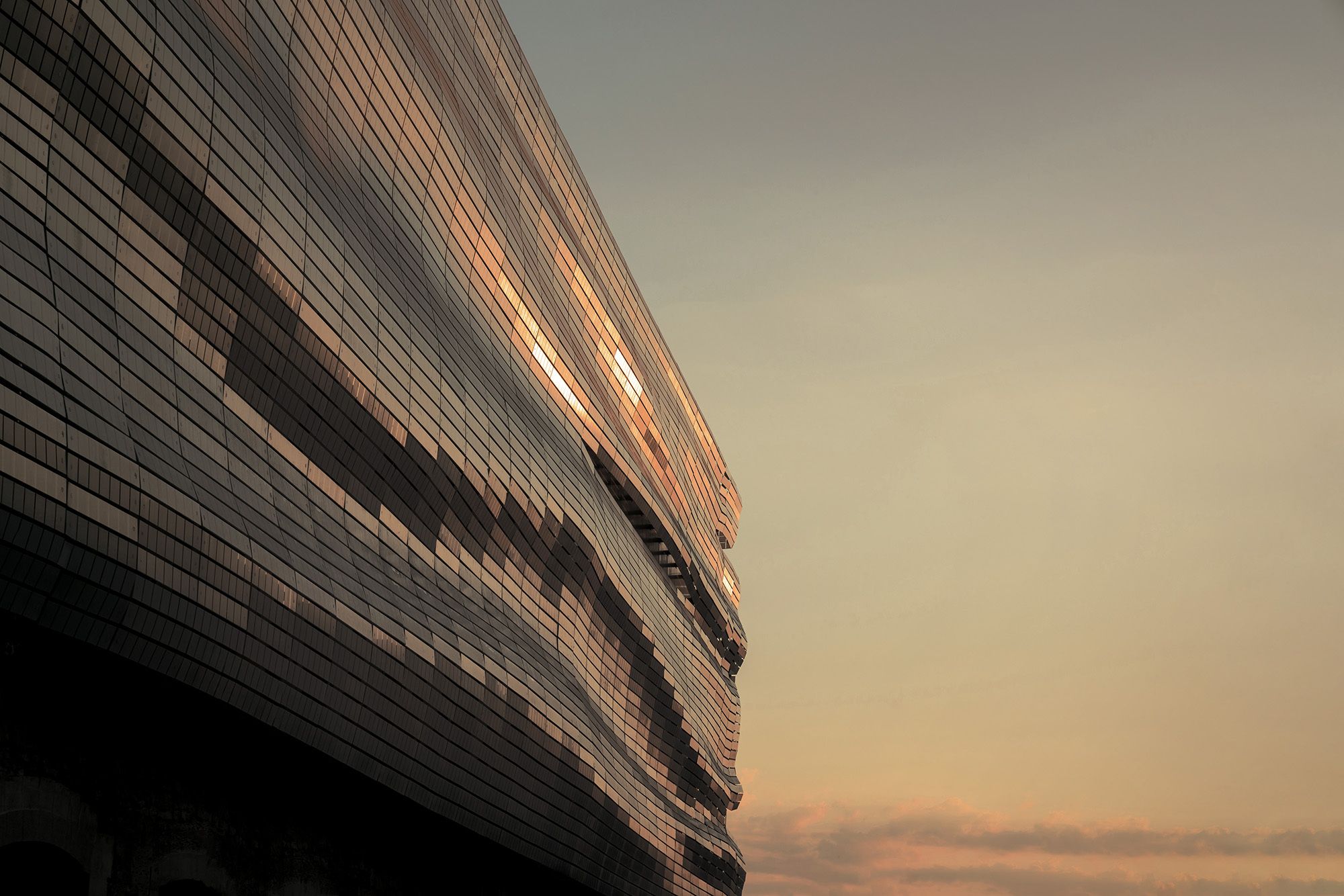 Situated at the entrance to the ancient city, the museum opens the view to the Amphitheater through transparent its ground floor. The supple drapery of the façade evokes a Roman toga and the square glass plates composing it combines modern transparency with the tradition of a major Roman art: mosaics. It also subtly evokes a major element of the museum’s collections. This translucent glass skin is composed of 7,000 screen-printed glass plates covering a surface of 2,500 m2. The reflections and undulations of this glass mosaic change appearance over the course of the day.