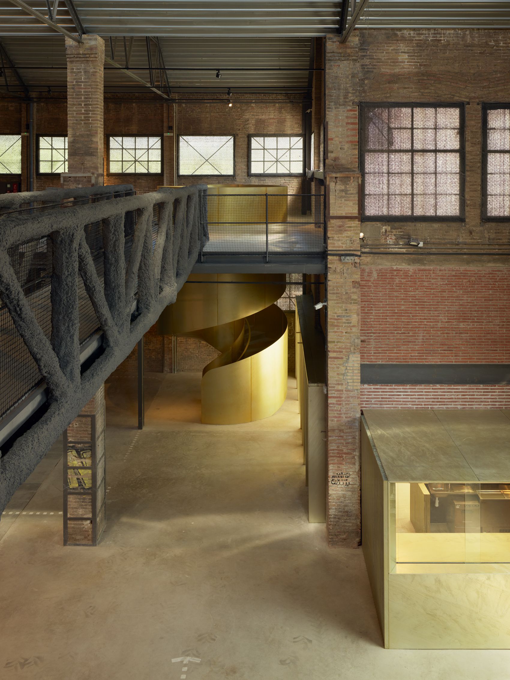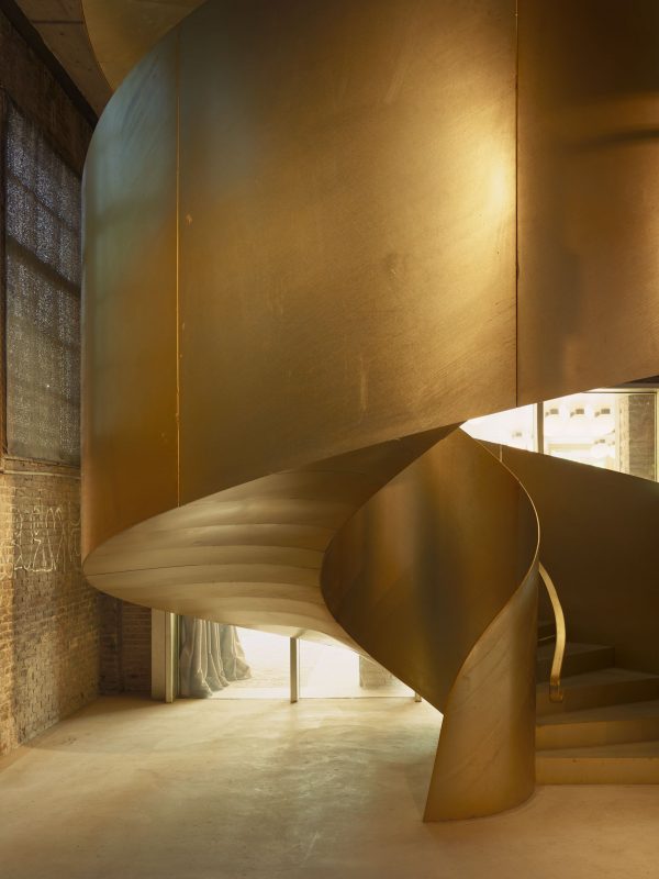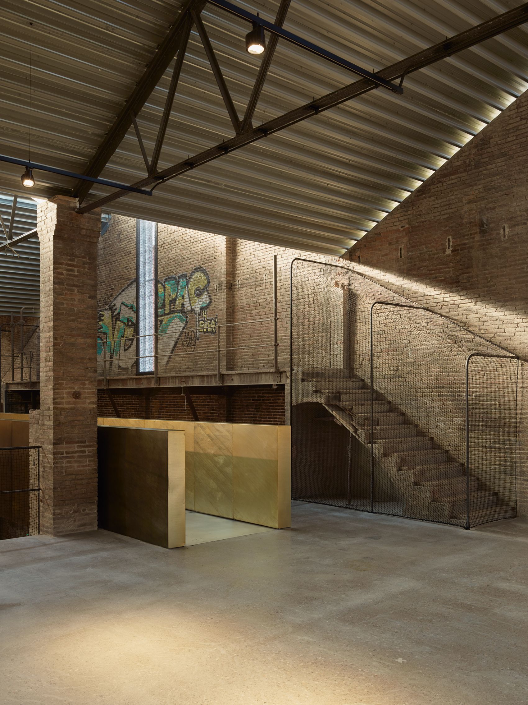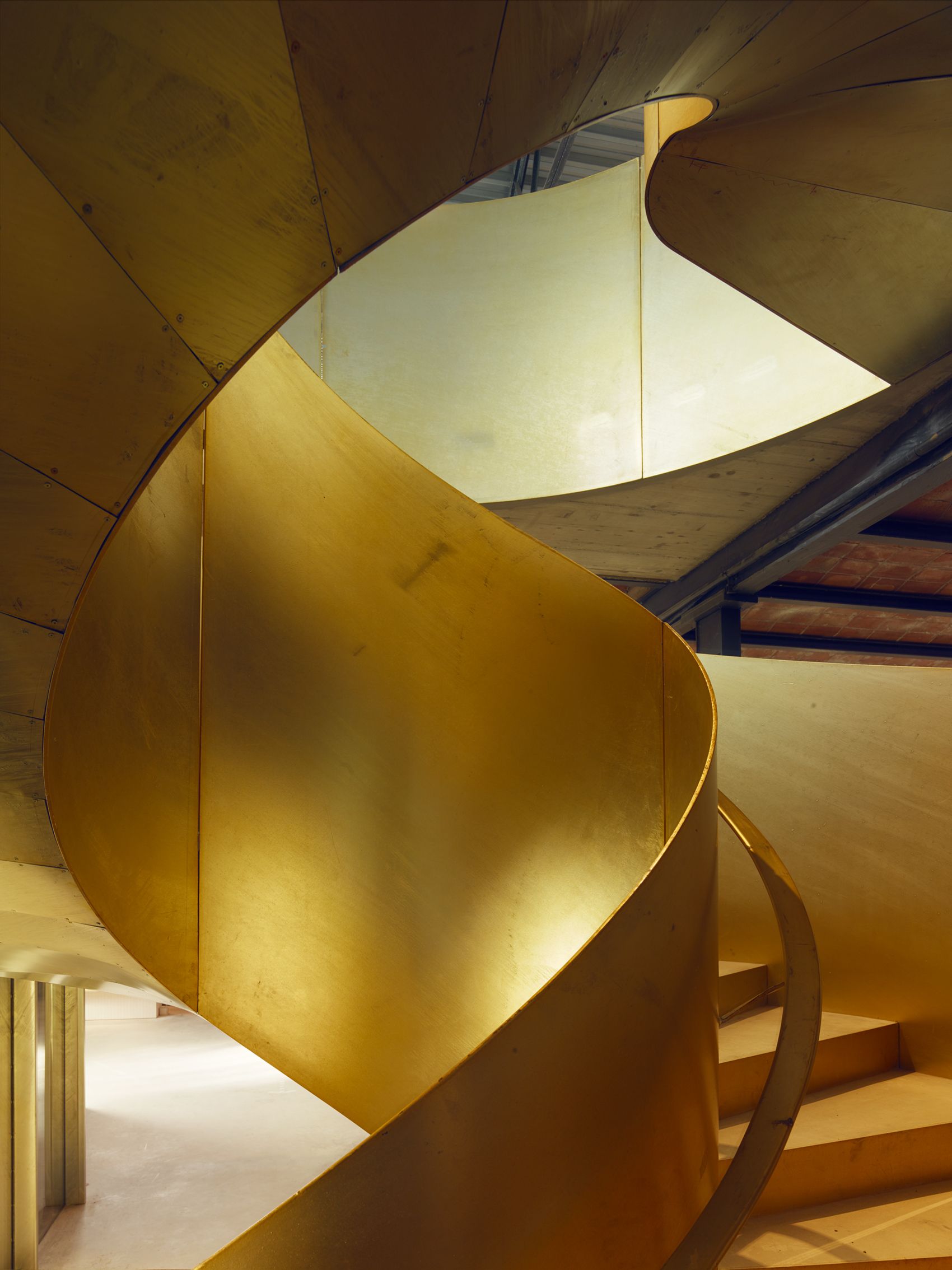 Others, on the other hand, are manifested in that singular golden galvanized iron steel that builds the staircase, the elevator and the porch, with the firm will to be a character in that industrial background, while nevertheless belonging to it.