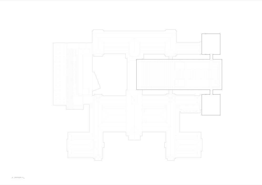 The crystal spine diffuses with the central axis through enclosing a part of the courtyard by the glass ‘Jewel Box’. The 63 feet high ceiling of Shapiro Family Courtyard formulates a lofty breathing space reinforced by a blissful sunshine and the interplay of outside greenery. The courtyard holds spaces for visitors’ orientation, a café and a new gallery for the special exhibitions underneath. A new-state-of-art Alfond Auditorium with a capacity of 150 guests is placed right beside it. A new landscaping approach is applied for the long abandoned park designed by Friedrick Law Olmstead in 1877. The new greening followed Olmstead’s romantic tradition of winding paths and informal planting which invites the green into the heart of the building. The vegetation acts as nodes to the different galleries while composing a successful indoor-outdoor relationship.