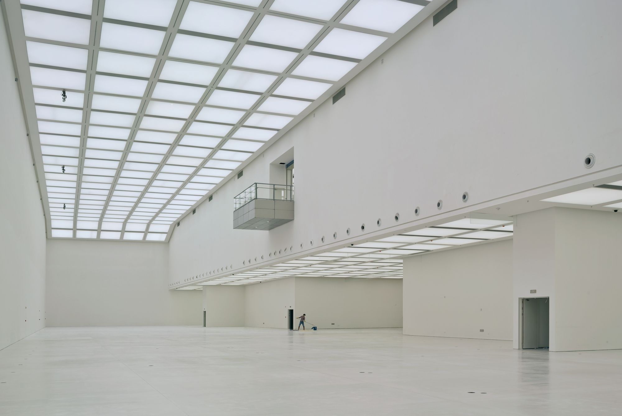 The wide spans allow for column-free and flexible exhibition halls of heights reaching 17metres.The atrium between the two volumes serves as the main circulation area with ramps and escalators. This also serves as a public plaza while providing access to other facilities like the cultural services block, the library and café, bookstore and museum store.