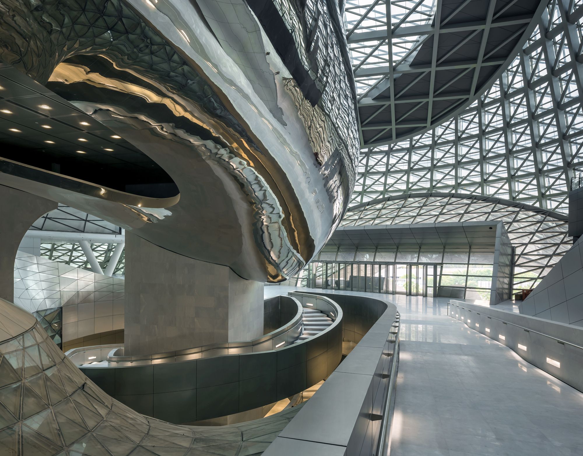 The 80000 metre square museum with its transparent façade and interior lighting allow for an interior – exterior communication putting in evidence the main circulation atrium between the two volumes. This also permits unhindered view from the inside on the cityscape whiles giving the visitor the impression of being in a shaded outdoor area.