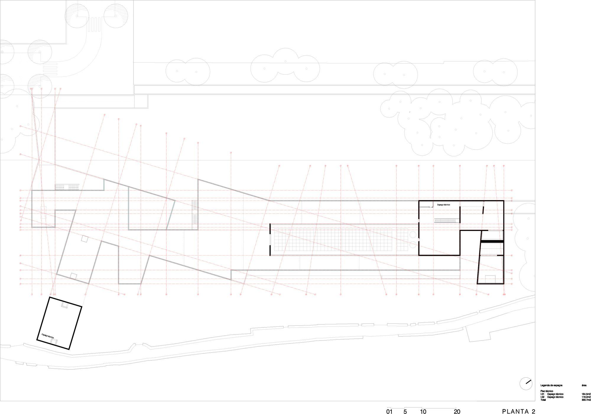 c) the northeast top of the building includes a control and security center, a hoist (3,45×2,5m), a service staircase, a reception and access to the archives (northwest); restrooms, a staff room and administration areas (southeast); a plastic arts room and Nadir Afonso studio (with zenithal light and river view).