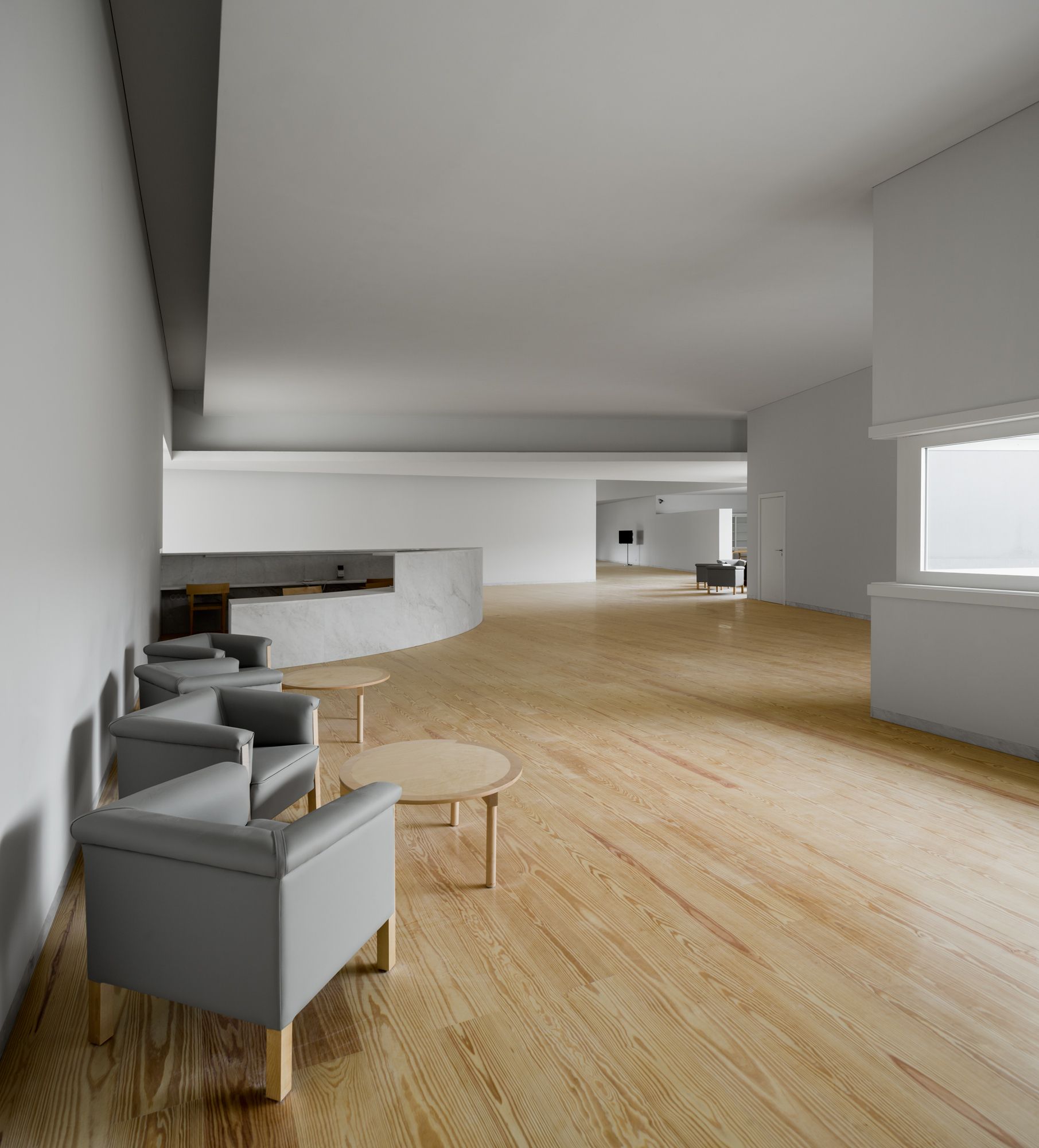 In the upper floor, which can be accessed through the control and security center, there is a set of technical spaces (interior and exterior balcony), from which is made easier the access to the skylights and to a second technical space located over the auditorium.The building is built with apparent structural white concrete walls; the roof is covered almost completely with pebbles, and the top of the skylights and the machine room is covered with zinc plate. The essential interior finishes will consist in wood floors, plasterboard on the walls and ceilings and white marble on the water zones. The interior window frames will be made of wood and stainless steel; the exterior ones will be made of wood and aluminum.
