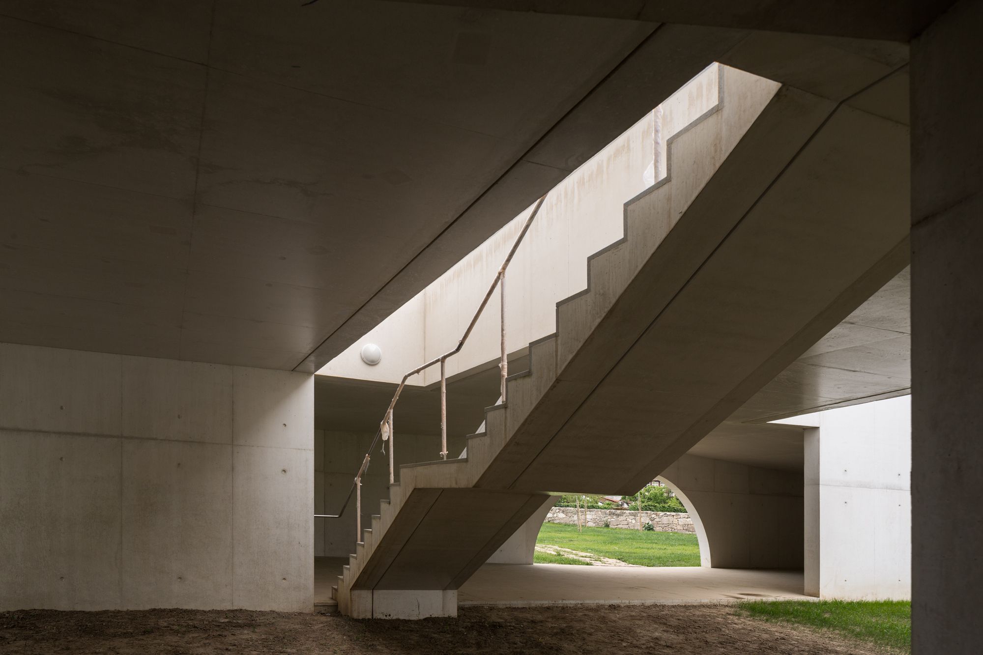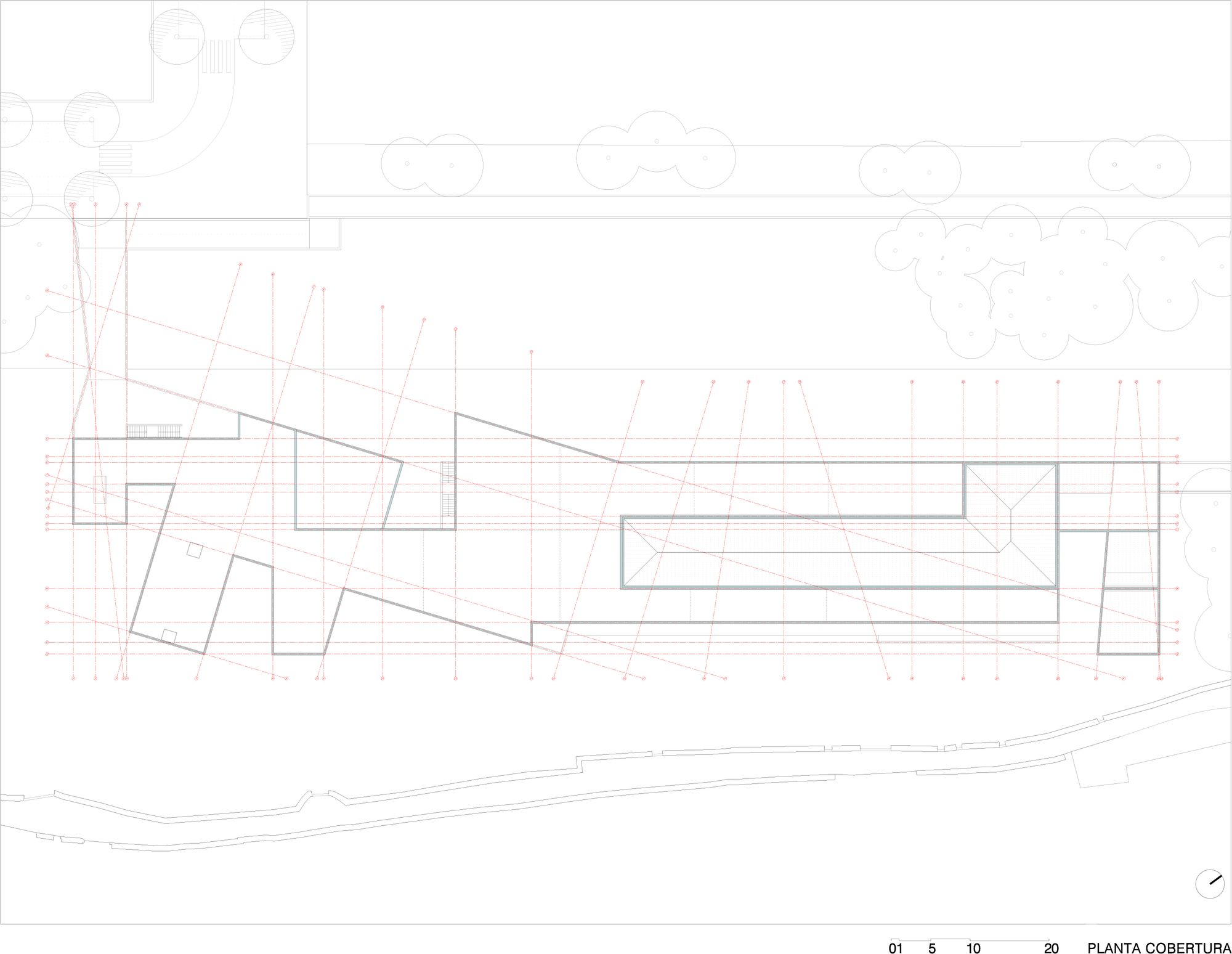 The Nadir Afonso Foundation, built in the city of Chaves, in a terrain located on the right bank of the Tâmega river, had its detailed planning elaborated within the ambit of the Polis programme.The area destined to the building is located at the place of Longras, in the civil parish of Santa Maria Maior, and was established in the plan as a rectangle parallel to the riverbed, inside the future marginal park, between the new footpath/bike lane parallel to the 5 de Outubro avenue (northwest), the Dr. Mário Soares avenue (northeast), the new street layout parallel to the Longras street (southwest) and the river (southeast).The main floor of the foundation building is placed over a concrete platform, 351,50 height, supported by walls perpendicular to the river, in order to prevent an eventual flood. The risk of an eventual flood should not be excluded. The height difference between the northwest street layout and the natural terrain is balanced by means of a ramp with a slight slop.