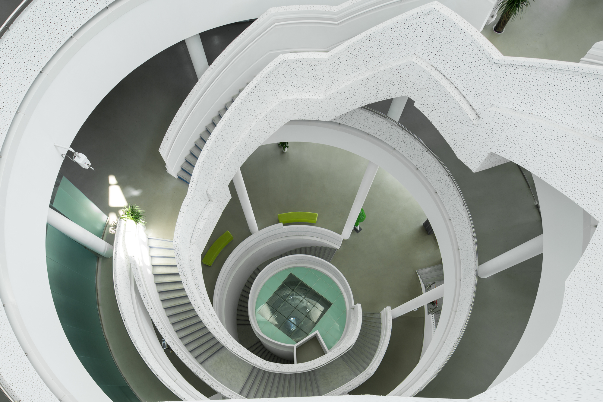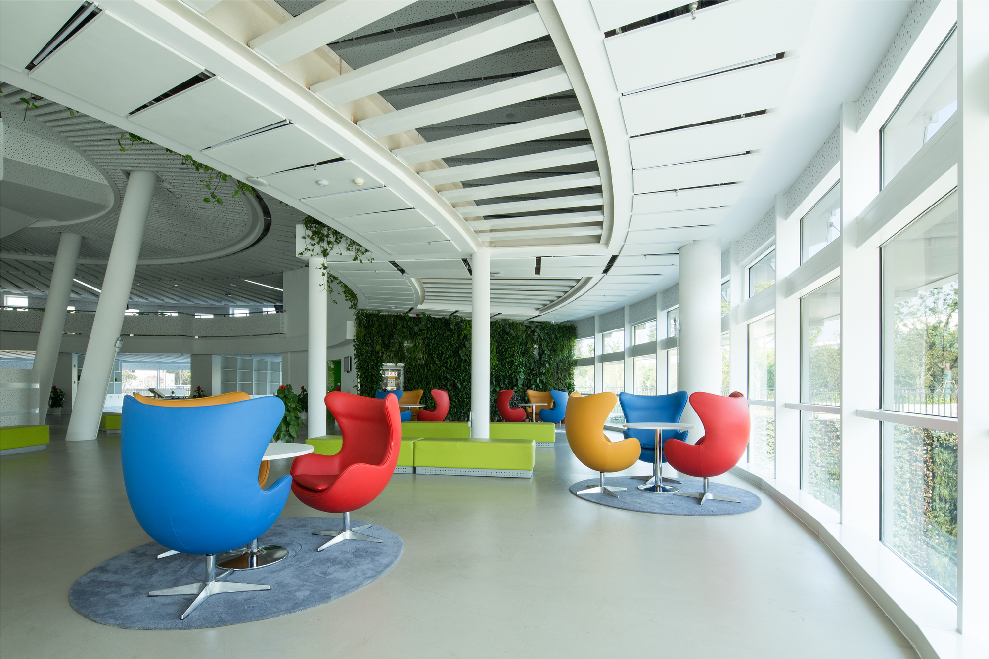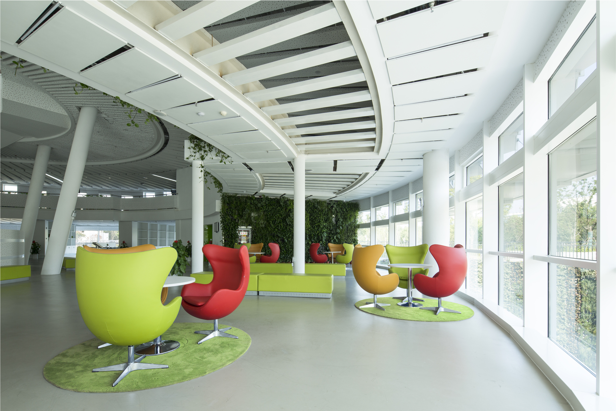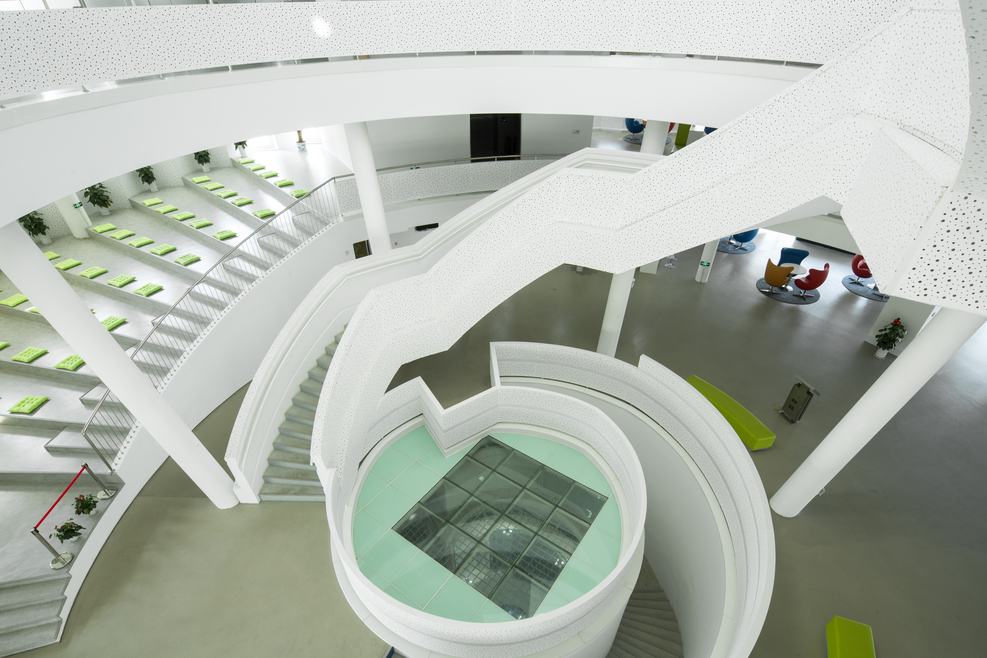 A combination of efforts; the circular building with the meandering façade turning window openings away from the direct heat of sun, the daylight horizontal reflectors on windows, an inner atrium receiving daylight from the carefully orientated skylights etc. all sums up to a softly lighted interior. Natural ventilation, interior greenery, open transparent interiors and natural bright materials compliments a work place as living exhibition enjoyed everyday by the users.