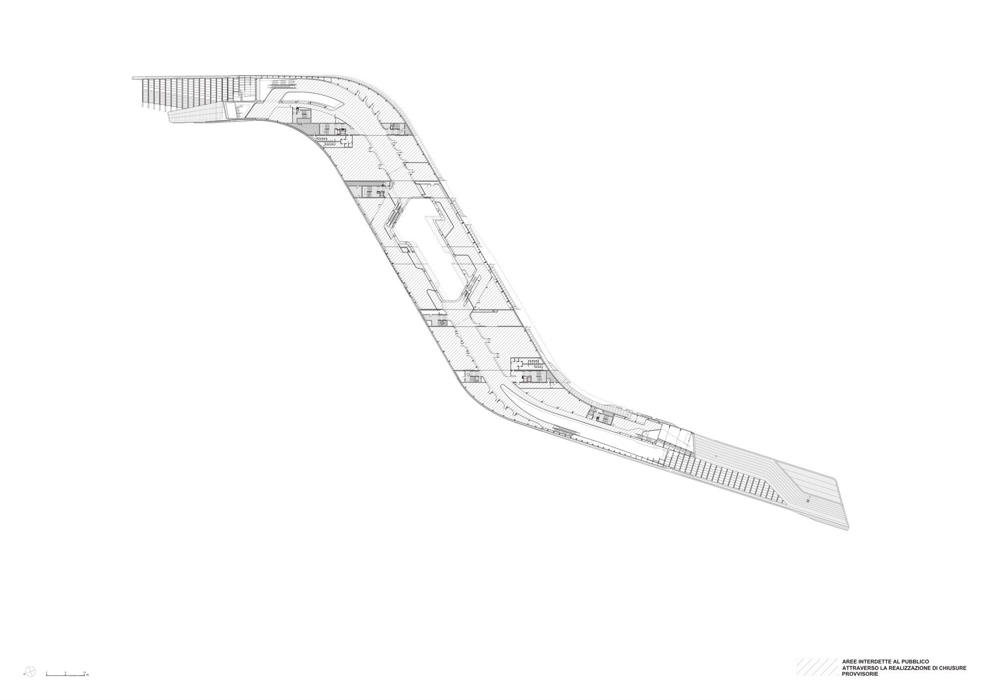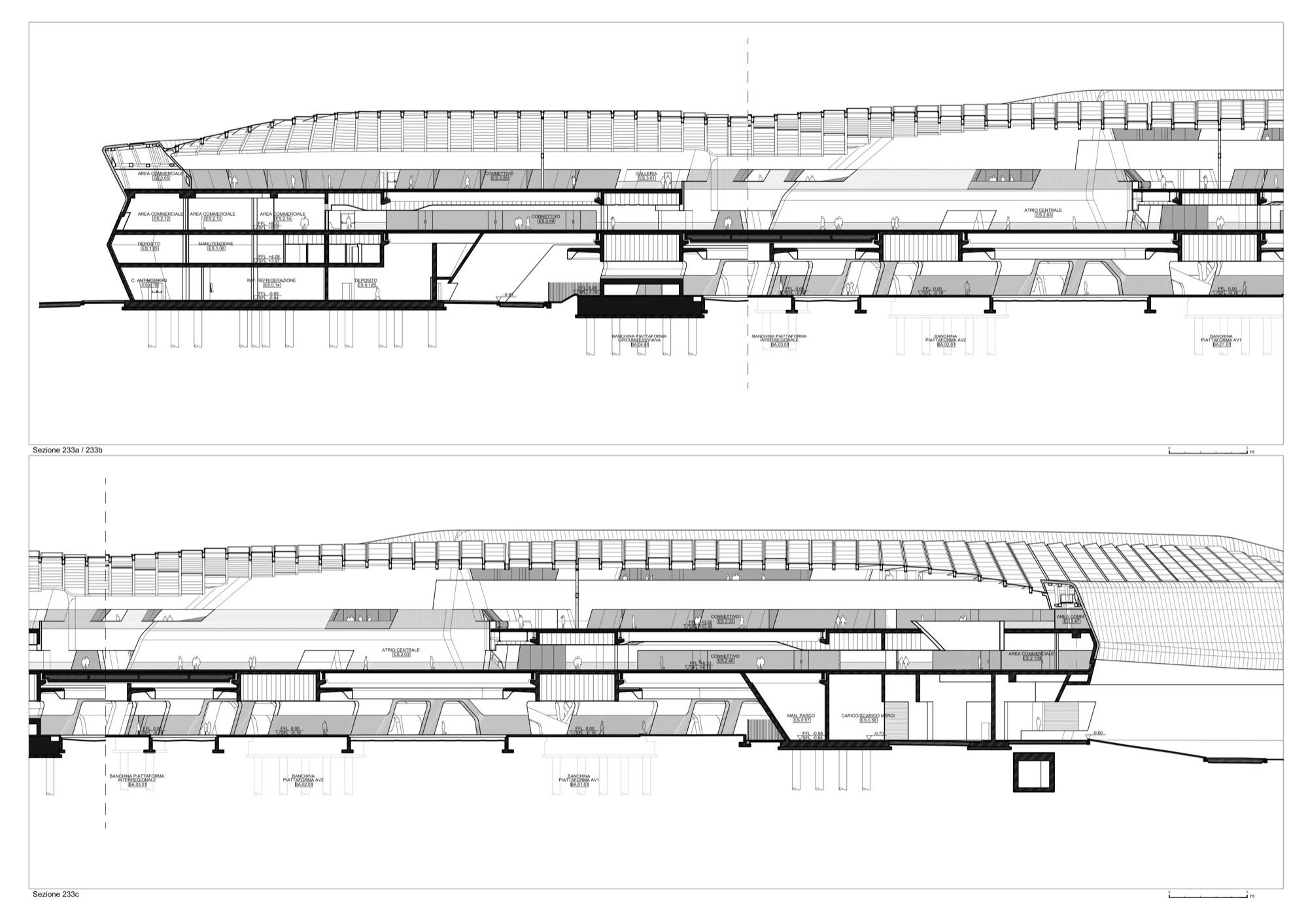 The concept of the New High Speed Station Napoli Afragola, designed by Zaha Hadid Architects , emerges from the idea of enlarging the overhead concourse, required to access the various platforms, to such a degree that it can become the main passenger concourse itself. The architectural language proposed, geared towards the articulation of movement, is pursued further within the interior of the building, where the trajectory of the travelers determines the geometry of the space.