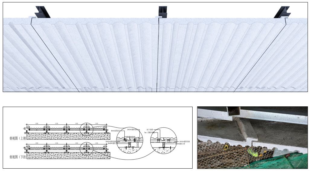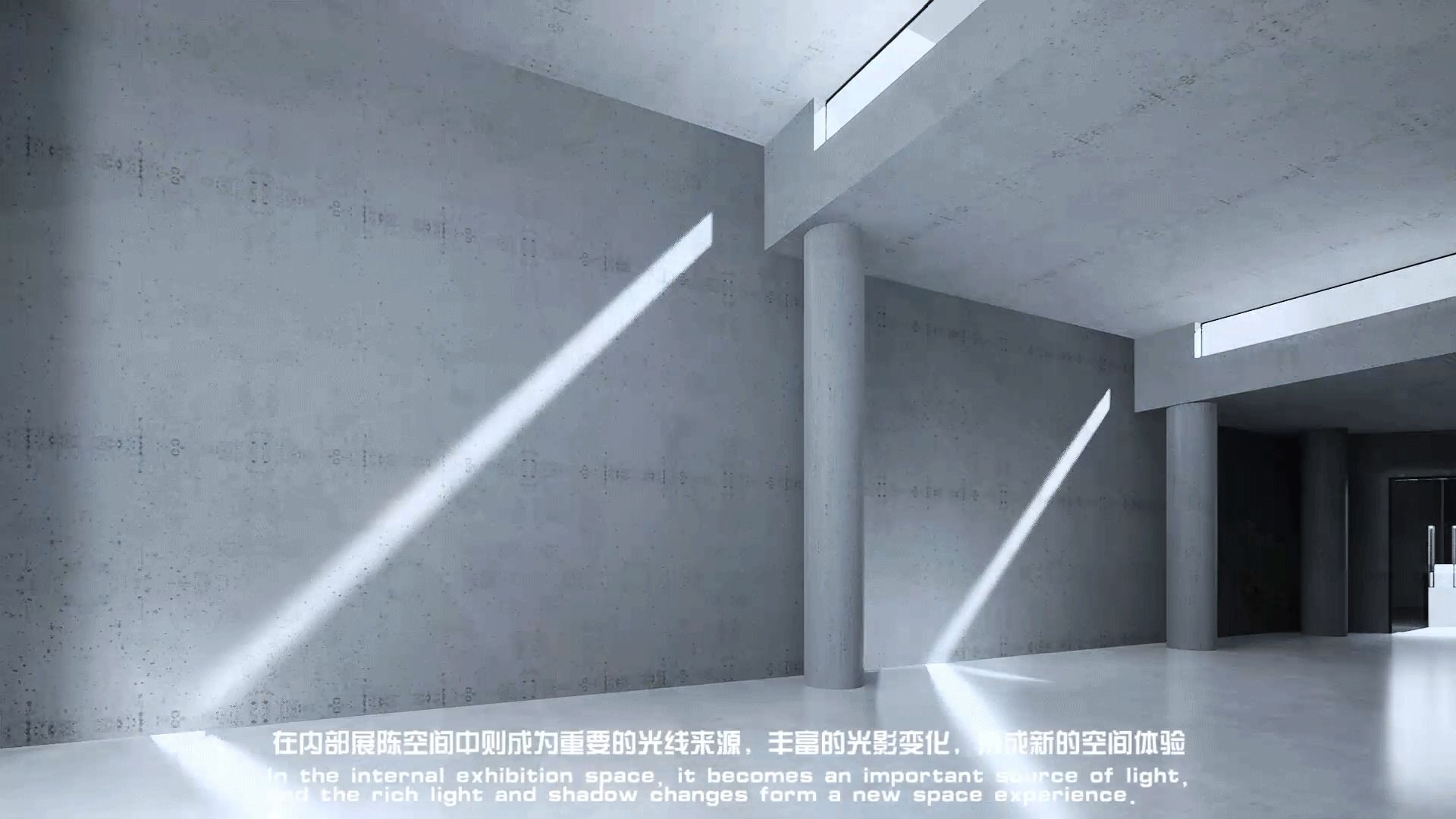 The fifth facade of the entity is the extension and enlargement of the park interface; the vertical interface of the roof park slope naturally forms the linear lighting window of the lower exhibition hall. The internal wrapping space, formed after the enclosure, is the solid part of the entire exhibition space, the generation of the entity and the park in one go. The original concrete floor is broken.