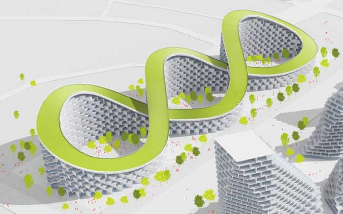 Plot B in the proposal has a residential district referred as ‘Infinity Park’. The plan of which is like an extended diagram of the infinity symbol. This community like the previous one, aims to achieve a variegated mix of residential densities by duly incorporating sustainable features like continuous rooftop gardens, climate responsive facades and resource efficient organization. The curved skyline of the design brings together low-rise and mid-rise typologies. Termed as ‘winding residential wave’, the sinuous profile of the entity provides great views and meeting spaces with amenities and greenery both.