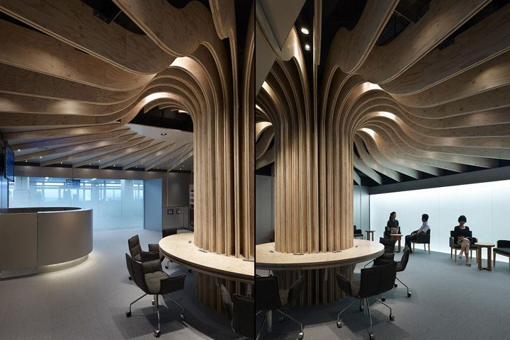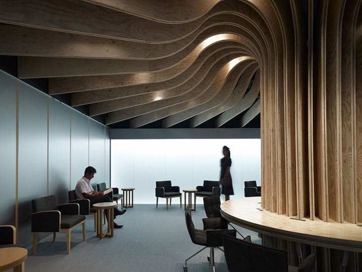 Takao Shiotsuka has recently revealed his drawings for a lounge inside the Oita Airport in Japan. The proposal features curvy wooden ceilings that cover the whole lounge and look amazing through carefully placed lighting. The furniture is great for relaxing and doing work on central desks.