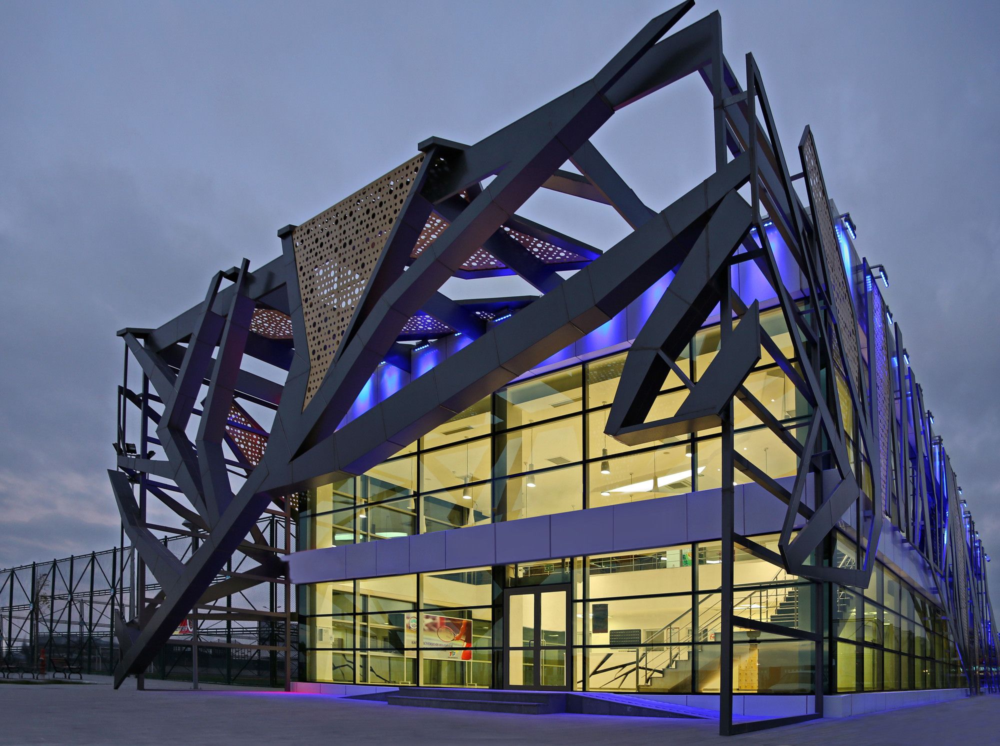 Inspired by the branches of a tree reaching out towards the sun, the facade of the building gives a feeling of positivity and growth to the sportspersons. Clad with glass on all edges, the building looks outwards while at the same time provides an unhindered view inside and presents a great balance between what’s open and enclosed. The only enclosed space in the entire building are the locker rooms and a few offices which form the main core of the building.