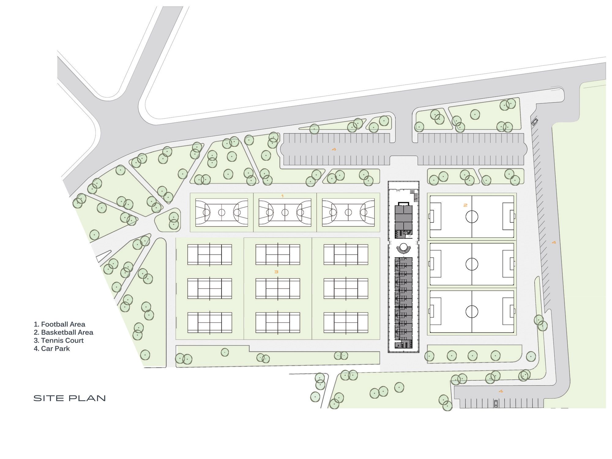 With this brief in mind, BKA designed an Open Sports Complex over an area of approximately 500,000 square meters consisting of 9 Tennis Courts, 3 Basketball and Volleyball Courts, 3 Mini Football Grounds and a Central Service Hall.