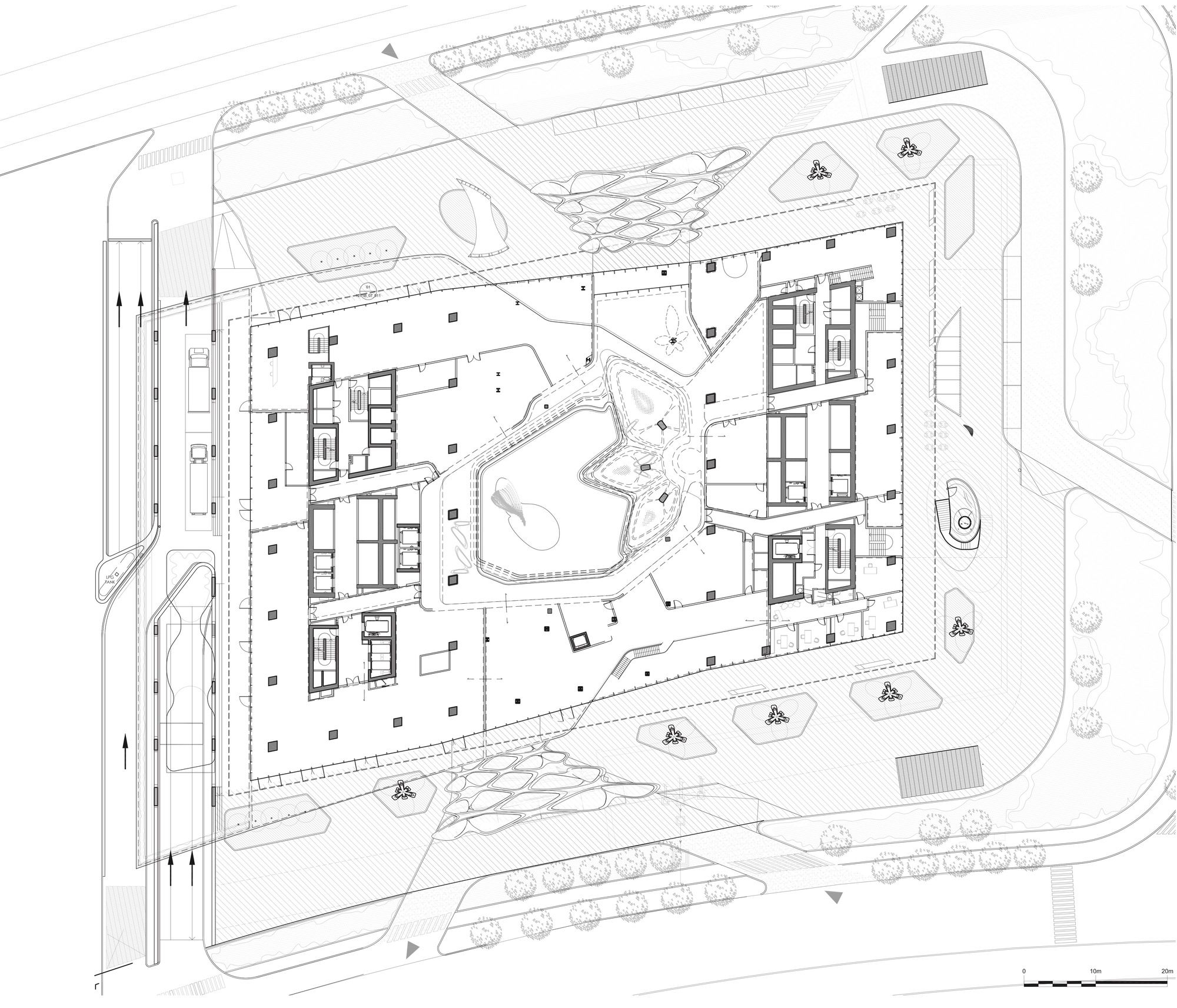 Within the building, ground floor space is developed as a transparent open field with multiple interlays of the different pathways, which are drawn into the interior of the plan areas within the two separate lobbies. Each lobby opens out to the four sides of the plot, maximizing the accessibility of the building from the ground level. A traffic artery is diverted under the building to provide full car access and easy drop-off areas. Ground level retail areas are organized in two zones, forming an outer ring which is accessible from the outside.