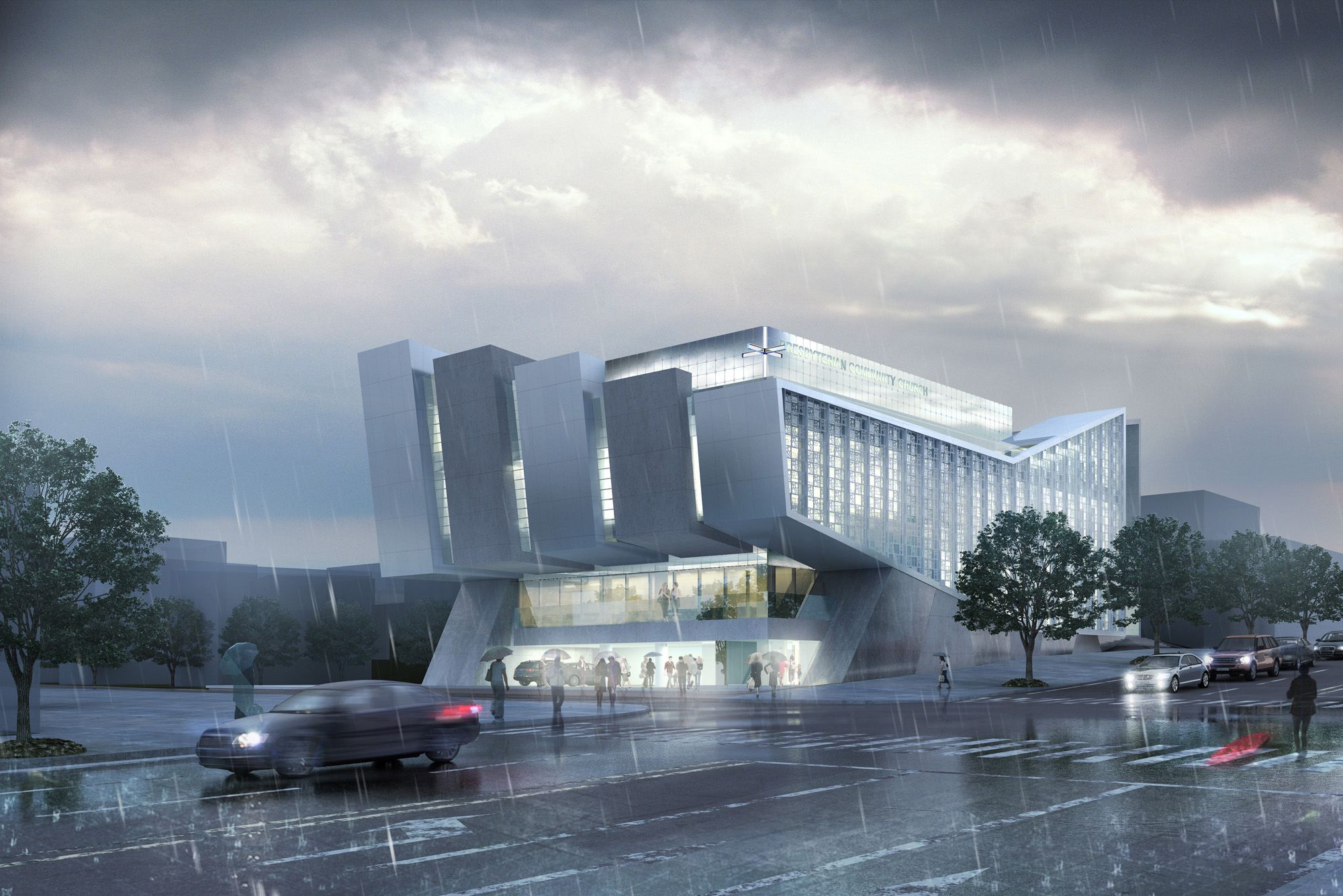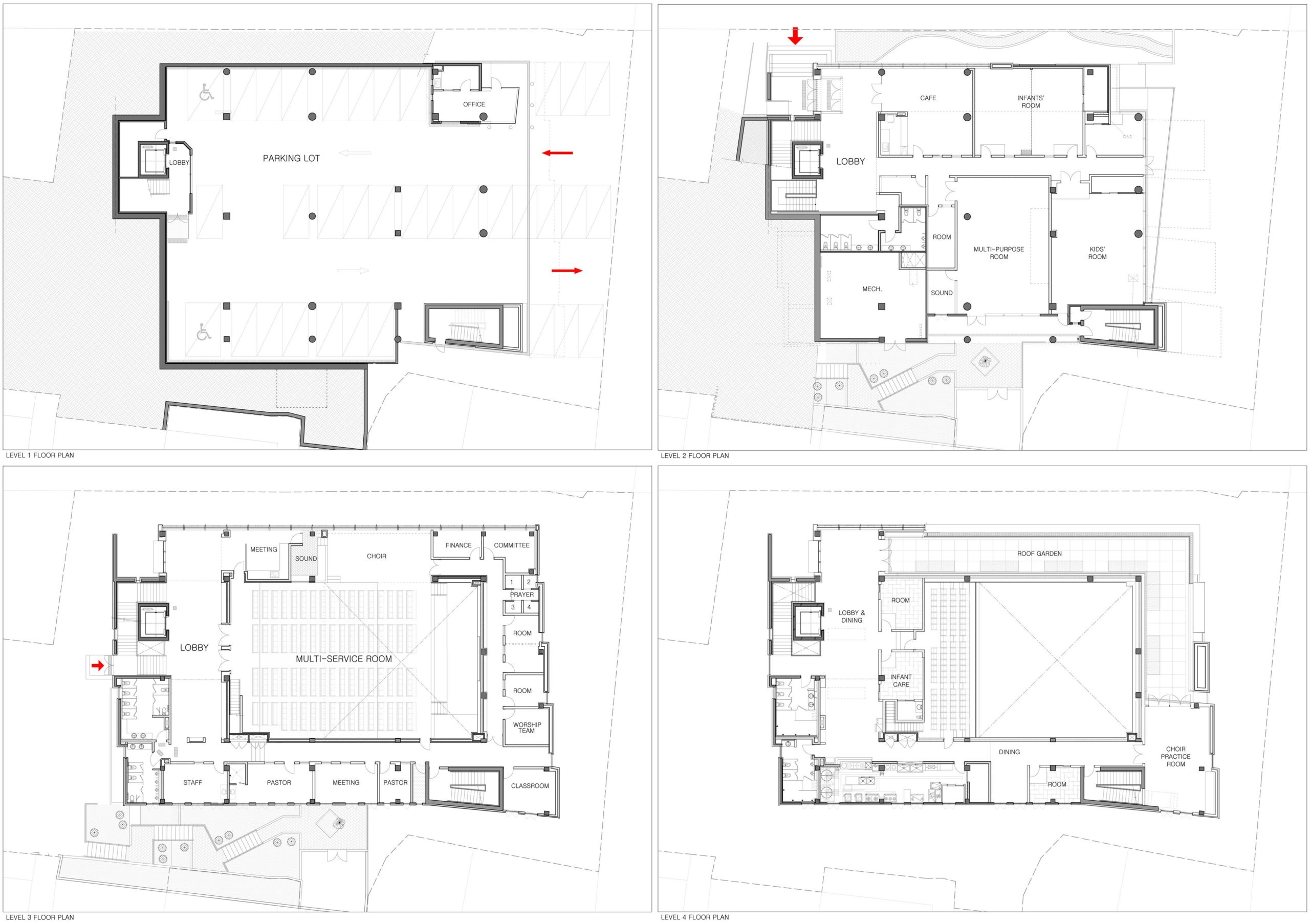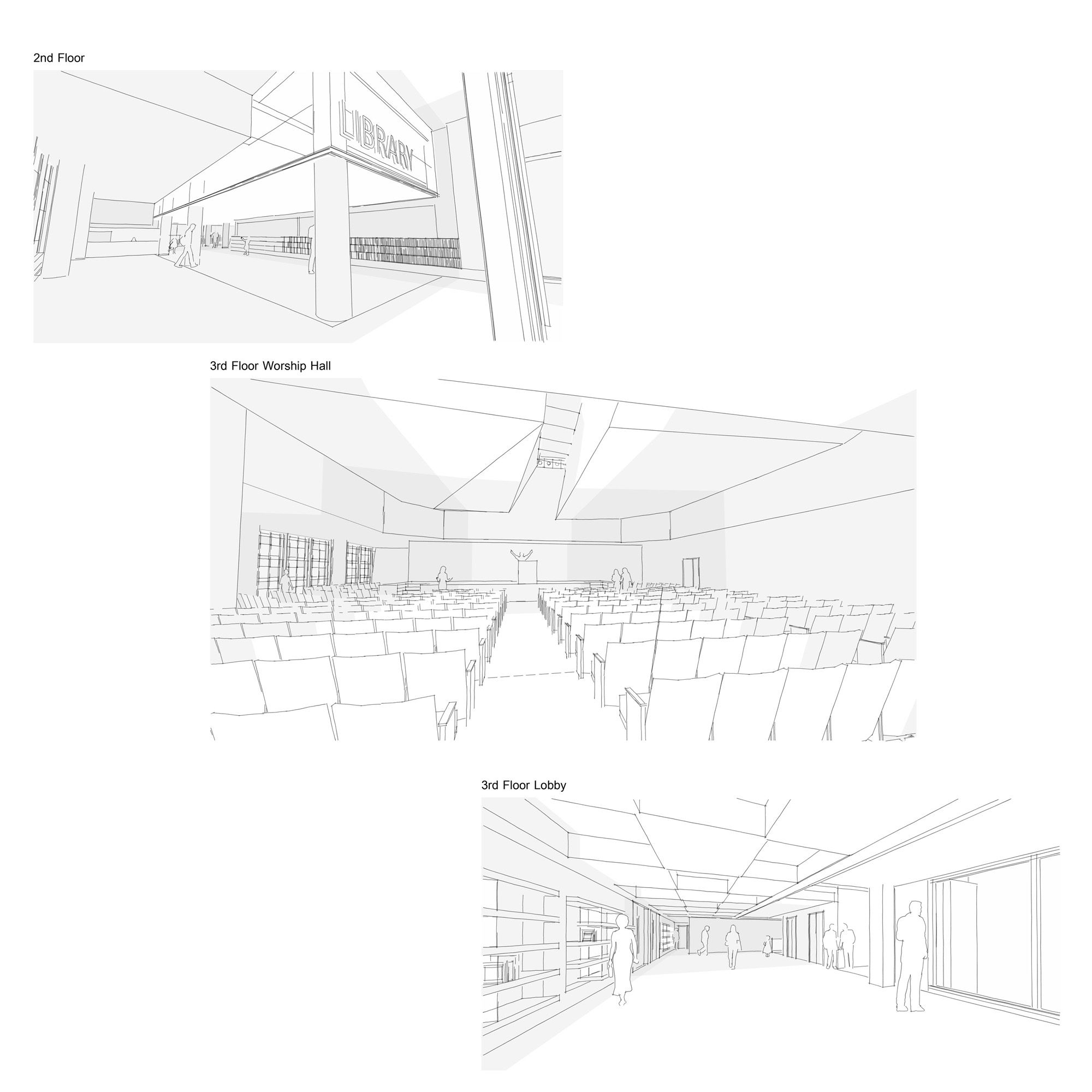 Based on the limited budget about 2.8 million USD for 3500sm size building; it was a big challenge to design the landmark in this region. The overall space requirement is separated into two major elements which are parking area, 900sm, and non-parking area, 2600sm. On one hand, the parking grid was mainly applied to limit the design for the utmost efficiency to maximize the space, and on the other hand, we had to interpret the church into another symbolic element to create the landmark in the town by differentiating the usual icon of church design in Korea, such as red bricks, symmetric plan, and the pointy roof and the cross at rooftop.