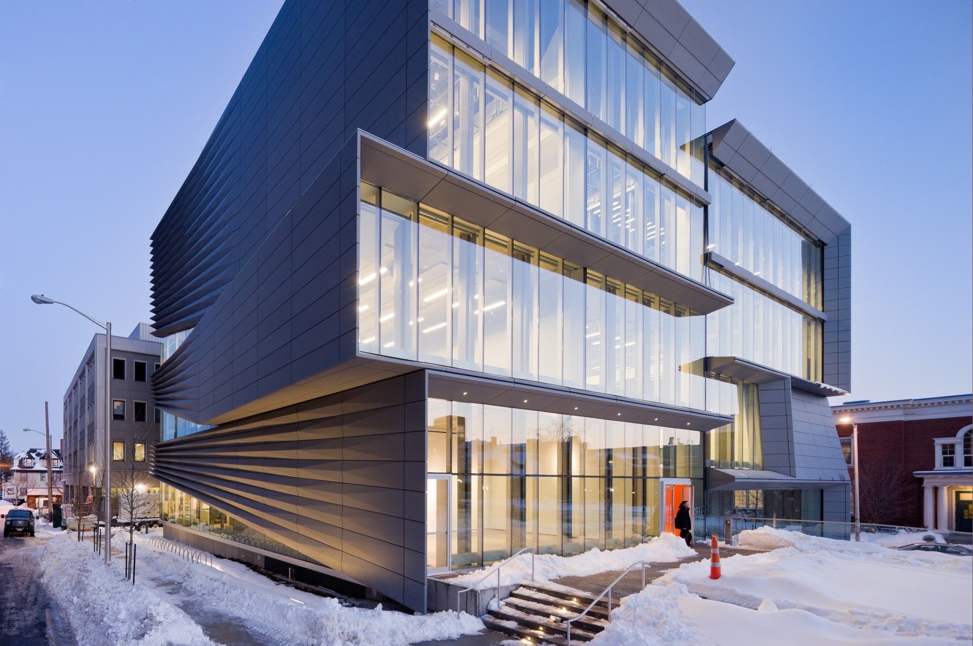 Break-out spaces named “Living rooms” cantilevered into atrium space and located off of a connecting stairway and furnished with comfortable furniture and equipped for presentation. A building-wide audio-visual network with a central “brain” that supports the simultaneous capture and projection of AV information from space to space. Multi-use lobby/event space. Two elevators – one dedicated to the Granoff Center and the other to the adjacent Brown Office Building (BOB) loading dock. An underground connection to the adjacent Brown Office Building. Full height glazing facing The Campus Walk, a series of linked green spaces that provide a central pedestrian connector between Brown’s historic campus and the Pembroke campus. An outdoor amphitheater situated with the view into the Recital hall and wired for sound and video and with motorized outdoor projection screen, allowing outdoor performances, film screenings, summer movies, and installations and integrated with the building data and audio-visual network for simultaneous projection and view into the auditorium. Zinc metal exterior rain screen folded around windows for the view from Angell and Olive streets. Public gallery program and temporary exhibitions. Art walls at Angell Street entry.