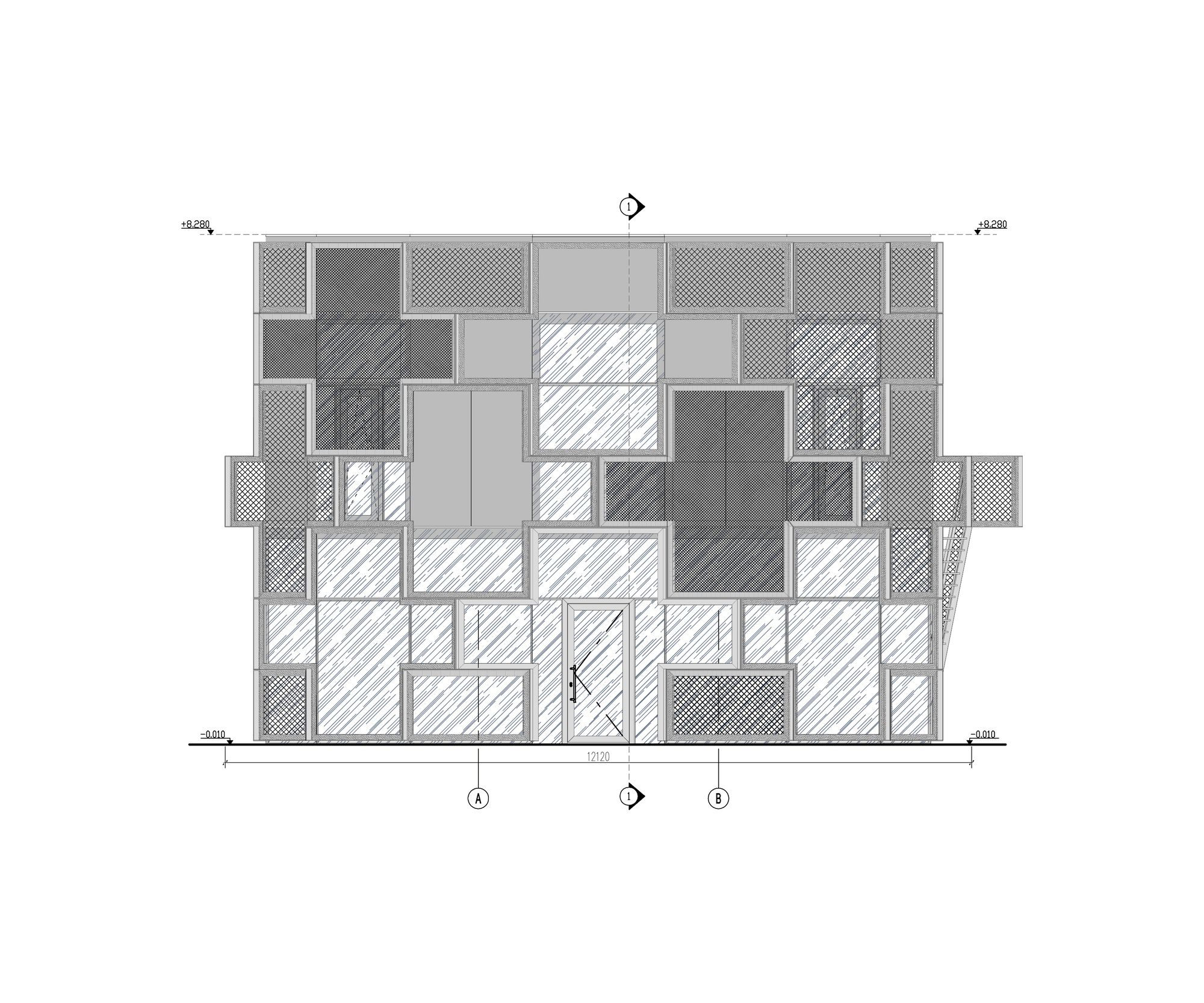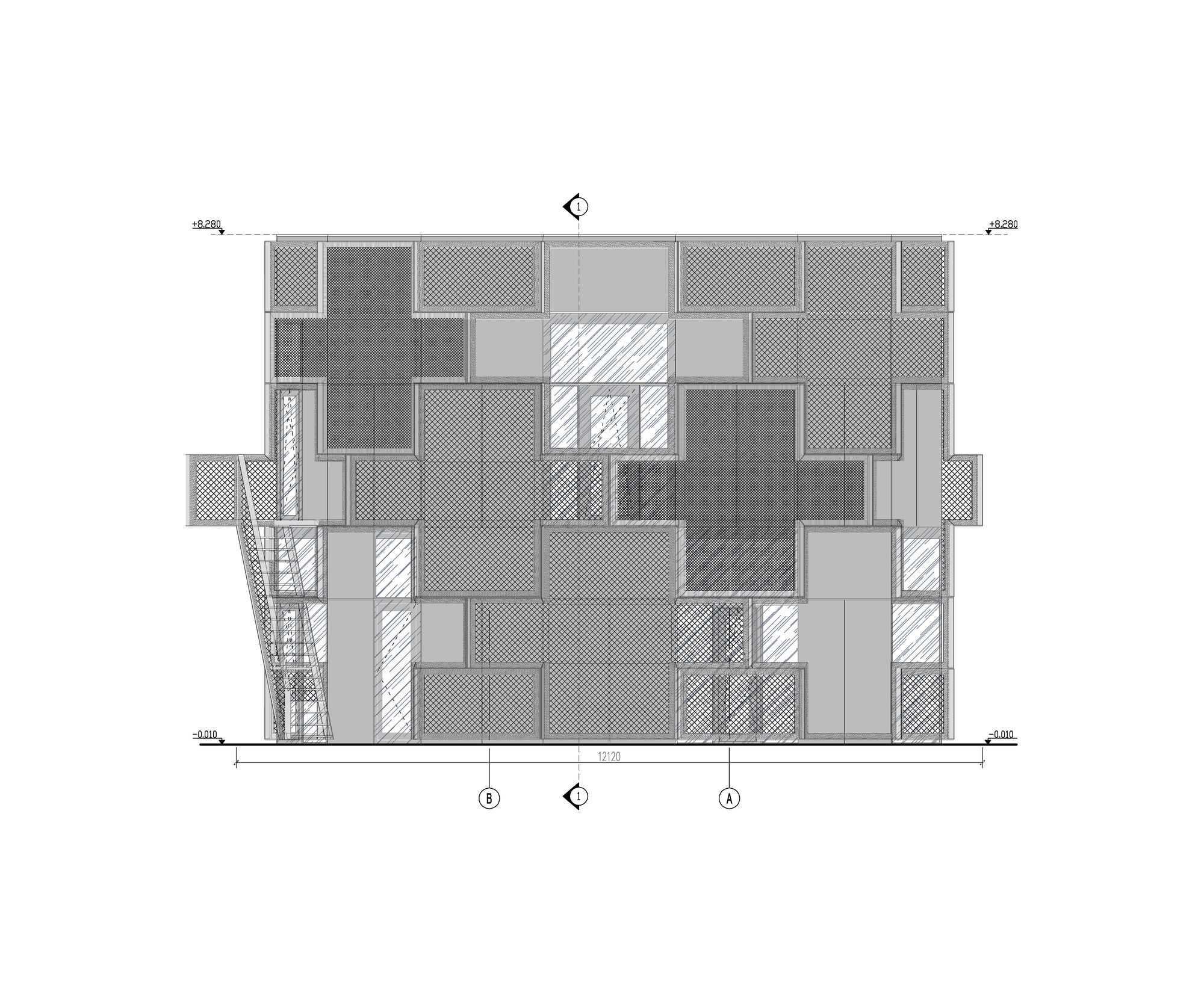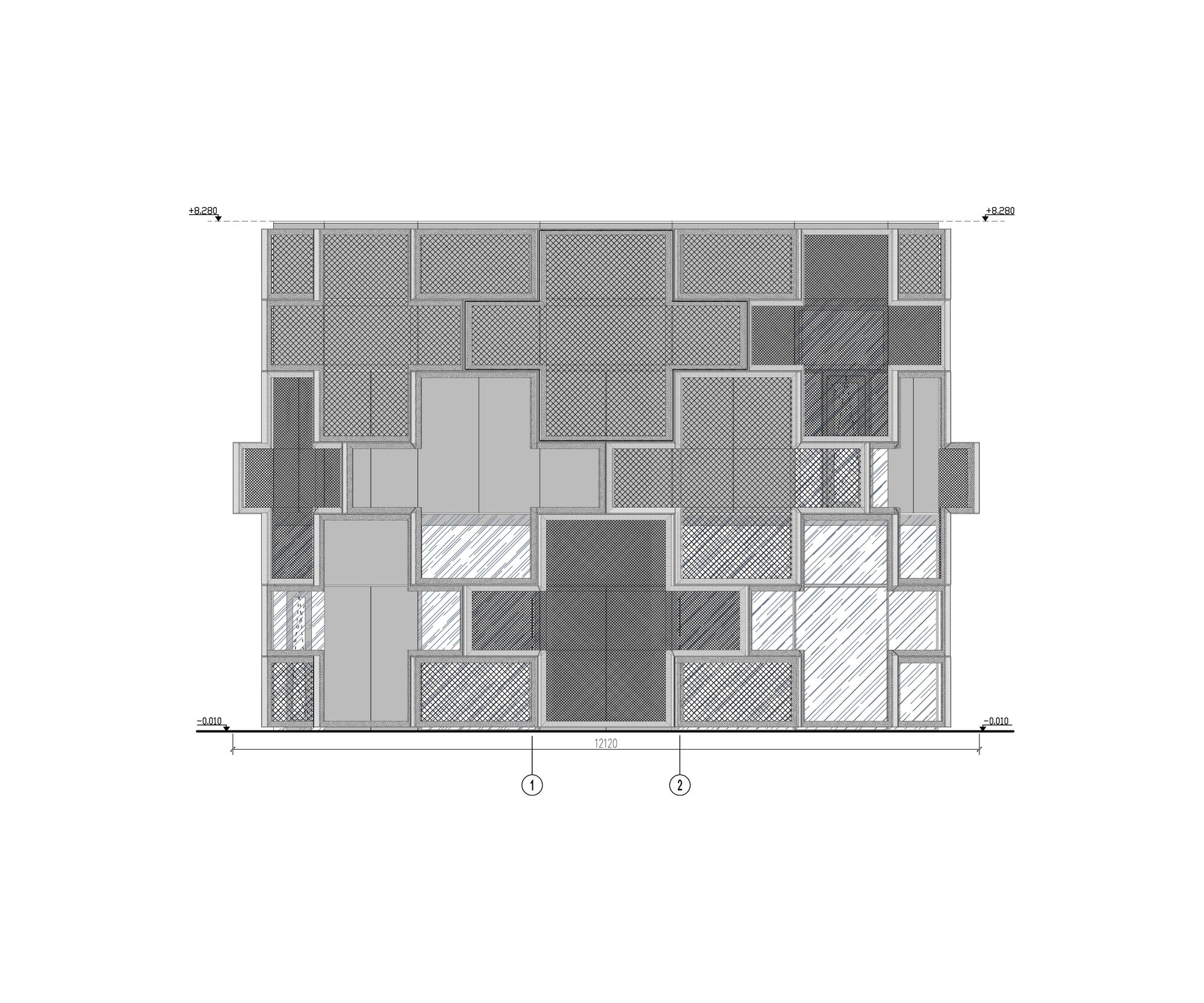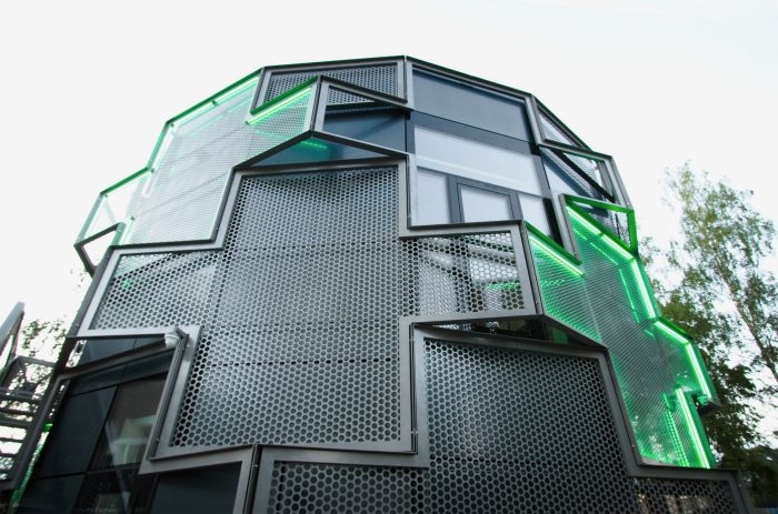 The building’s bearing construction is based on four columns of reinforced concrete. The columns located in the middle of the building make the perimeter of the building fully subordinated to the parametric pattern of the façade installation. In contrast to the visually saturated metal frame, the façade of the building made as simple as possible – with structural glazing and composite panels.