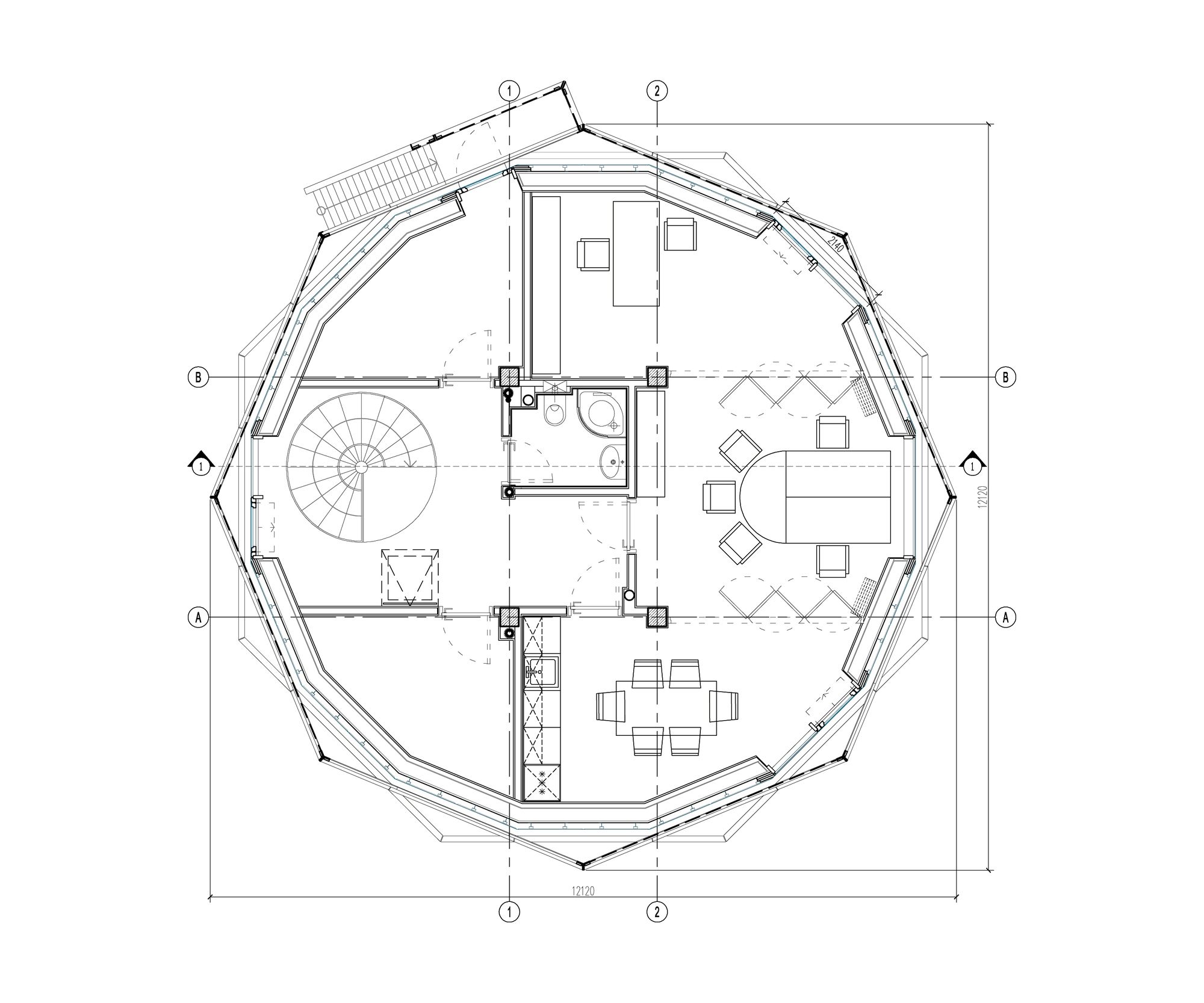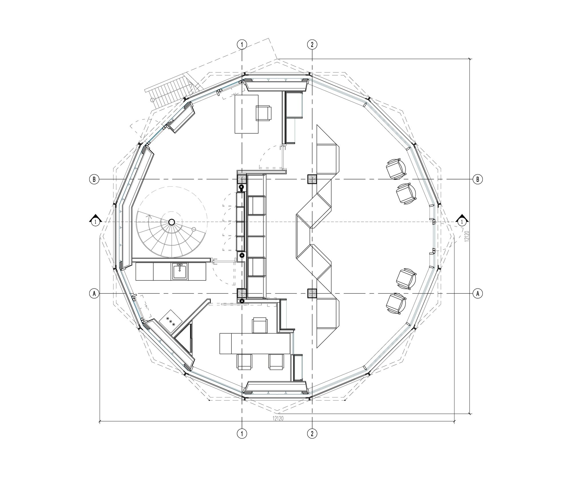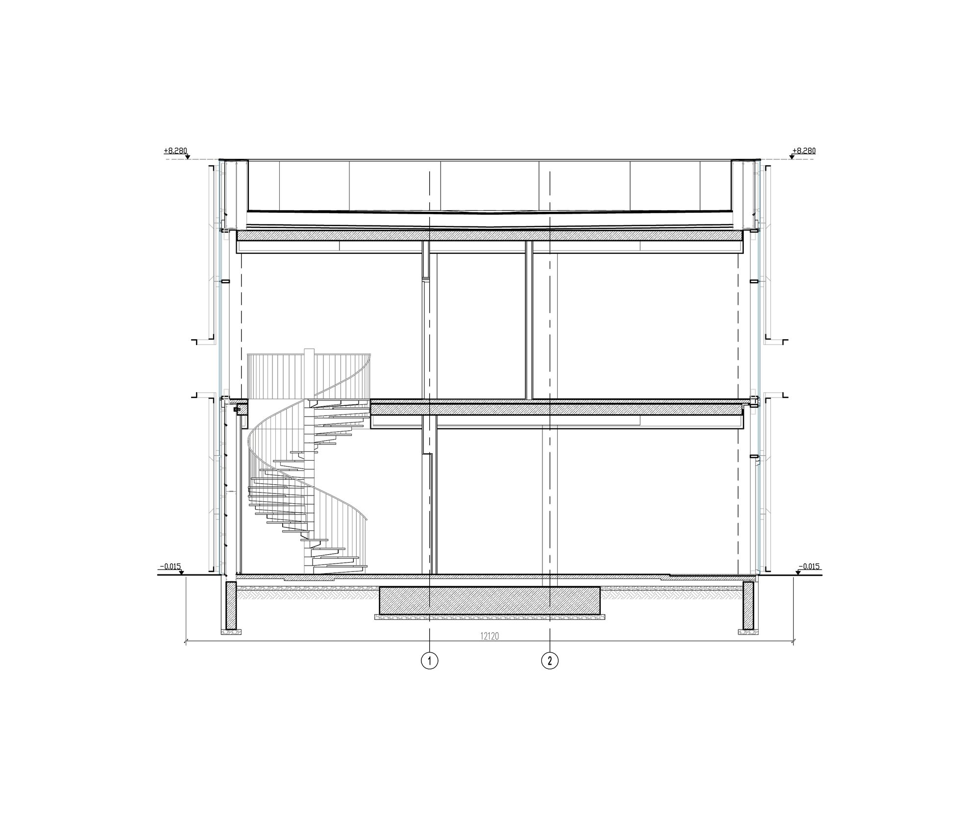 The building’s bearing construction is based on four columns of reinforced concrete. The columns located in the middle of the building make the perimeter of the building fully subordinated to the parametric pattern of the façade installation. In contrast to the visually saturated metal frame, the façade of the building made as simple as possible – with structural glazing and composite panels.
