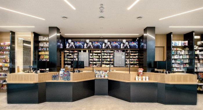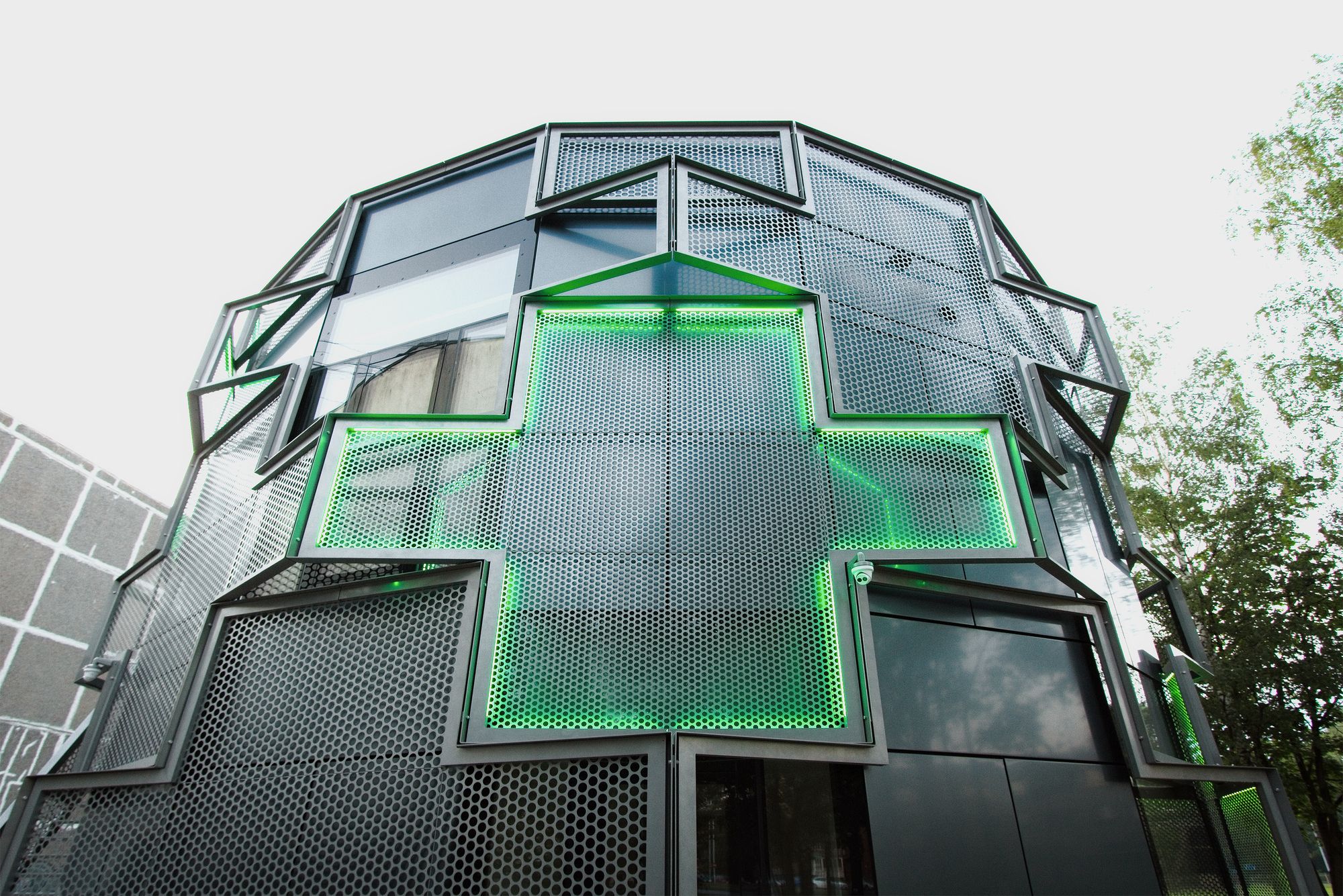 In order to ensure the functionality of the newly created facility, the installation was designed with reference to the pharmacy, which would be easily recognizable from the potential buyers of drugs and other medicines. The building’s façade installation frame uses the traditional pharmacy symbol – a cross as a module that would be left open or filled with perforated aluminum panels depending on the needs of the inner plans of the building.