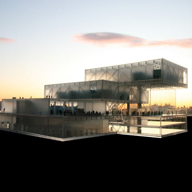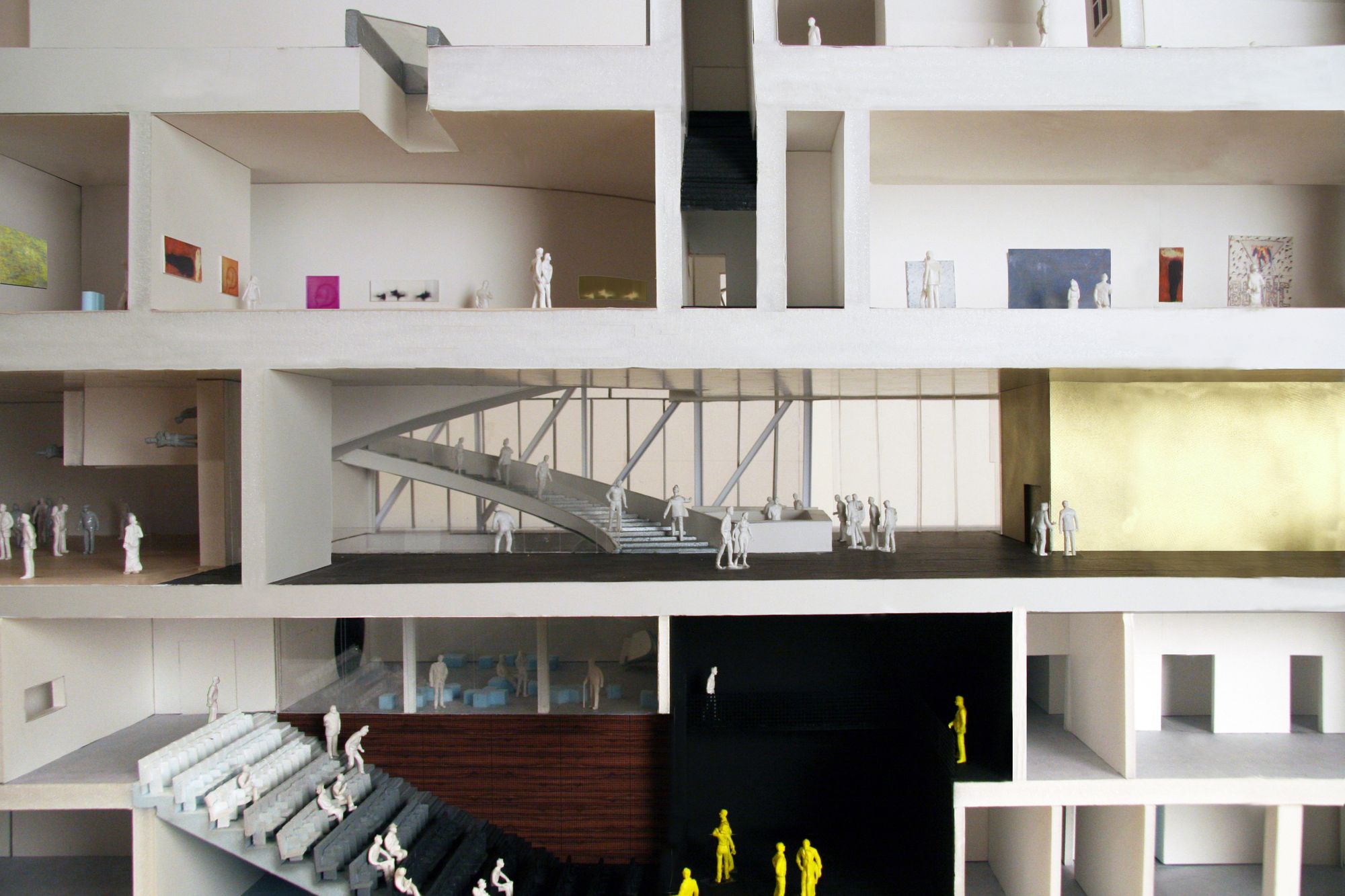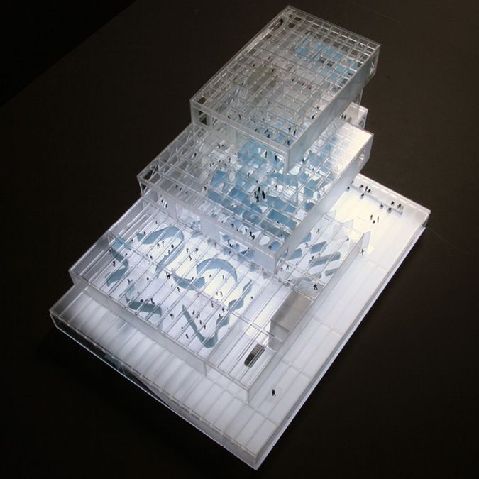 Complementing the quiet reflection of the gallery spaces, a chain of programs along the museum’s edge—foyers, lounges, shops, bridges, gardens—offer a hybrid of activities, art, and public promenades. Along the way, orchestrated views from a monumental spiral stair and an exterior pop out stair reconnect the visitor with the park, the city, and the rest of the museum. Within the boxes, mezzanines and overlooks link the temporary and permanent exhibition spaces. On top of each of the gallery boxes, roof terraces provide space for outdoor displays and activities.