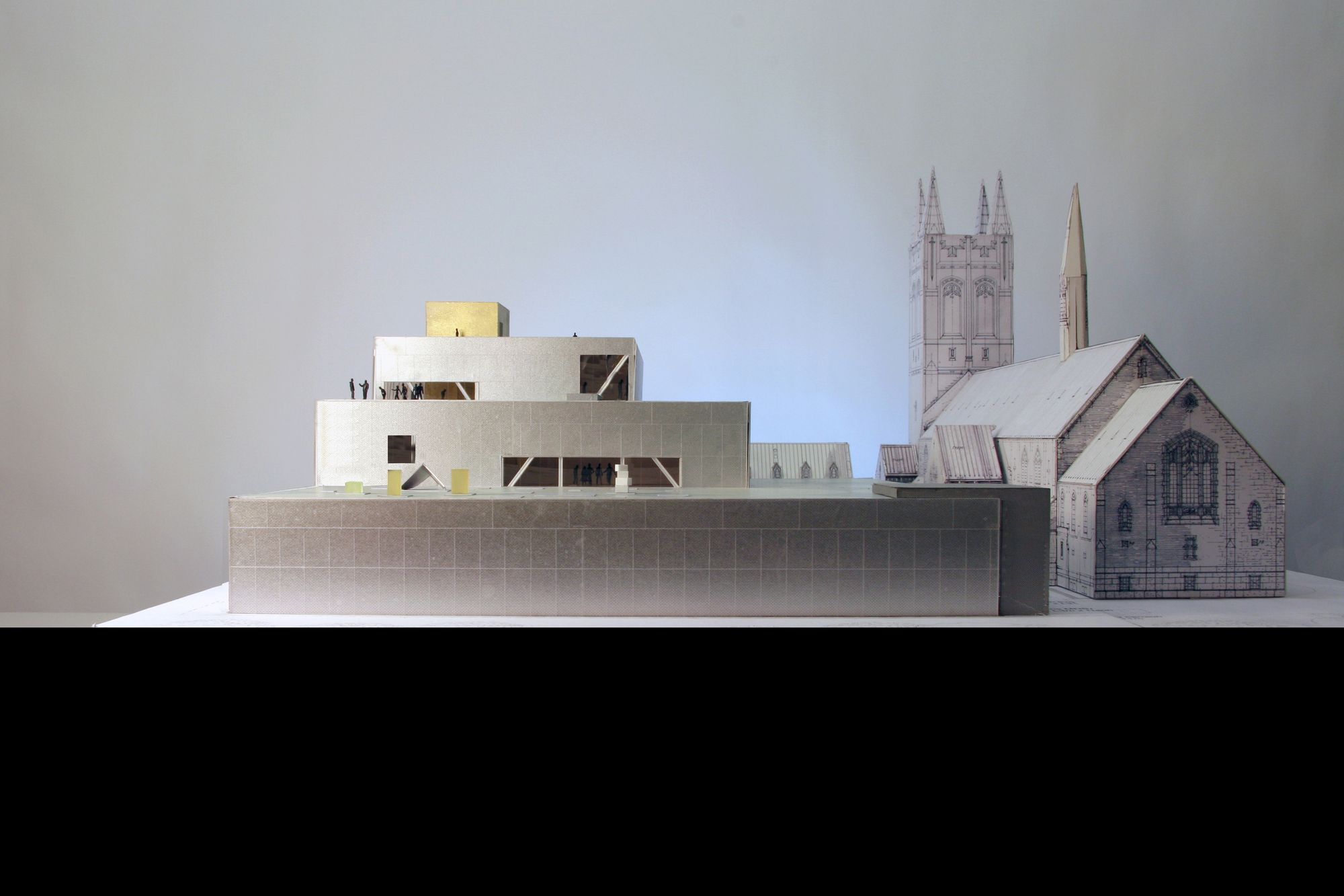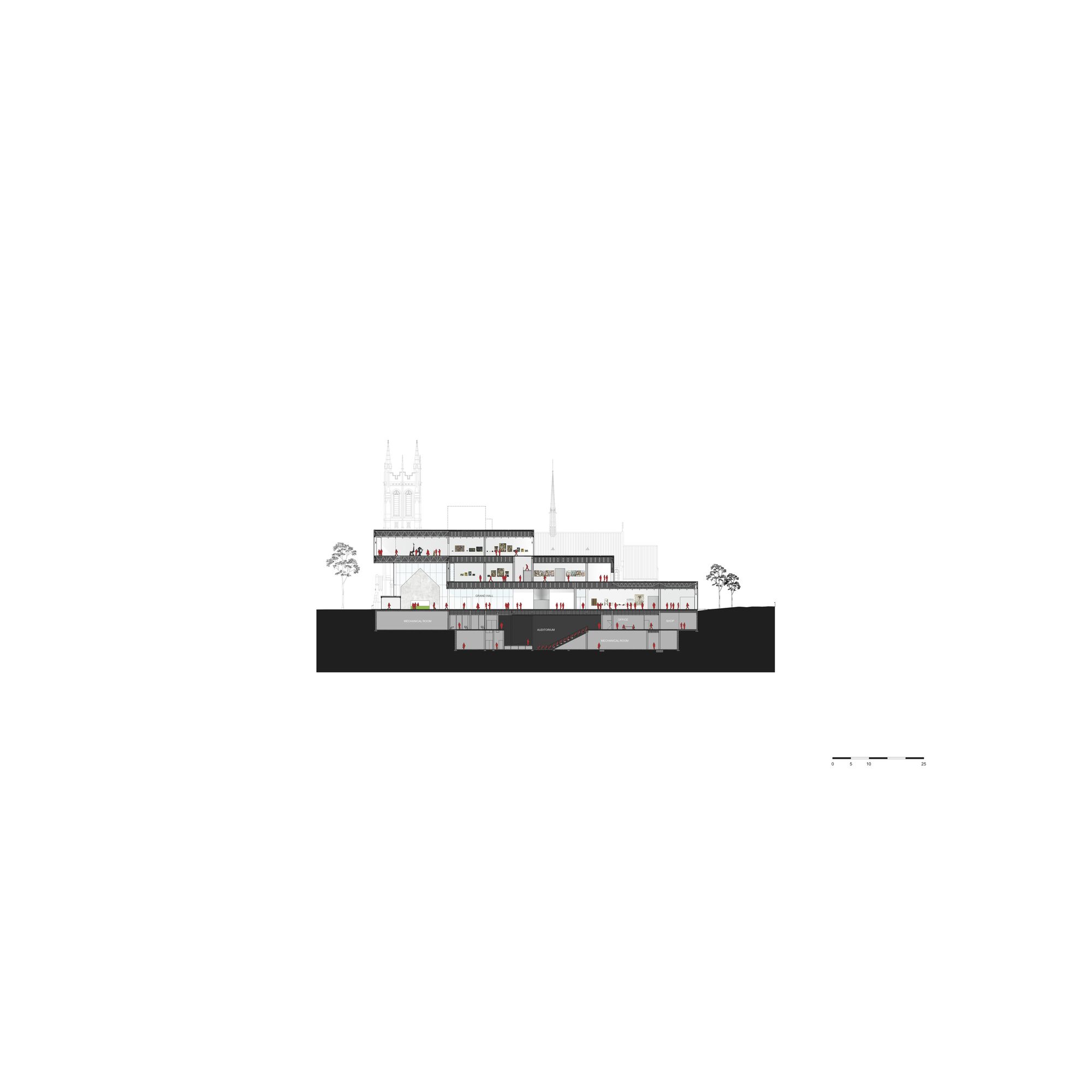 While they step down in the section, the gallery boxes step out in the plan, framing the existing courtyard of the church cloister and orienting the building towards the park. The park spills into the museum (through skylights and carefully curated windows) and the museum into the park (though the extension of exhibitions to the terraces and the outdoor pop-out staircase).