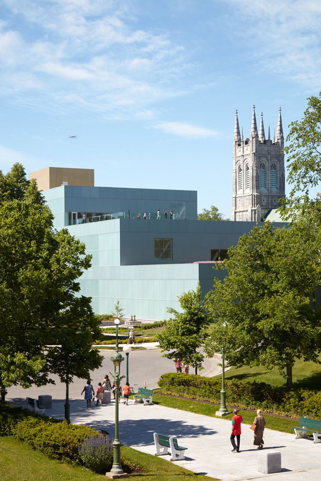 The intricate and sensitive context of the new building generated the central questions underpinning the design: How to extend Parc des Champs-de-Bataille while inviting the city in? How to respect and preserve the Saint Dominique church while creating a persuasive presence on Grande Allée? How to clarify the museum’s organization while simultaneously adding to its scale?OMA’s solution was to stack the required new galleries in three volumes of decreasing size to house temporary exhibitions, permanent modern and contemporary collections, and Decorative Arts and design, as well as Inuit artworks, creating a cascade ascending from the park towards the city. The building aims to weave together the city, the park and the museum as an extension of all three simultaneously.