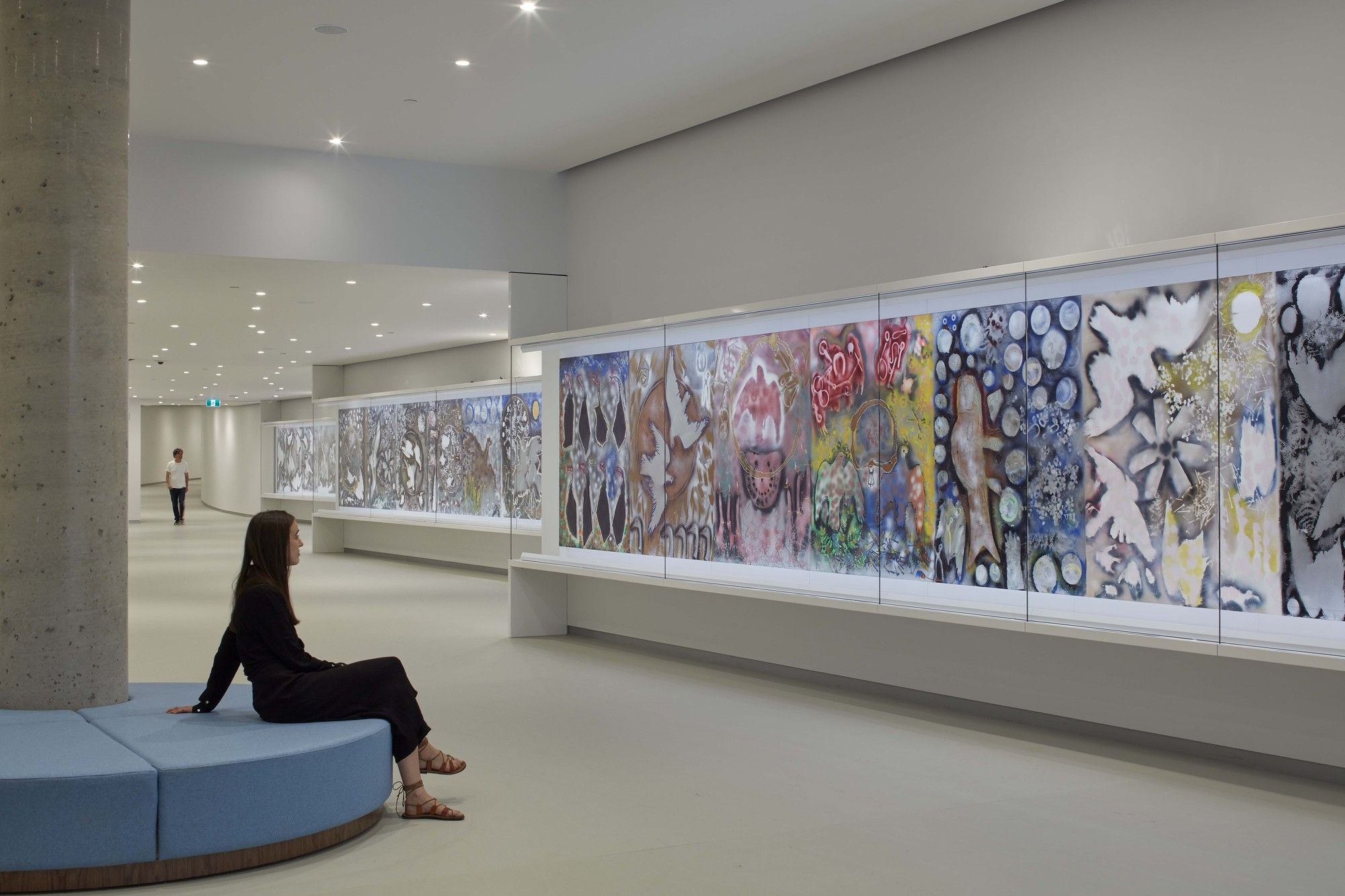 New exhibition spaces are connected to the museum’s existing buildings by a 130m (427 ft) long passageway, creating a permanent home for the museum’s 40m (132 ft) “Hommage à Rosa Luxemburg” by Jean-Paul Riopelle. Through its sheer length and changes in elevation, the passage creates a surprising mixture of gallery spaces that lead the visitor, as if by chance, to the rest of the museum complex.