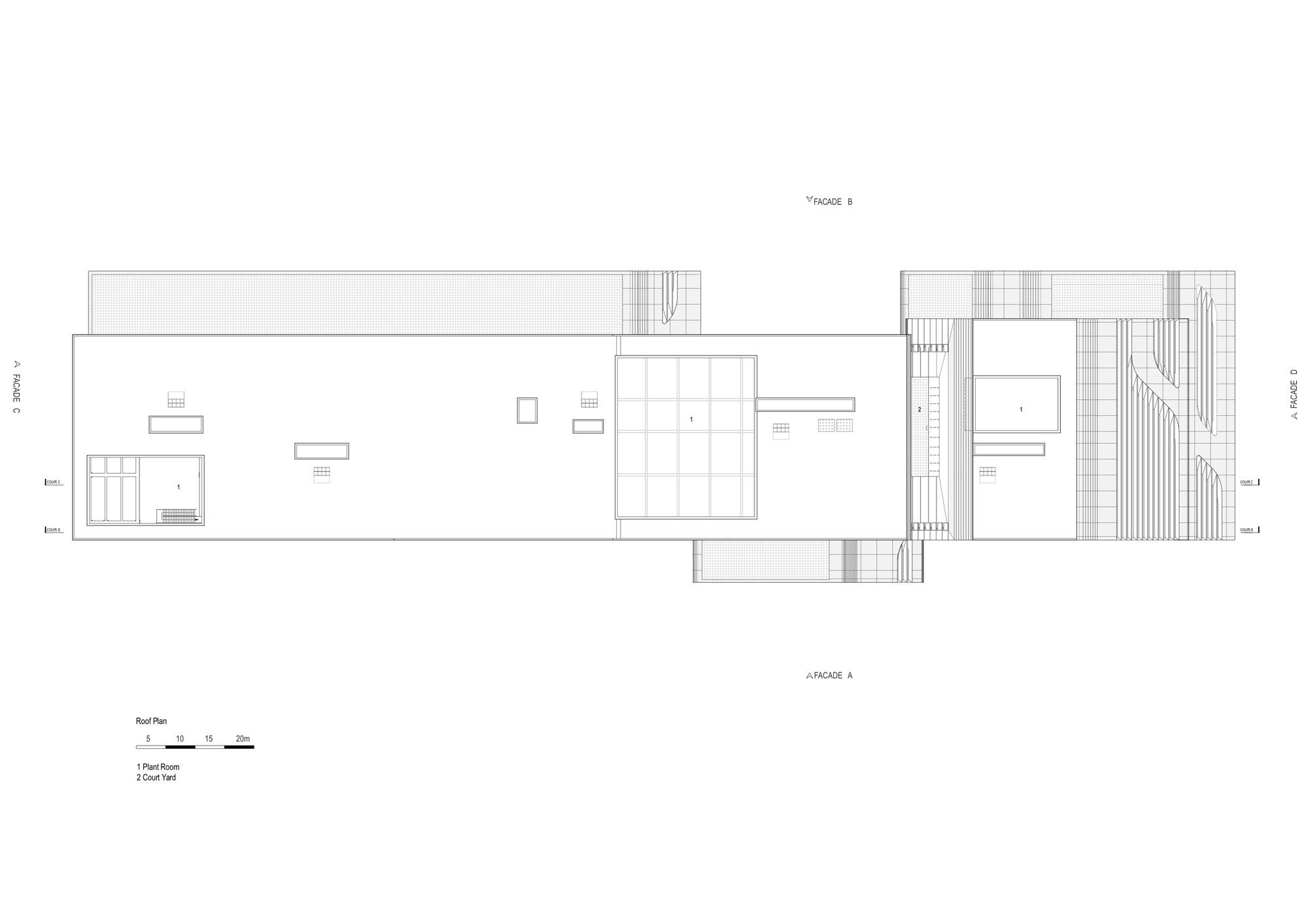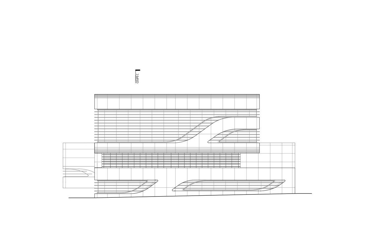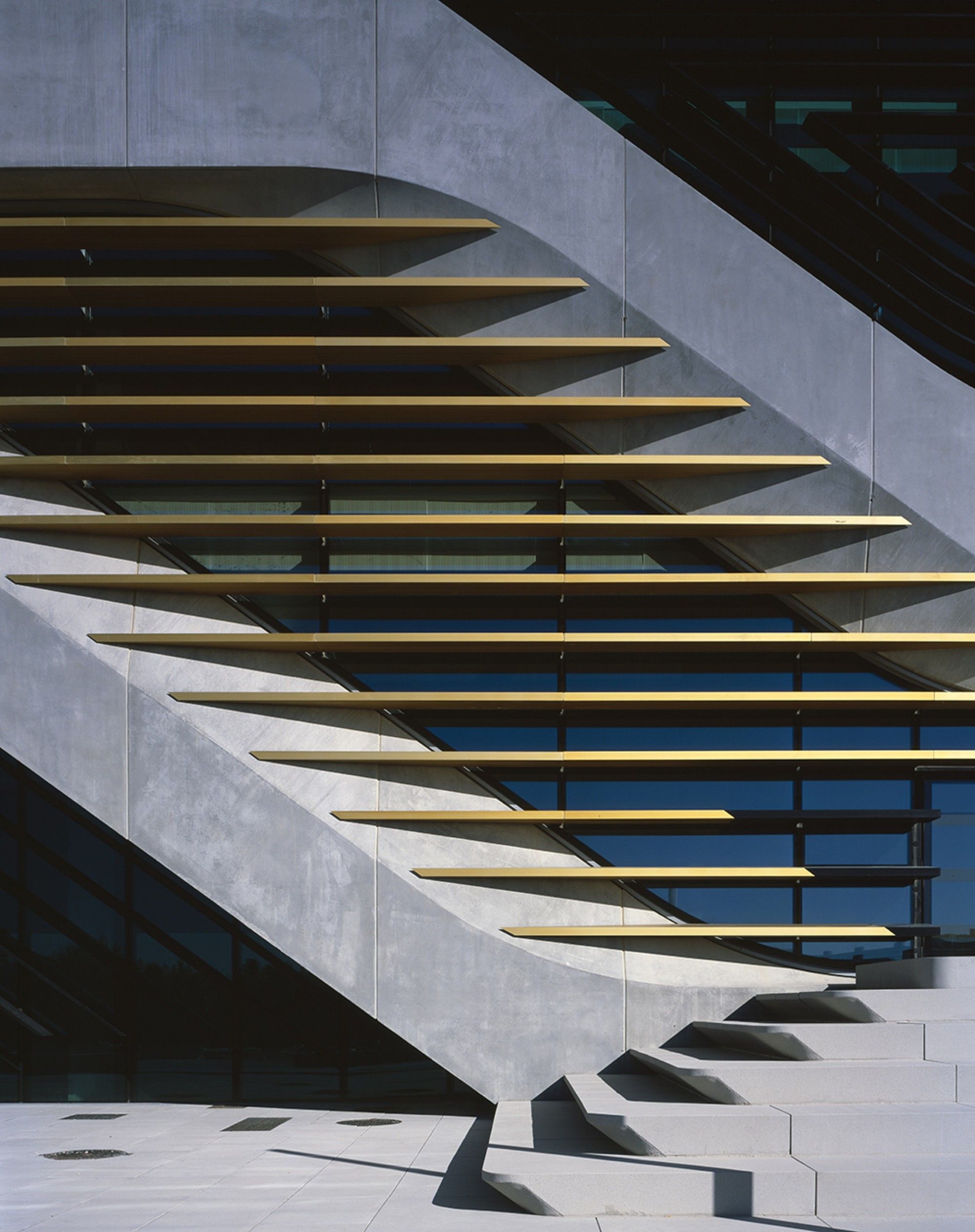 The building was built using a functional and economic design. The resultant design was to place a large tree trunk structure laid horizontally on the site. The archive is located at the solid base of the trunk, followed by the slightly porous area, the library and then the sports area. This area is more open and illuminates offices at the end where the trunk splits and becomes a much lighter part. These various parts of this building share several functions at the heart of the building, with the auditorium and the meeting rooms combining in a huge cantilever canopy above the main entrance. Vertical branches from the main trunk articulate the entrances of the various institutions. All the public entrances are located on the western side of the building, whilst the service entrances for staff and loading bays are located on the eastern side. Despite this connective ground level, the three institutions are kept separate, each with its own vertical circulation area. In this way, the tree trunk analogy is used to organize and articulate the complexity of the overall building.