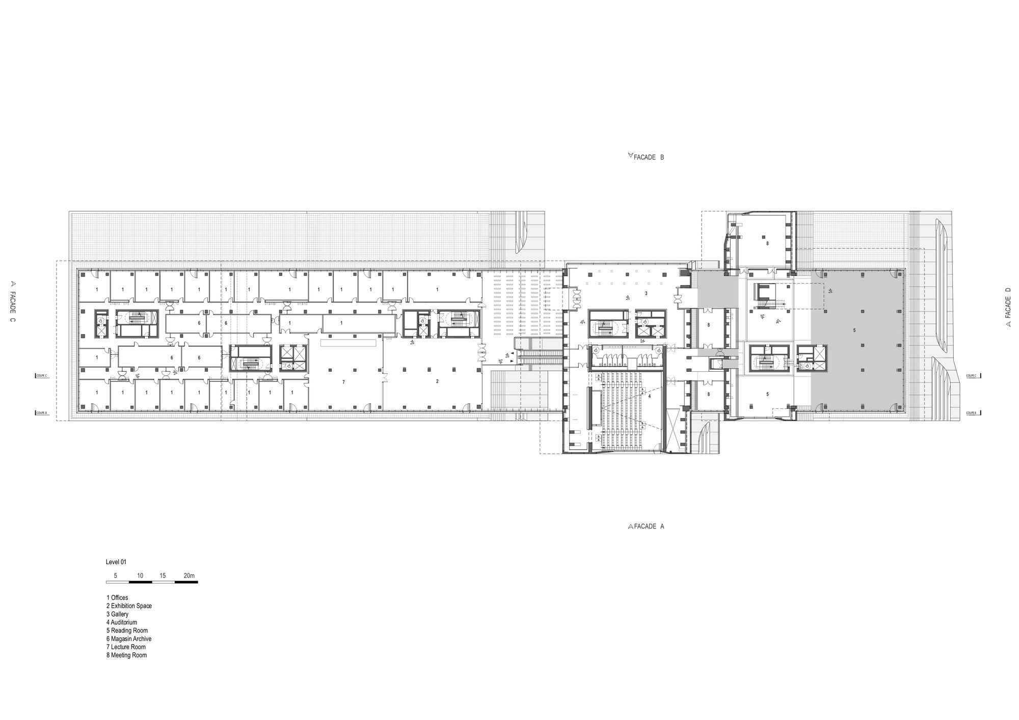 Now moving into the building, at the main entrance, visitors are directed from the lobby to the educational spaces of the archives on the ground level, or via elevators and escalators to the main public artery on level one. This artery is articulated all along the facades as a recessed glass strip and here reading rooms of both archives and library are immediately accessible. These shared facilities are contained inside a curved concrete block, which bursts through the glazing to shelter the main entrance on the ground floor below.