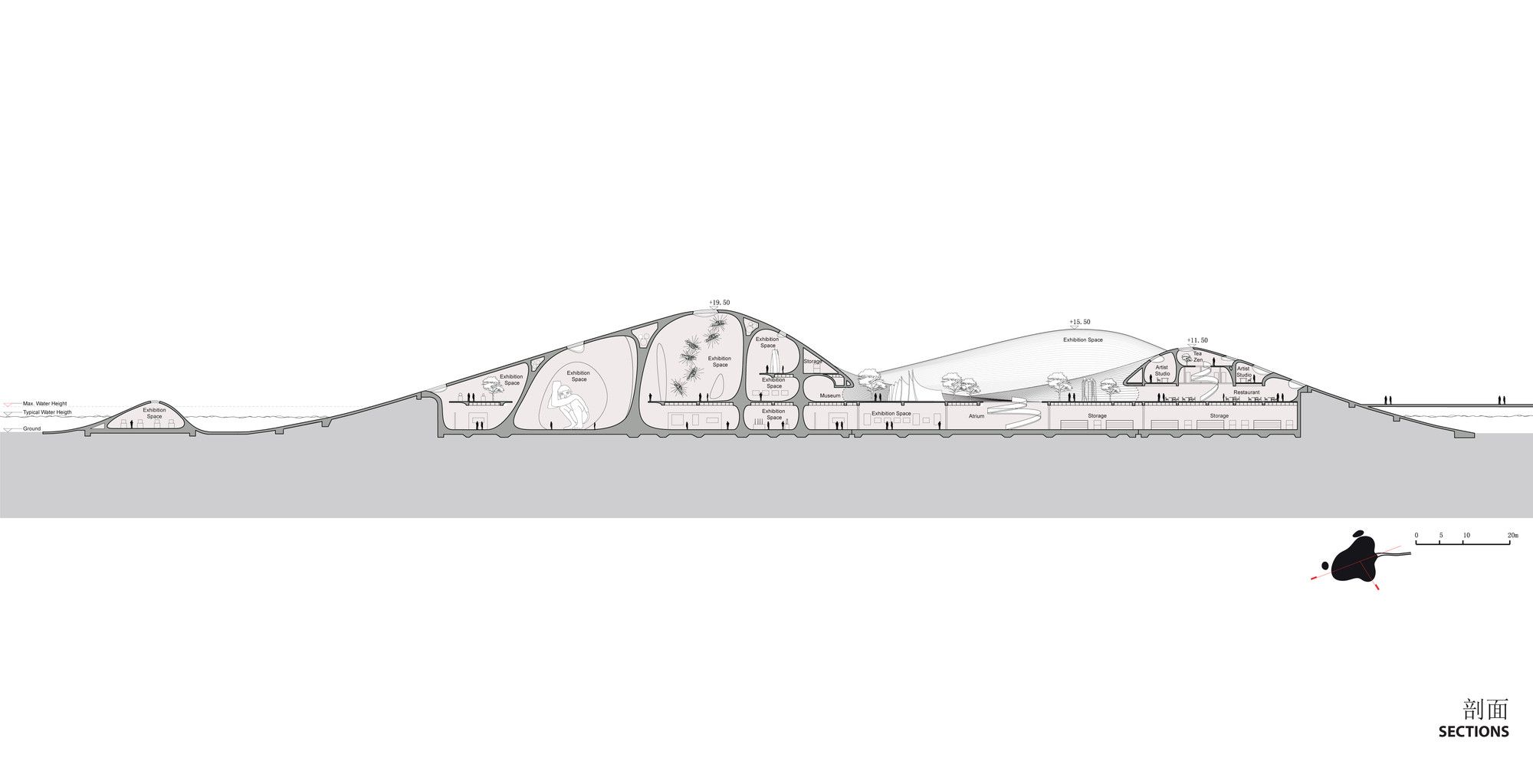 The island is firstly a public space that is then turned into a museum. The sea, the beach, the oasis and the slope all interconnect with each other, forming a harmonious capacious space with the mountains in the distance. The building is constructed with concrete that is blended with local sand shells. The indoor space, formed by the rise and fall of the formal movements, looks similar to ancient caves.Pingtan Art Museum is built in a landscape setting of an urban city. After its completion, it will create a new space for the city and the city’s inhabitants and further inspire them to reflect on the impact made by time and nature.